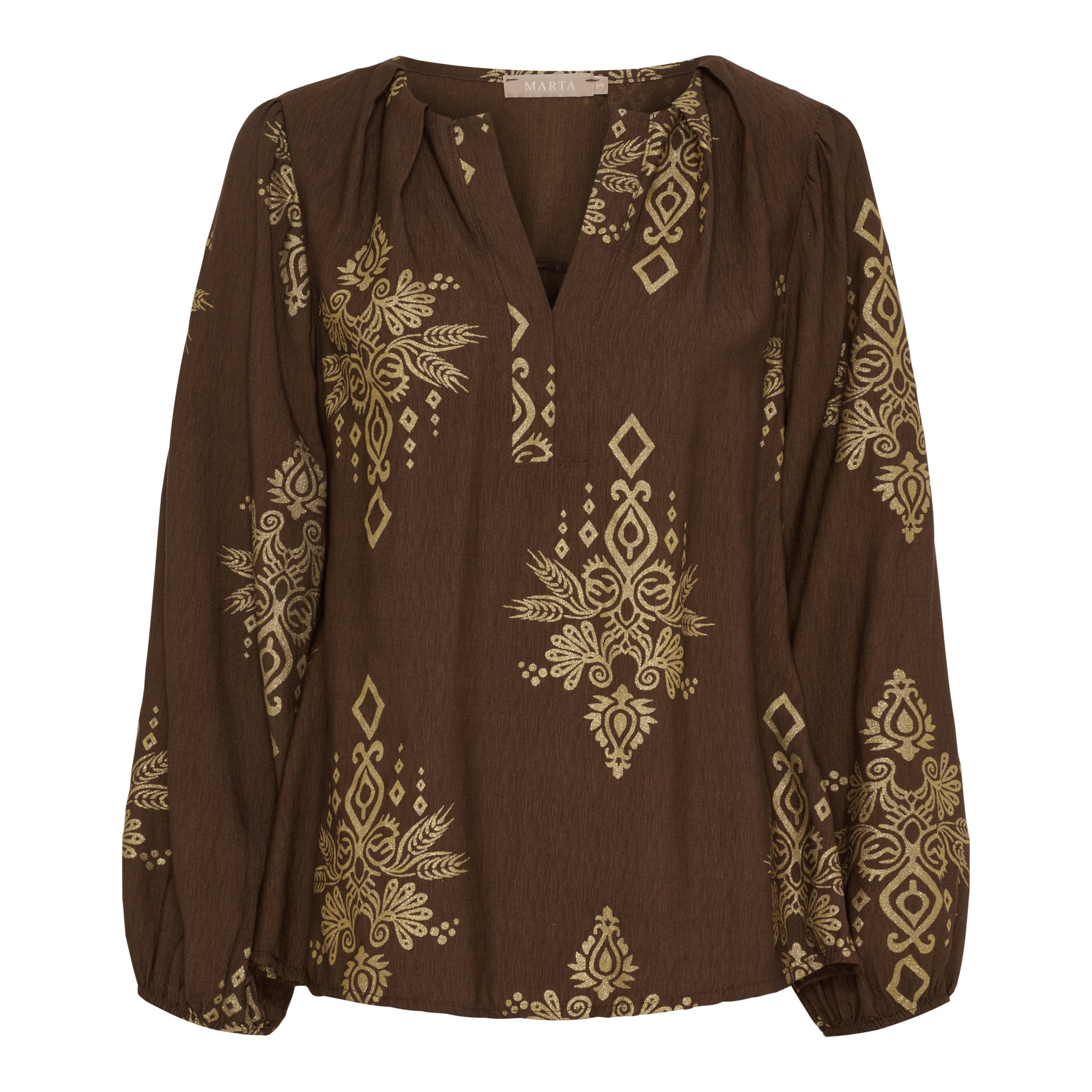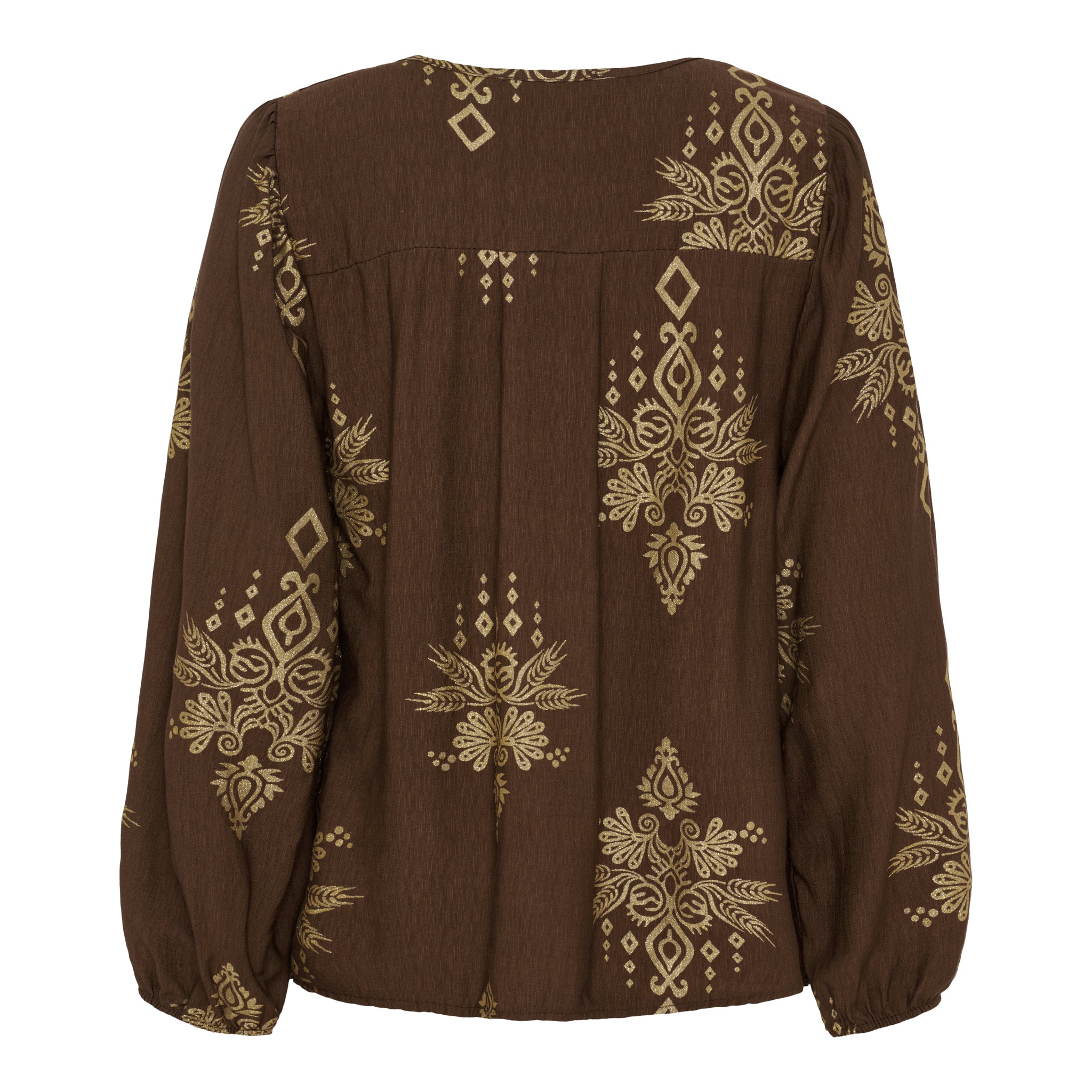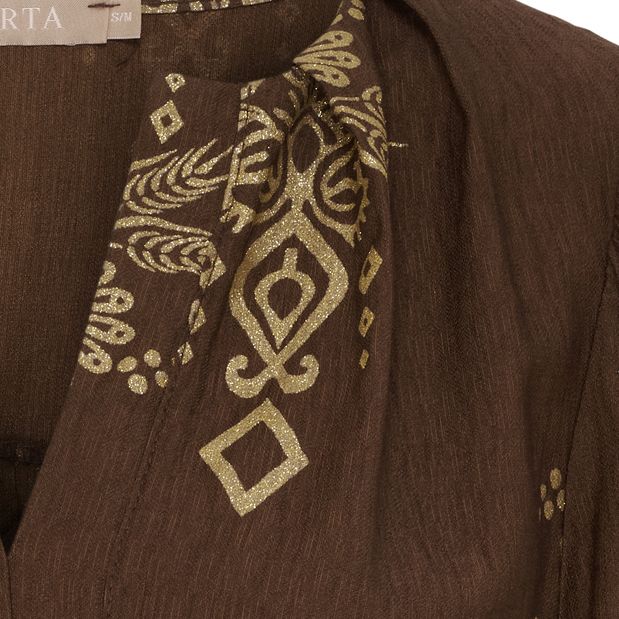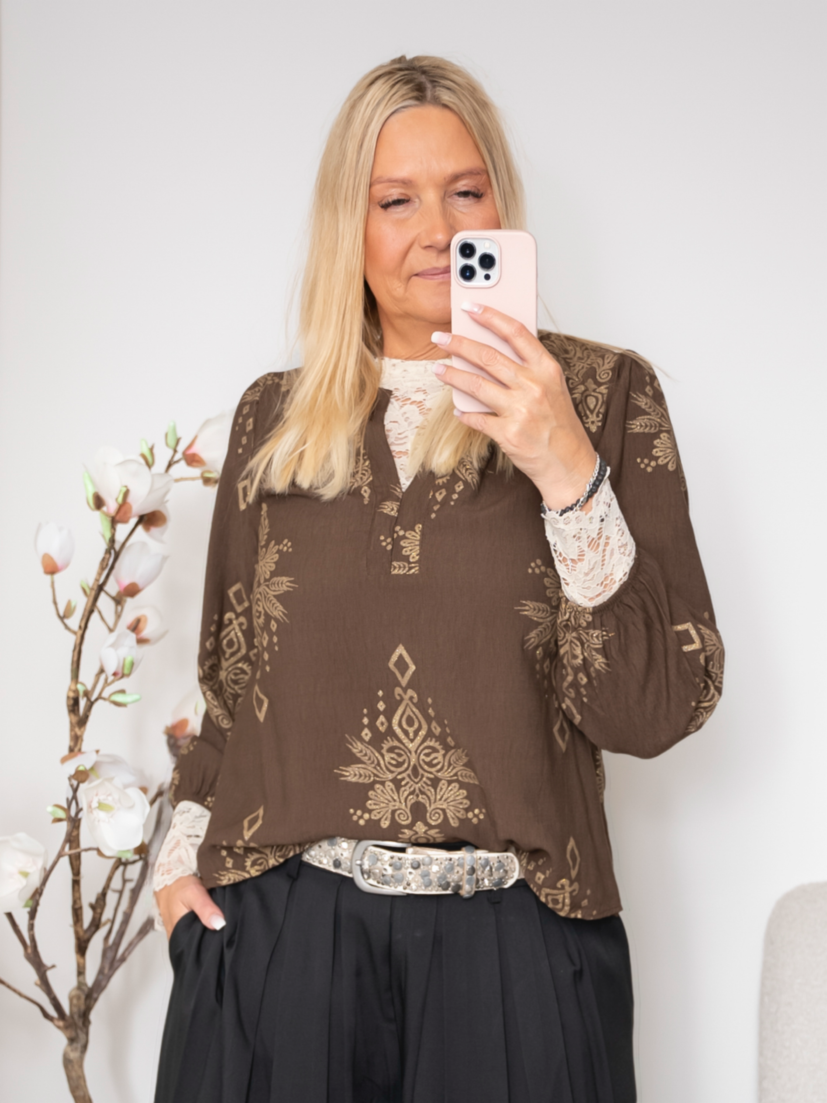 Denne smukke bluse er det oplagte valg til dig, der ønsker et stilfuldt og iøjnefaldende look med masser af personlighed. Det eksklusive print med glimmerdetaljer skaber et unikt udtryk, der kombinerer boheme og elegance på fineste vis.