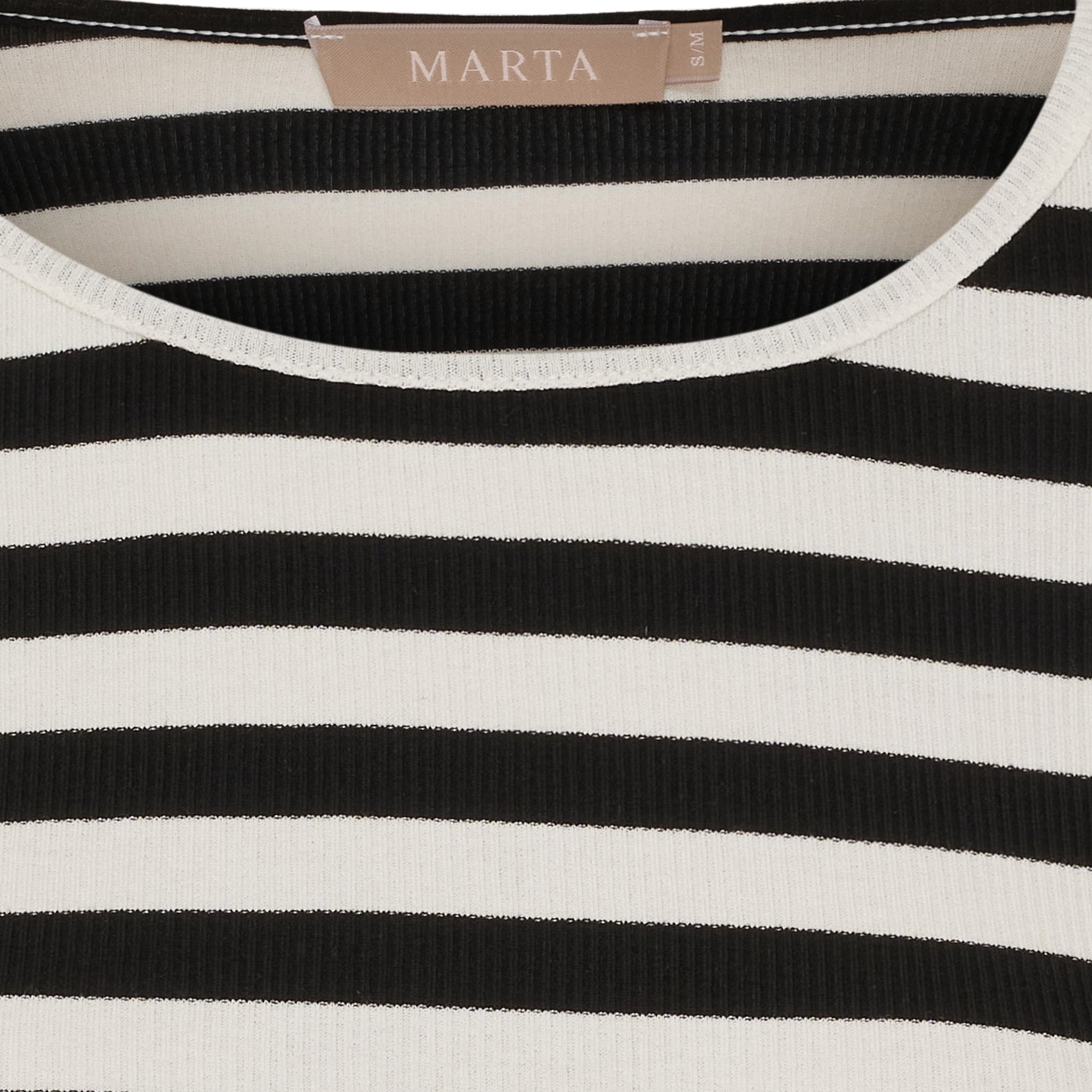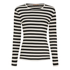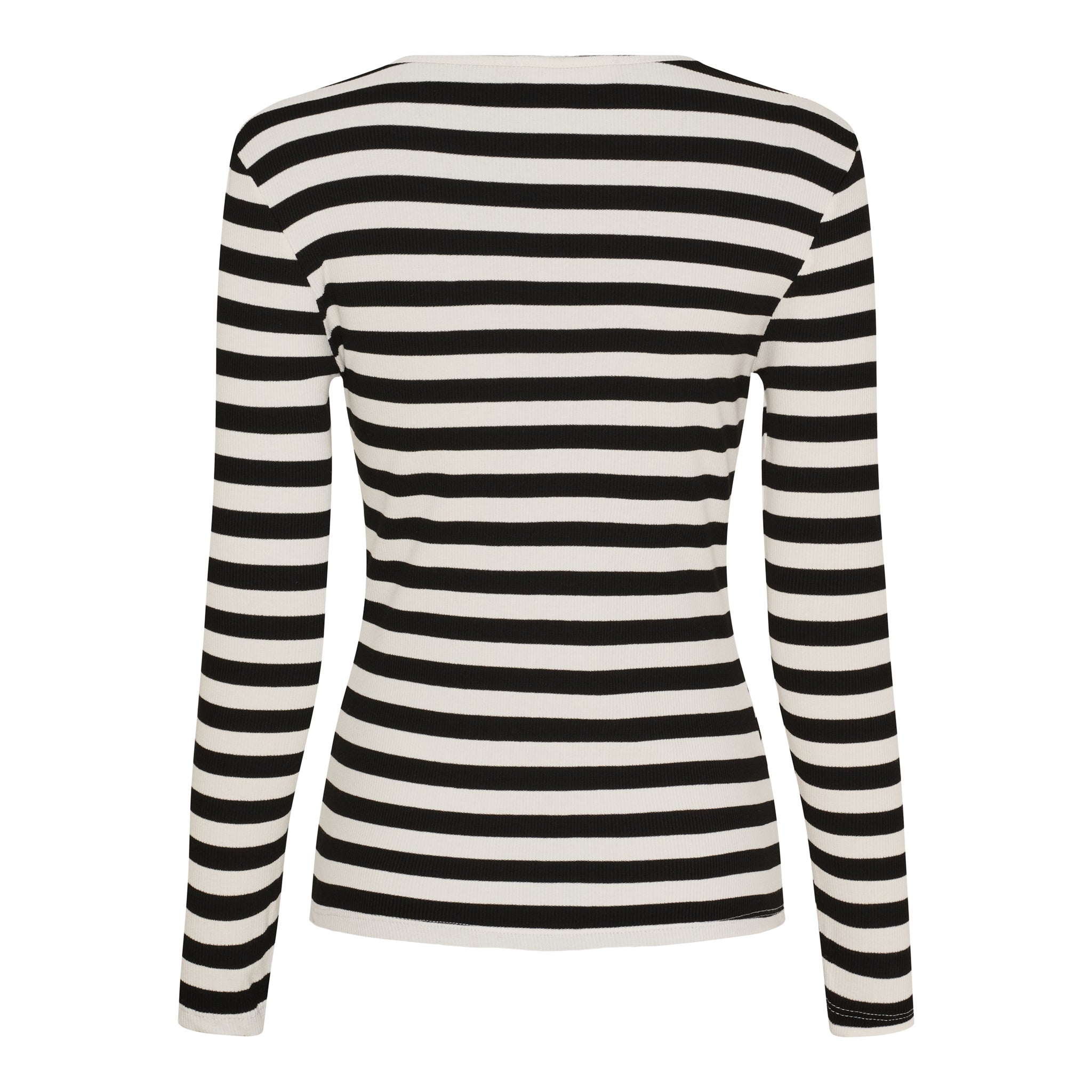 Denne stribede langærmede top er en tidløs klassiker, der passer perfekt ind i enhver basisgarderobe. Den tætsiddende pasform og det stretchy, ribbede materiale giver en flatterende silhuet og høj komfort hele dagen.