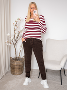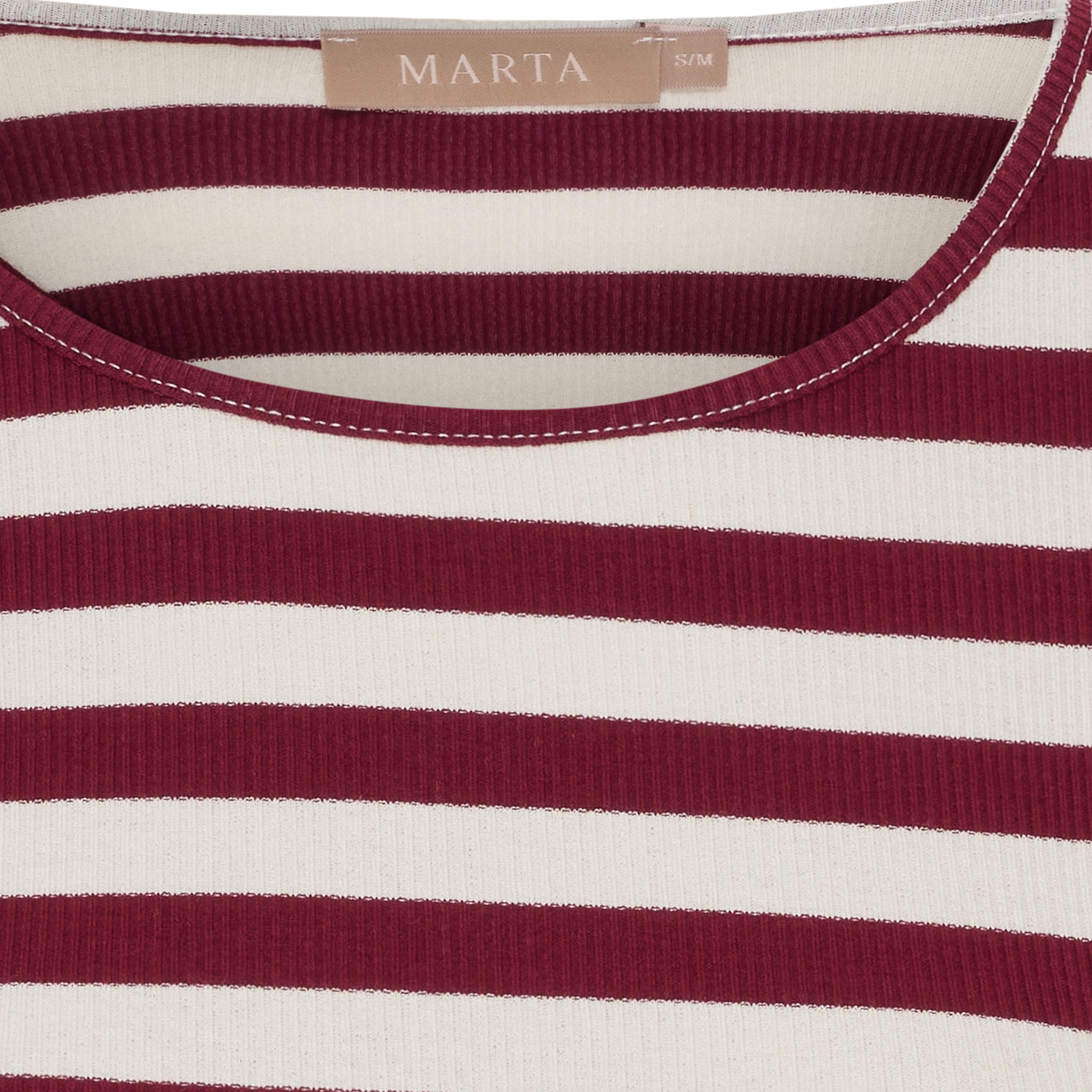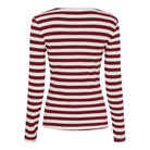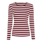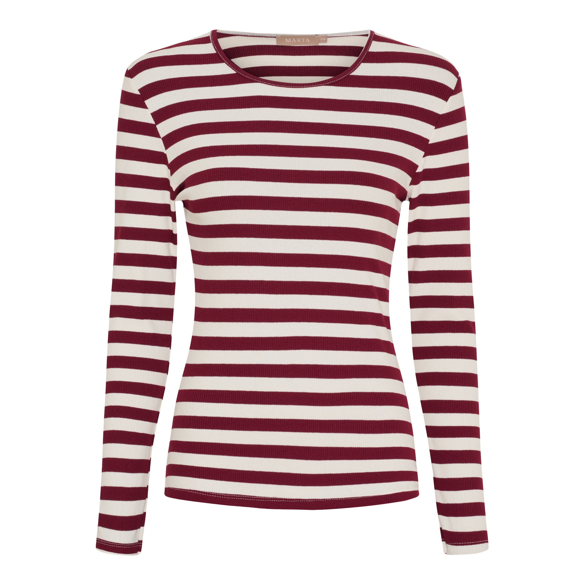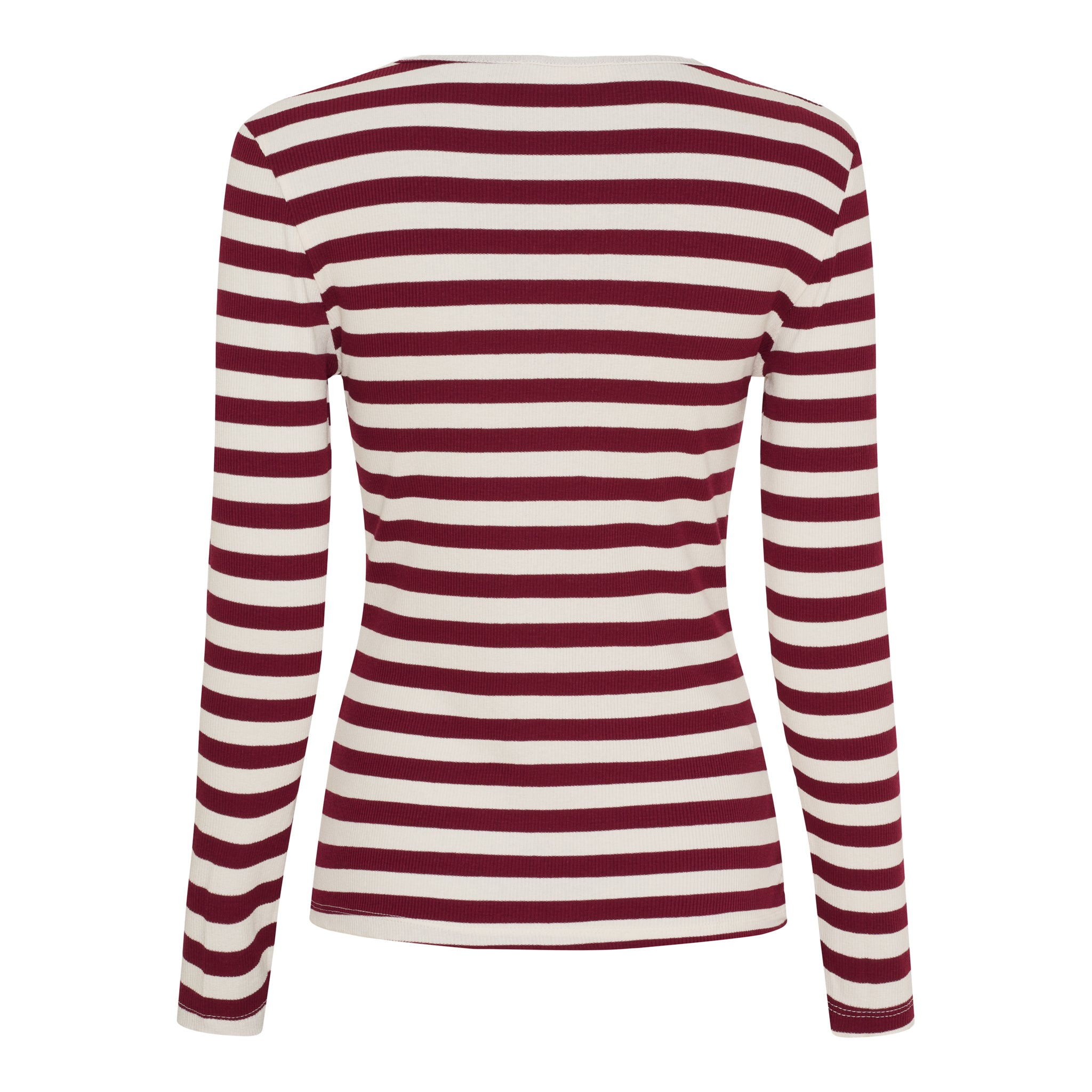 Denne stribede langærmede top er en tidløs klassiker, der passer perfekt ind i enhver basisgarderobe. Den tætsiddende pasform og det stretchy, ribbede materiale giver en flatterende silhuet og høj komfort hele dagen.