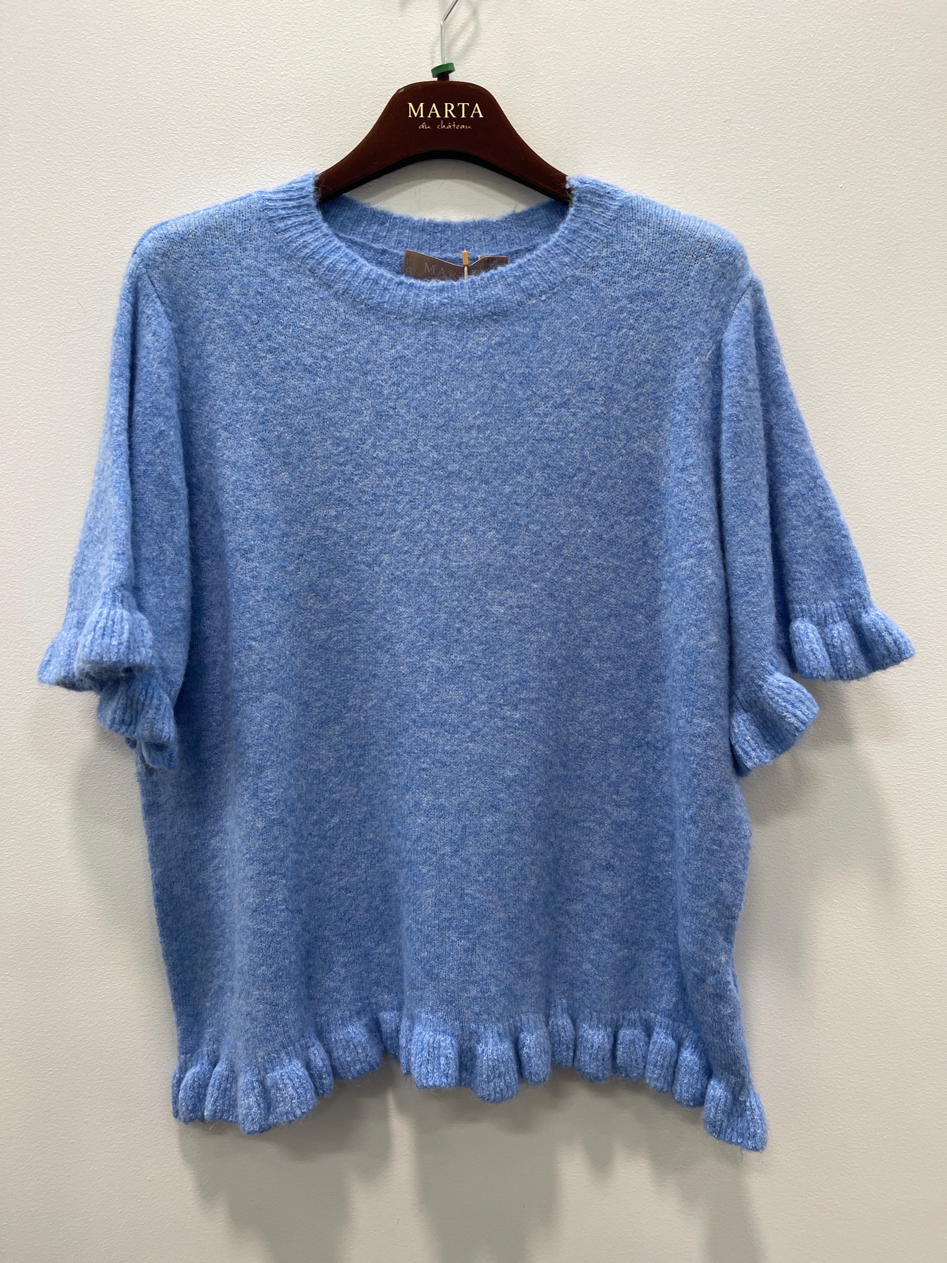 Blusen er strikket i en let og lun kvalitet, der føles behagelig mod huden og falder flot. De korte ærmer med diskrete flæser samt flæsekanten forneden tilfører et feminint og moderne præg, mens den runde halsudskæring holder udtrykket enkelt og tidløst.