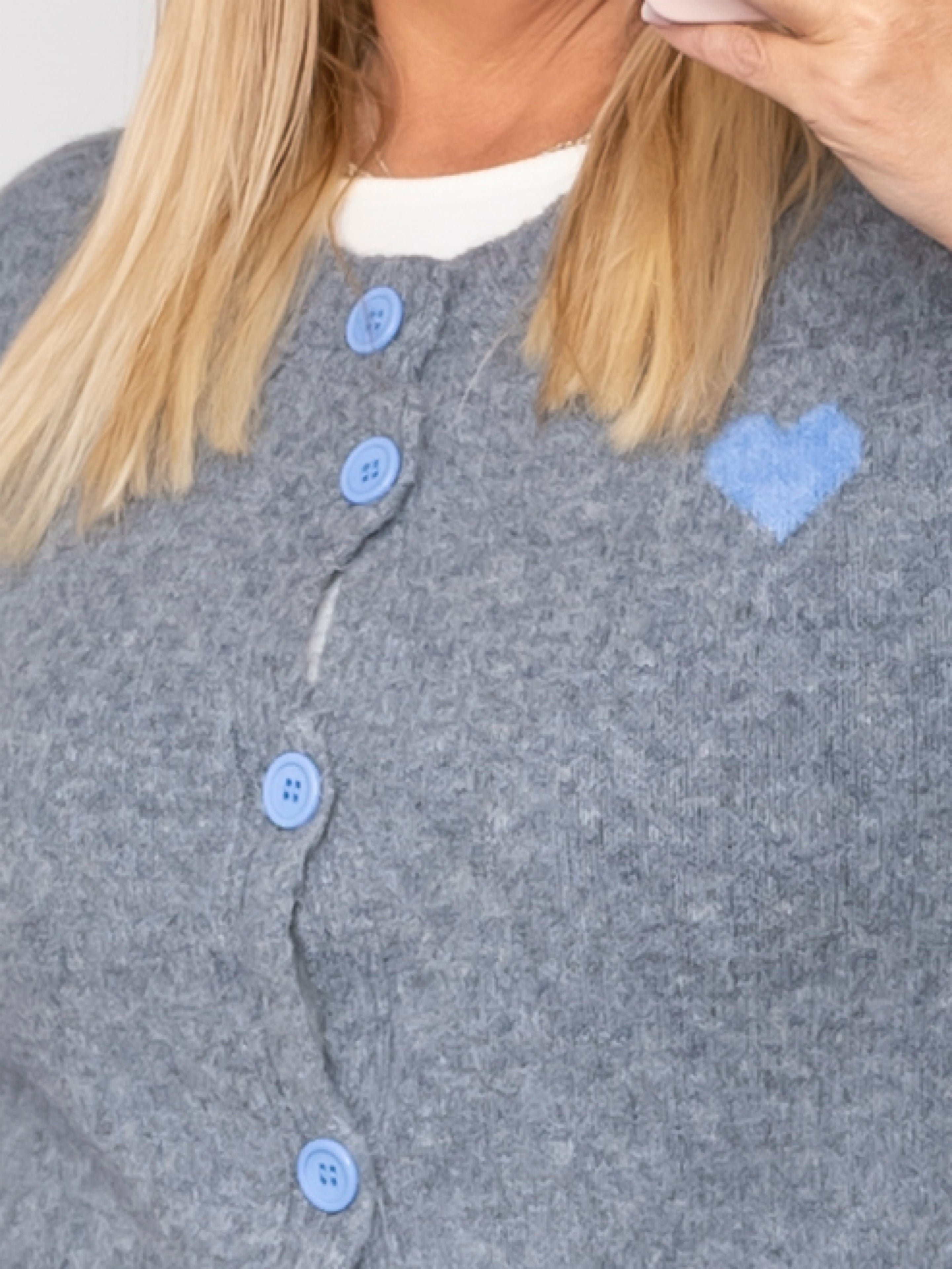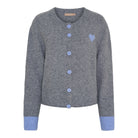 Cardiganen har rund hals, gennemgående knaplukning og ribkanter, der afslutter designet på elegant vis. Det lille hjertebroderi på brystet skaber en sød kontrast til det enkle snit og gør modellen ideel til både hverdagsbrug og afslappede anledninger.
