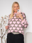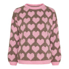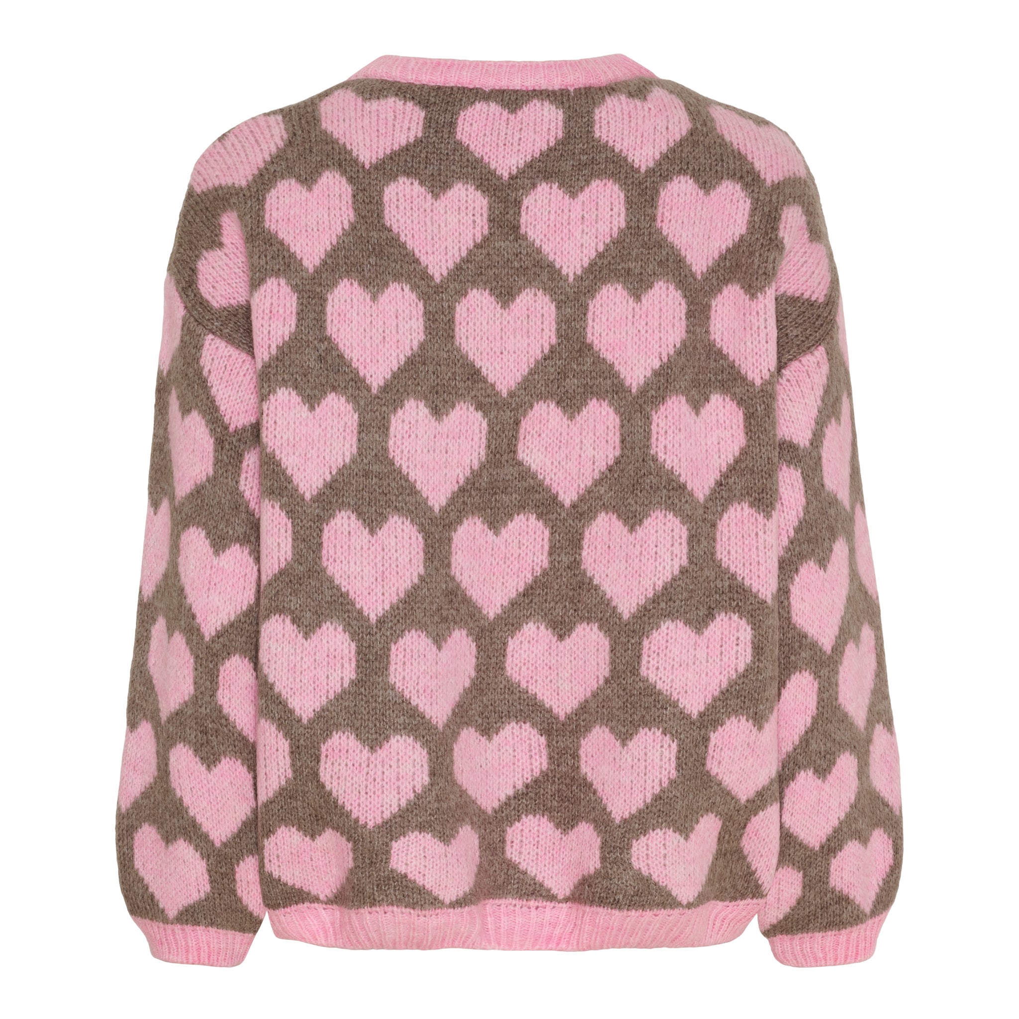 Denne strik blander blød komfort med et legende og varmt udtryk. Det all-over hjertemønster giver designet et romantisk twist, mens de afdæmpede farver sikrer et harmonisk og stilrent look. Den bløde, vamset strikkede kvalitet gør den perfekt til kølige dage, hvor man ønsker noget, der føles både hyggeligt og feminint.