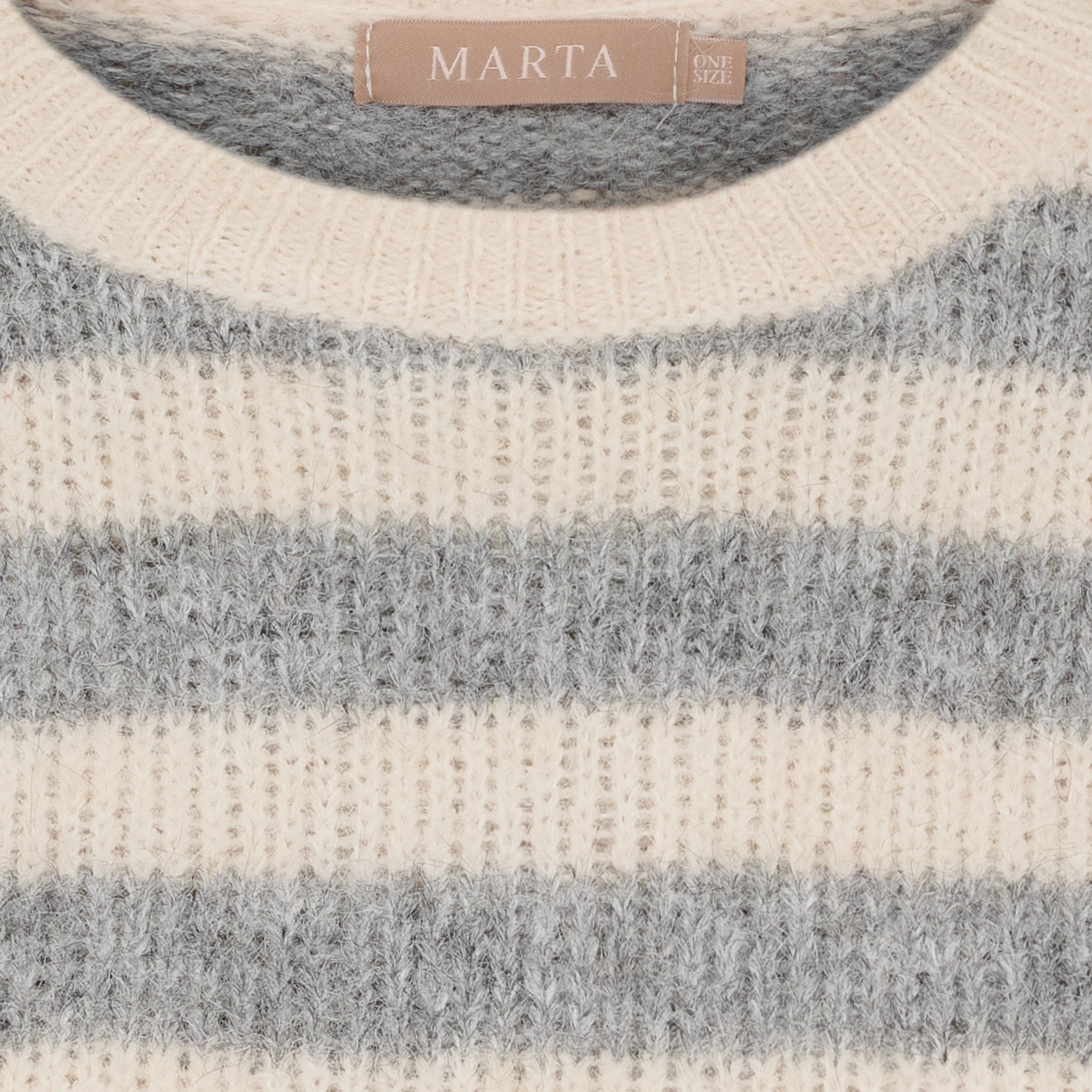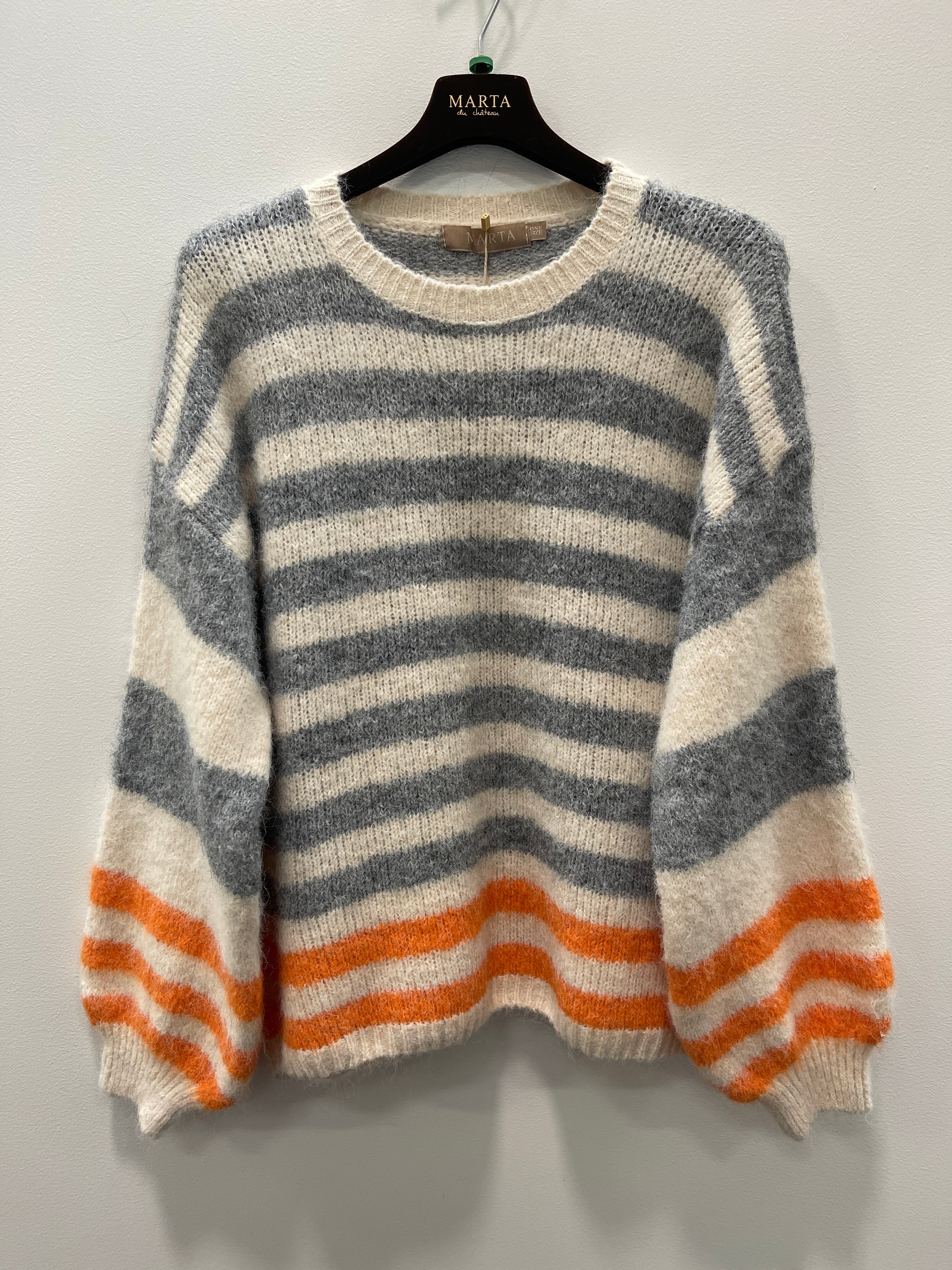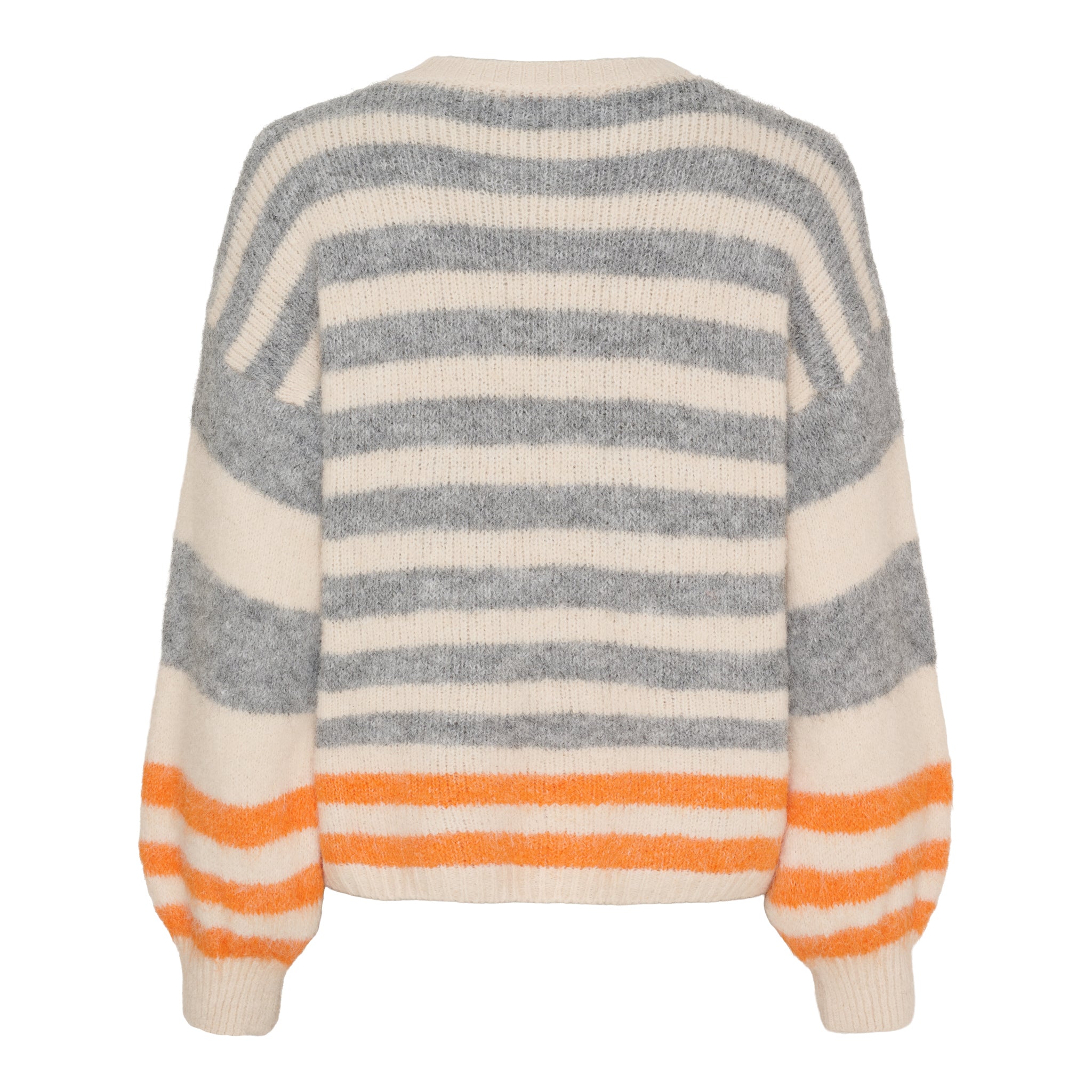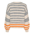 Denne striktrøje er en skøn kombination af komfort og grafisk spil. De brede, vandrette striber skaber et moderne og afslappet udtryk, mens kontrastfarverne ved bunden og ærmerne tilfører en energisk og iøjnefaldende detalje, der løfter looket.