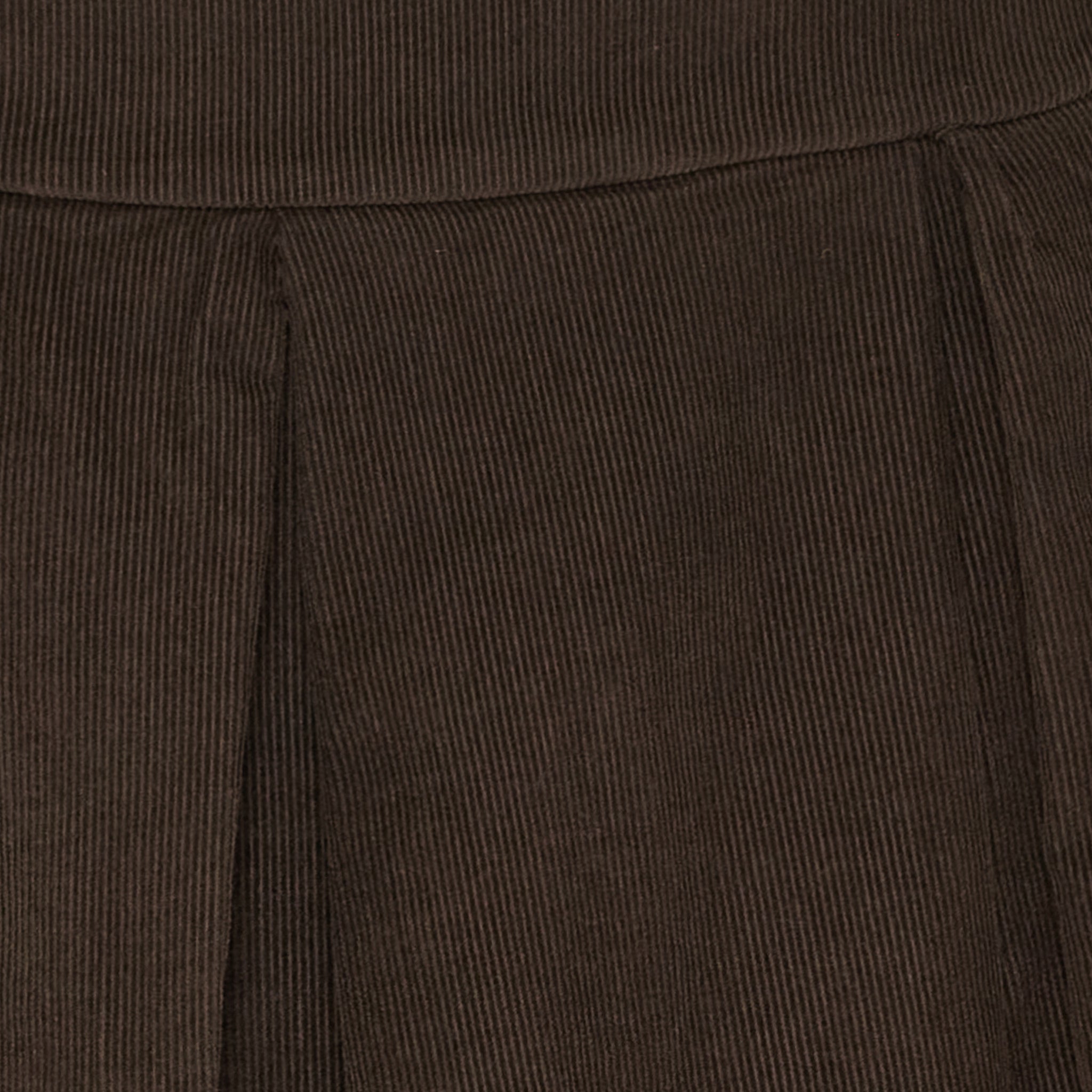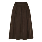 Denne elegante nederdel forener klassisk charme med moderne komfort. Det bløde babyfløjl materiale giver en varm og luksuriøs fornemmelse, perfekt til efterår og vinter. De markante læg foran skaber en smuk, svajende silhuet, der både giver fylde og bevægelsesfrihed.