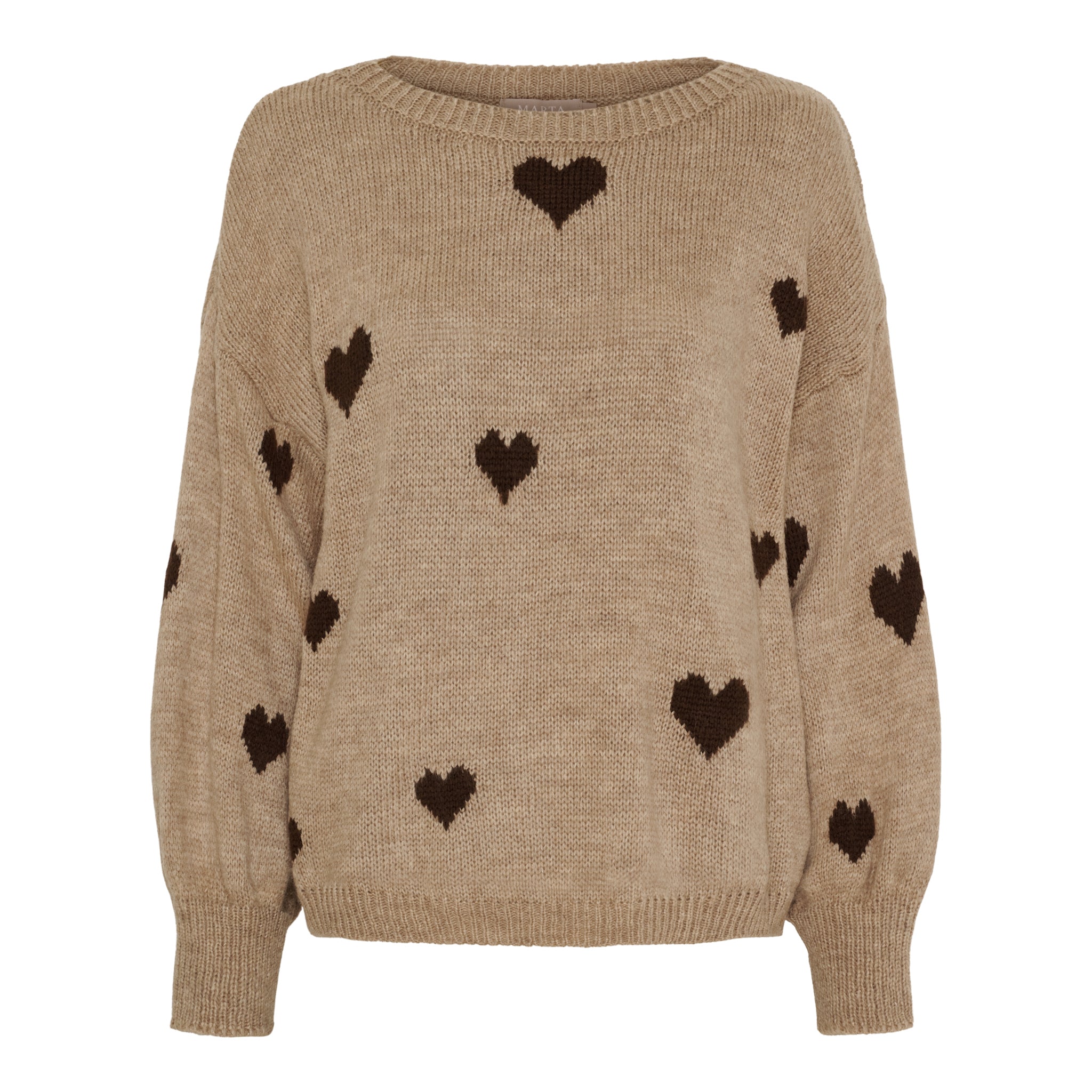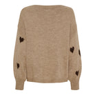 Denne søde striktrøje bringer både varme og personlighed ind i din garderobe. Den er designet med et blødt strikmønster og dekoreret med fine, kontrastfarvede hjerter, der tilfører et feminint og legende udtryk. En oplagt favorit til afslappede dage og hyggelige stunder.