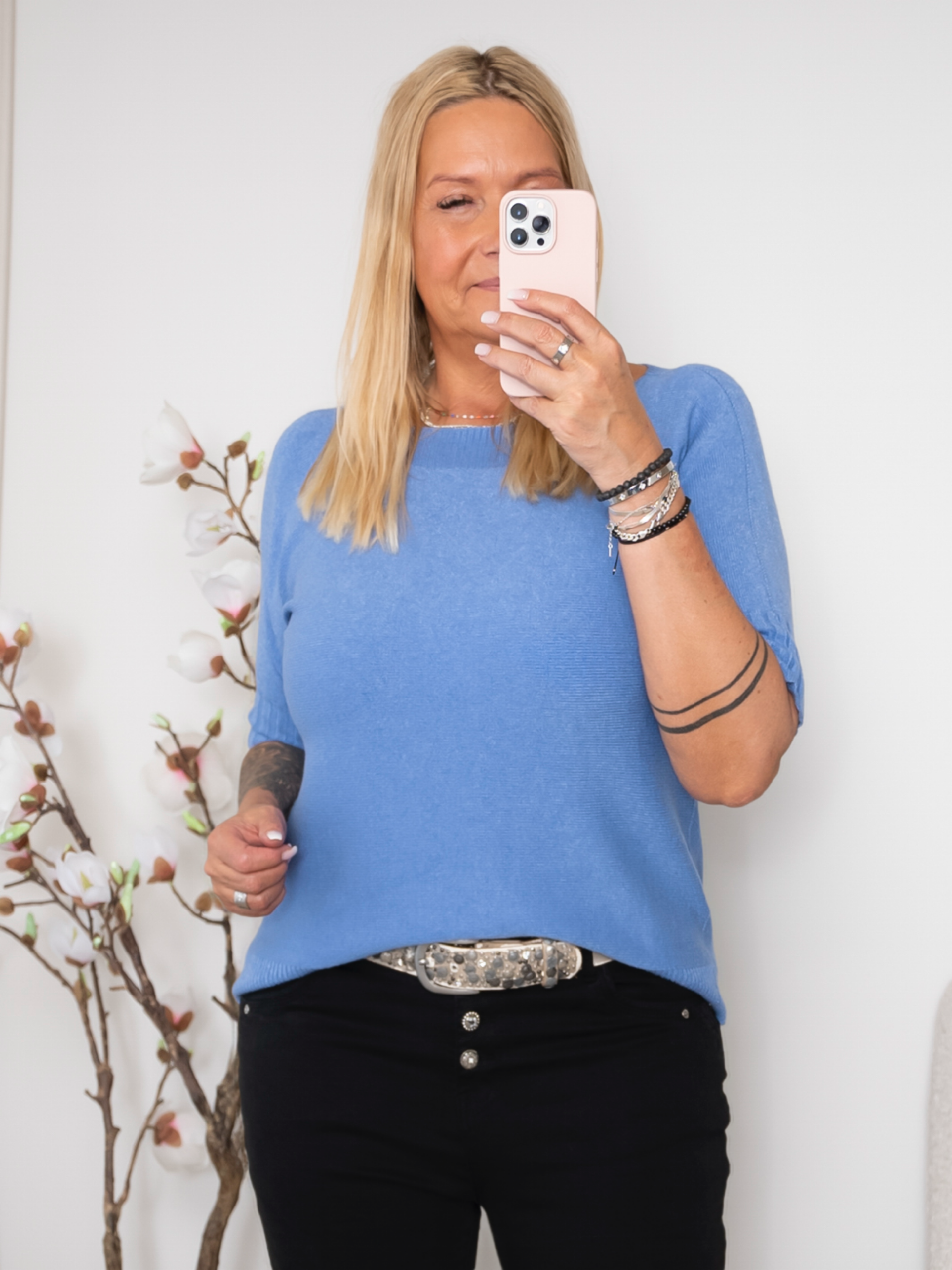 Denne bløde strikbluse er et skønt og feminint valg, der kombinerer komfort og stil på fineste vis. Den bløde, strikkede kvalitet føles behagelig mod huden, mens det enkle design gør den nem at style til både hverdag og hyggelige stunder.