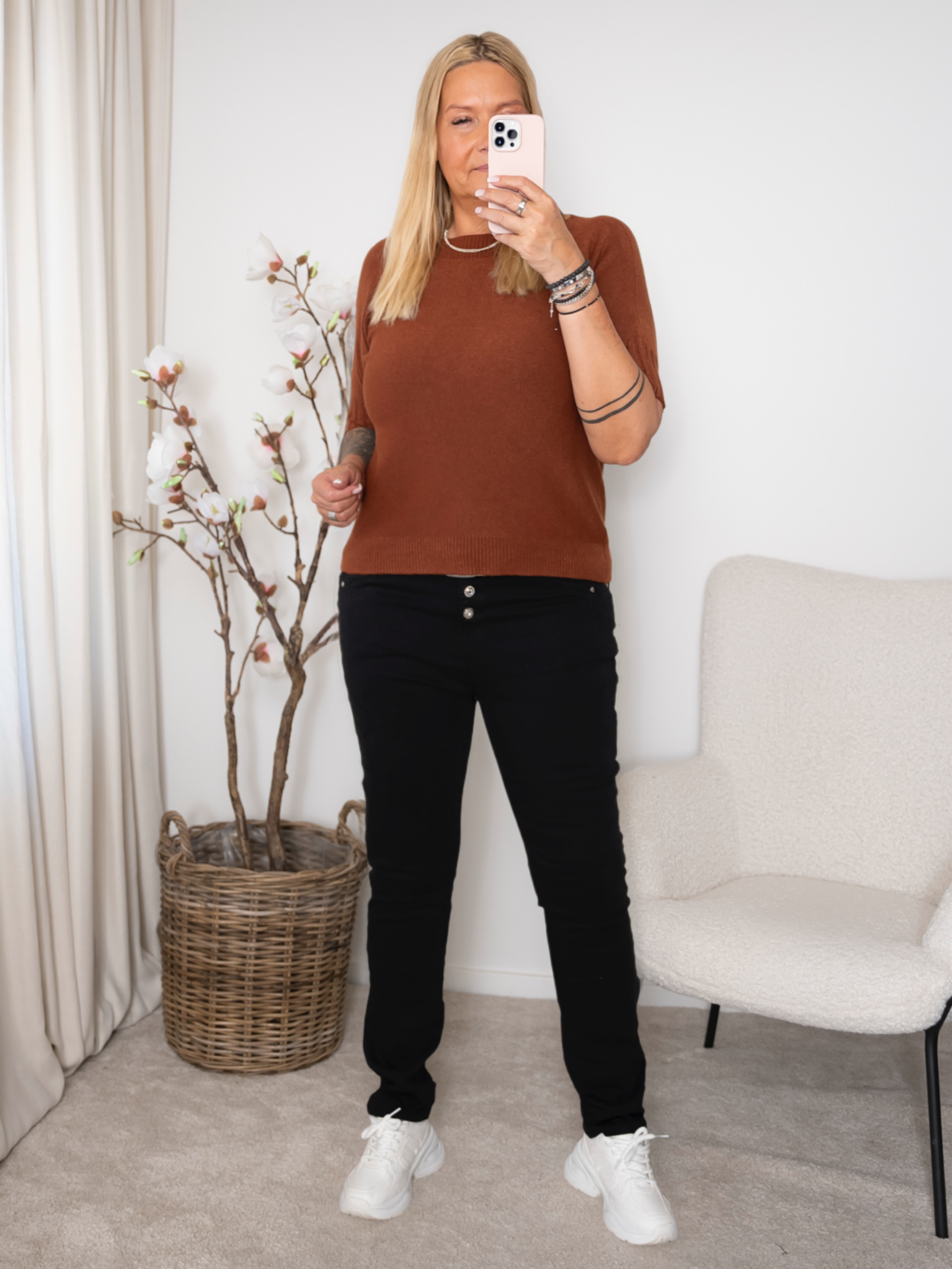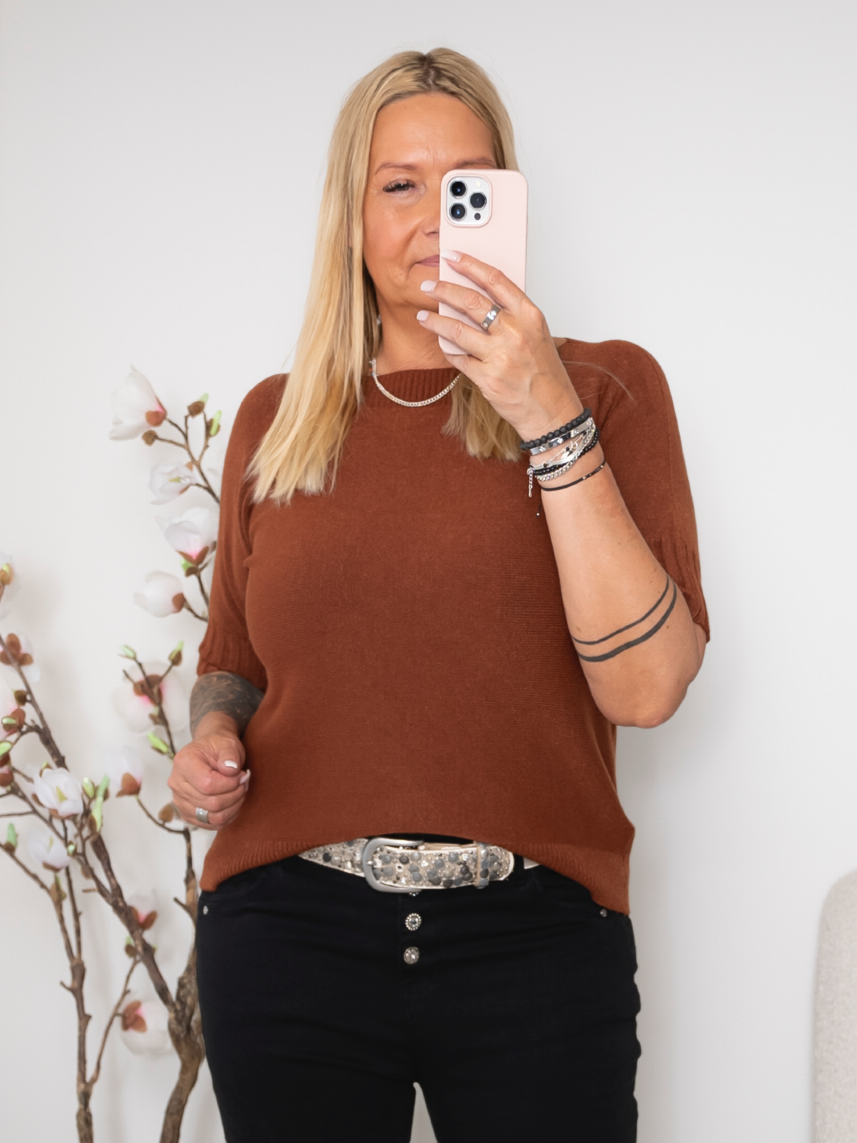 Denne bløde strikbluse er et skønt og feminint valg, der kombinerer komfort og stil på fineste vis. Den bløde, strikkede kvalitet føles behagelig mod huden, mens det enkle design gør den nem at style til både hverdag og hyggelige stunder.