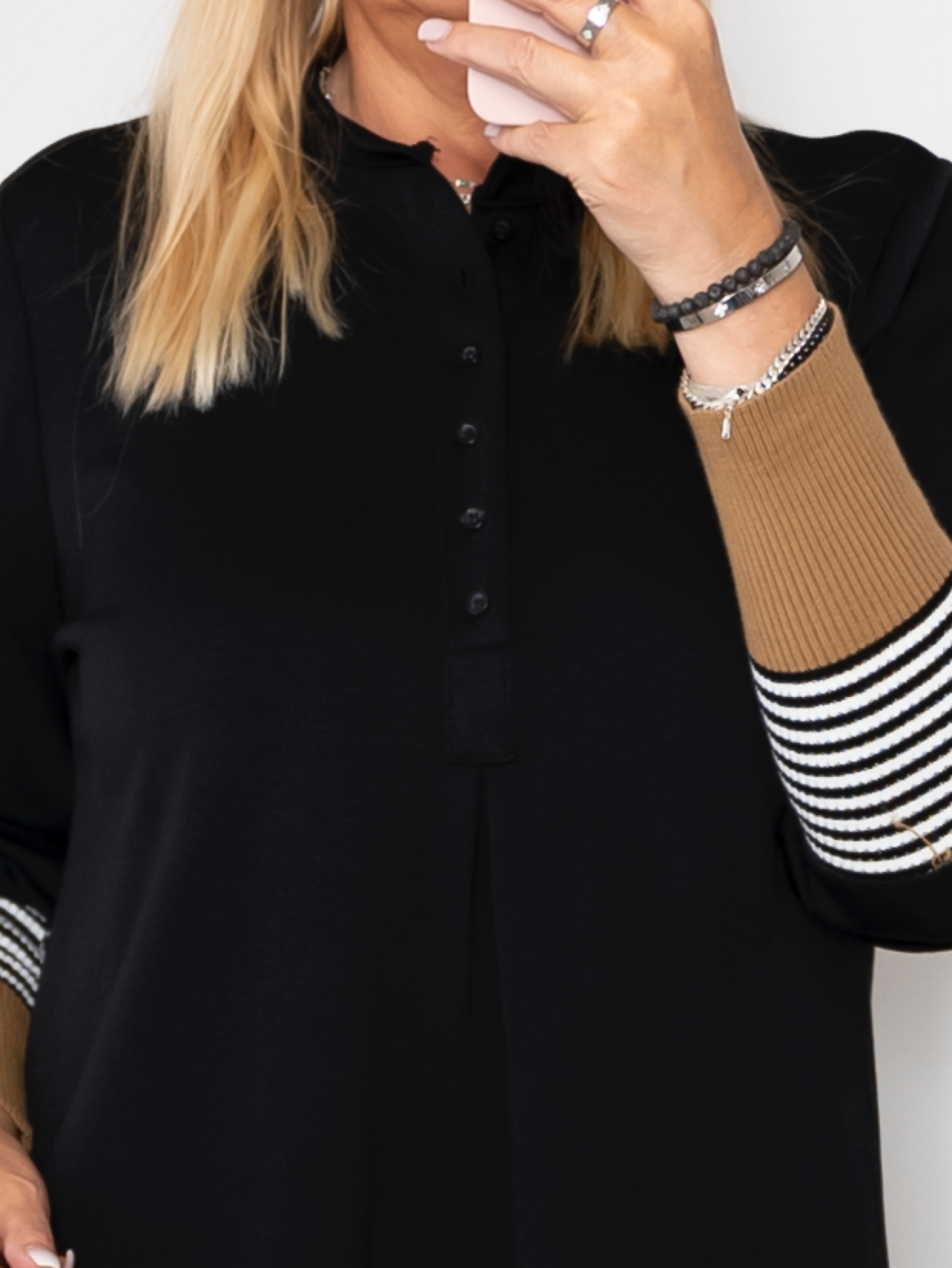 Denne unikke kjole kombinerer et klassisk design med sporty elementer for et moderne og stilfuldt udtryk. Den løse pasform sikrer komfort og bevægelsesfrihed, mens de kontrastfyldte ribærmer med striber tilføjer kant og gør kjolen perfekt til en afslappet, men trendy stil.