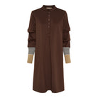 De dekorative knapper foran og den høje krave giver kjolen et elegant touch, der gør den alsidig til både hverdagsbrug og særlige lejligheder. Style den med sneakers for et casual look eller med støvler for en mere poleret stil.