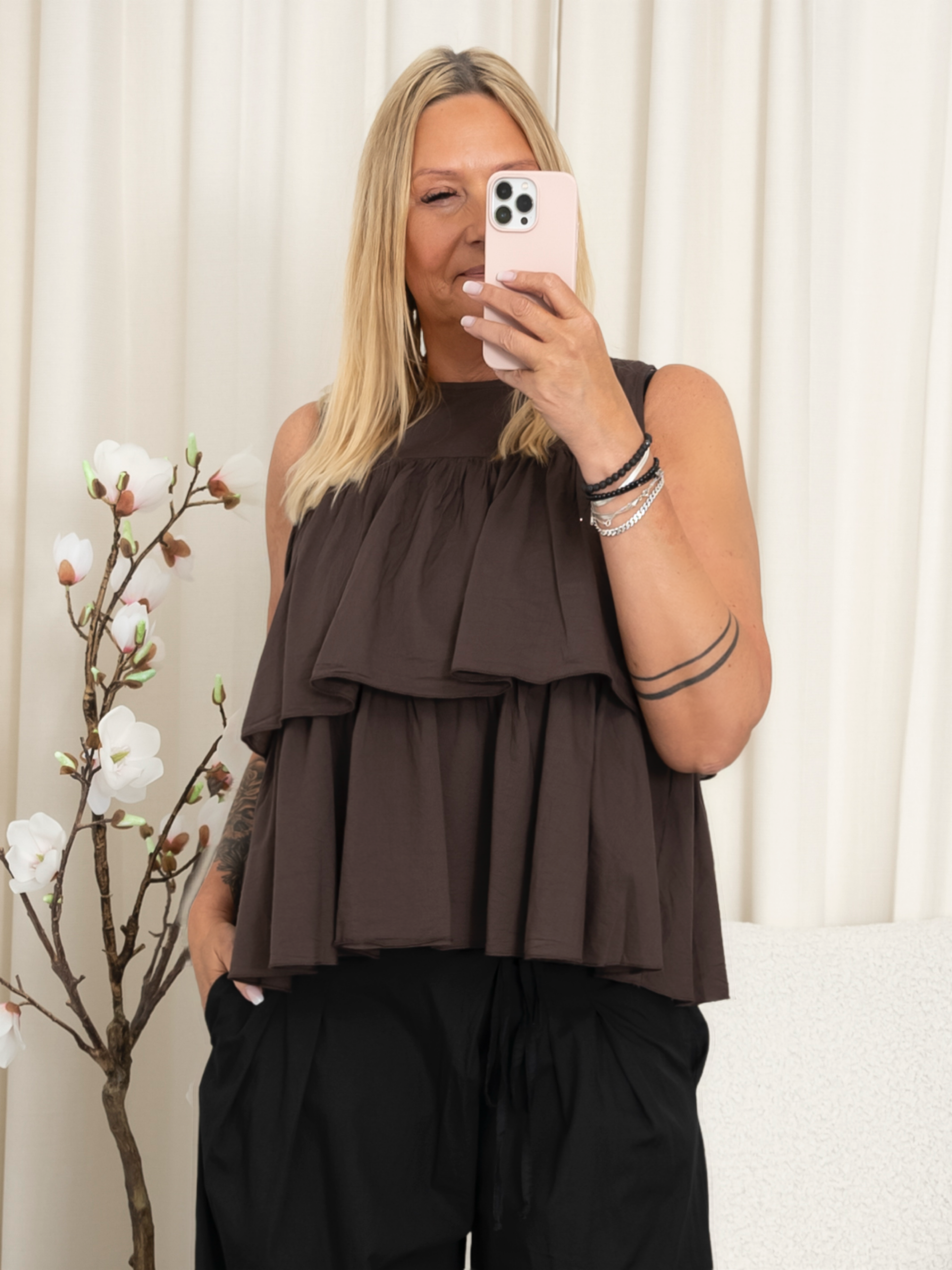 Denne smukke top er skabt til dig, der elsker et feminint udtryk med et strejf af boheme. Det lagdelte design giver et flot fald og masser af bevægelse, mens den ærmeløse pasform gør den både let og behagelig at have på – perfekt til lune dage.