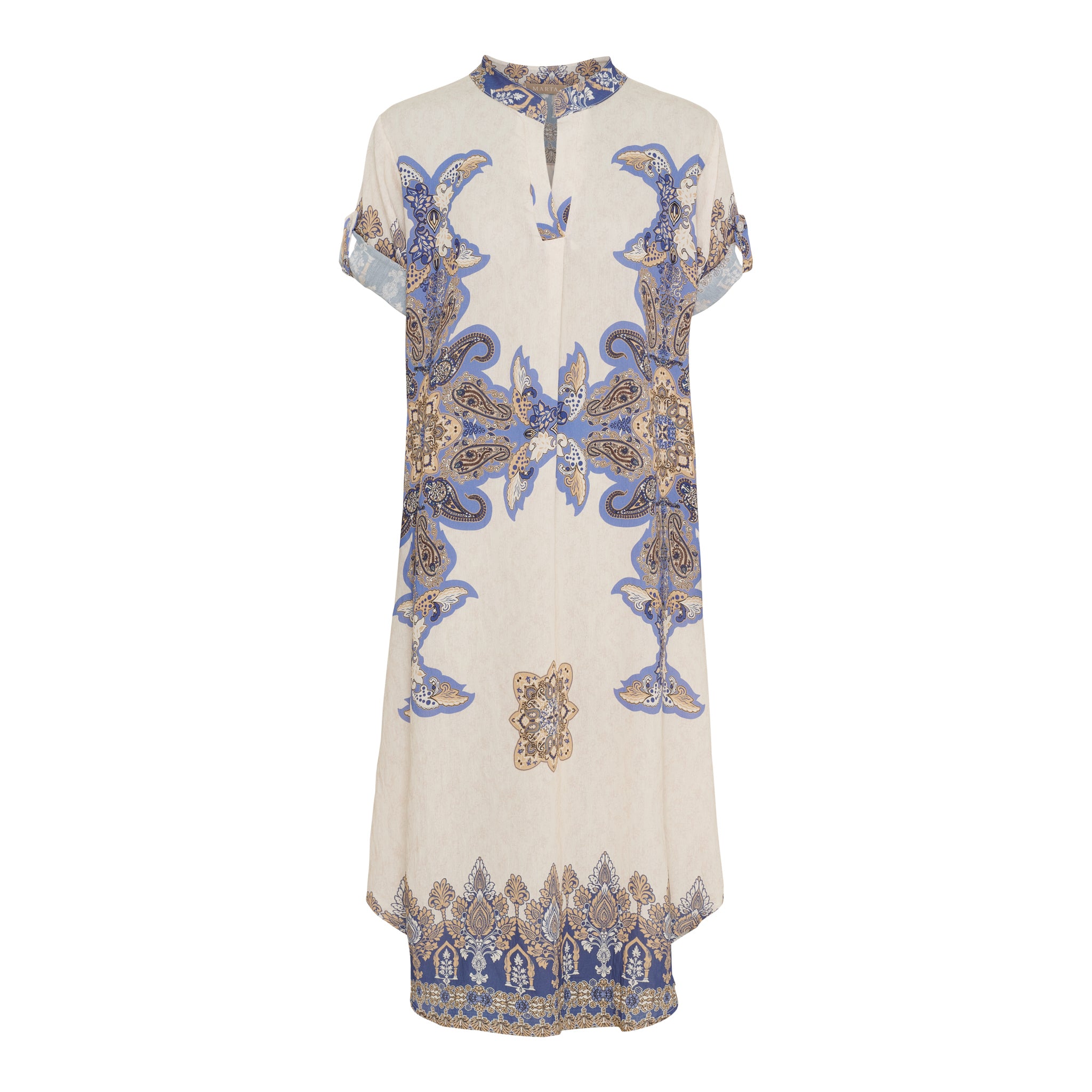 Denne kjole er indbegrebet af lethed og elegance. Med sit iøjnefaldende orientalske print og klassiske snit er den perfekt til sommerdage, hvor stil og komfort skal gå hånd i hånd.