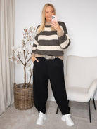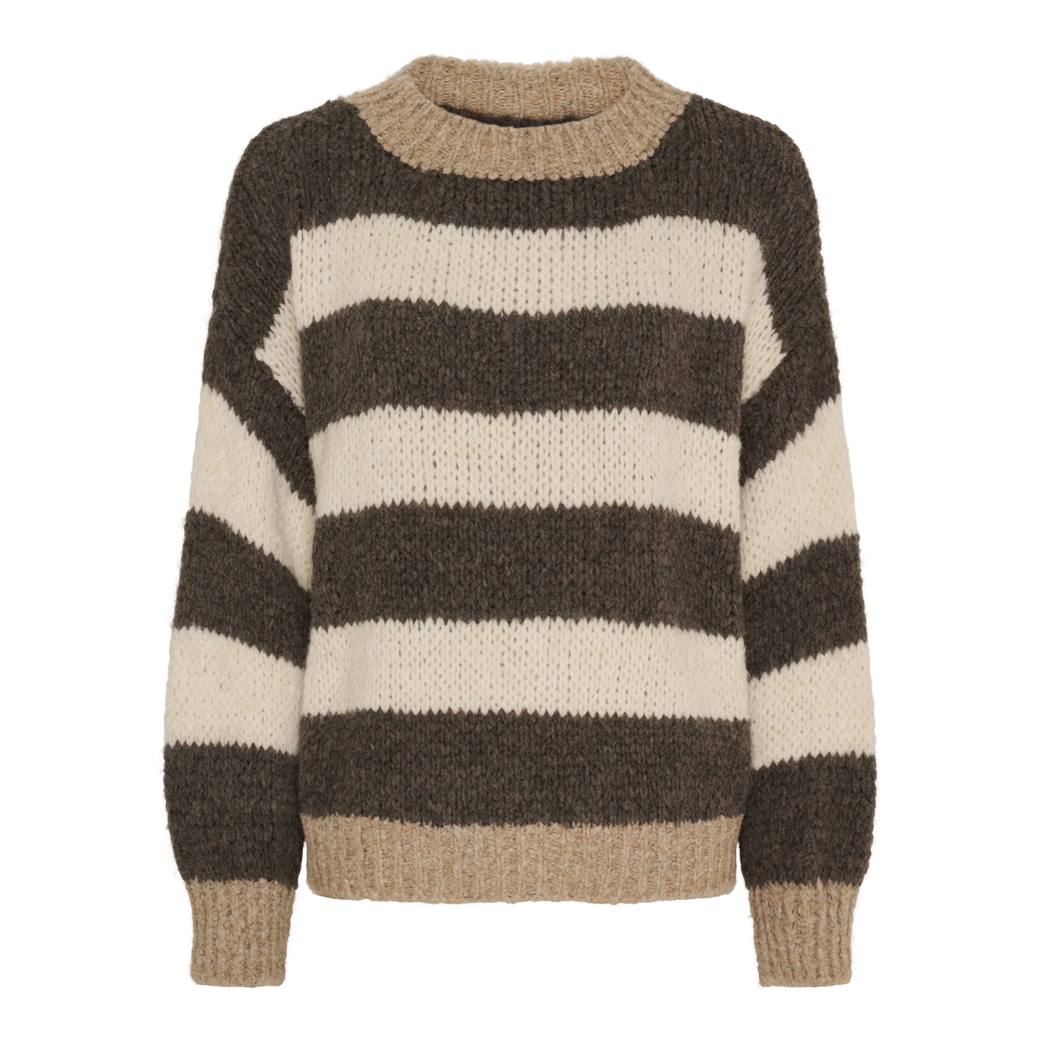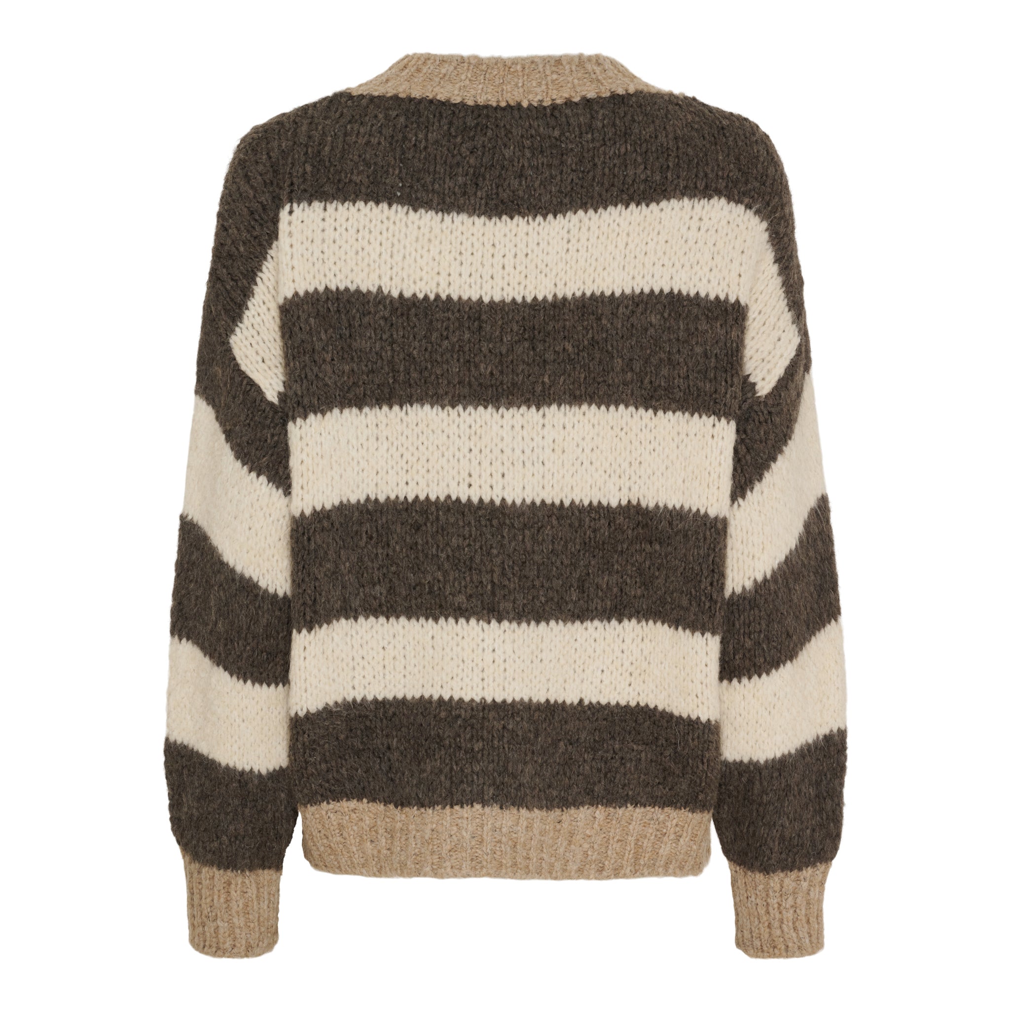 Denne strik forener et klassisk udtryk med en afslappet, hyggelig komfort. De brede, horisontale striber giver designet et tidløst og harmonisk look, mens den chunky strikkede kvalitet tilfører varme og struktur.