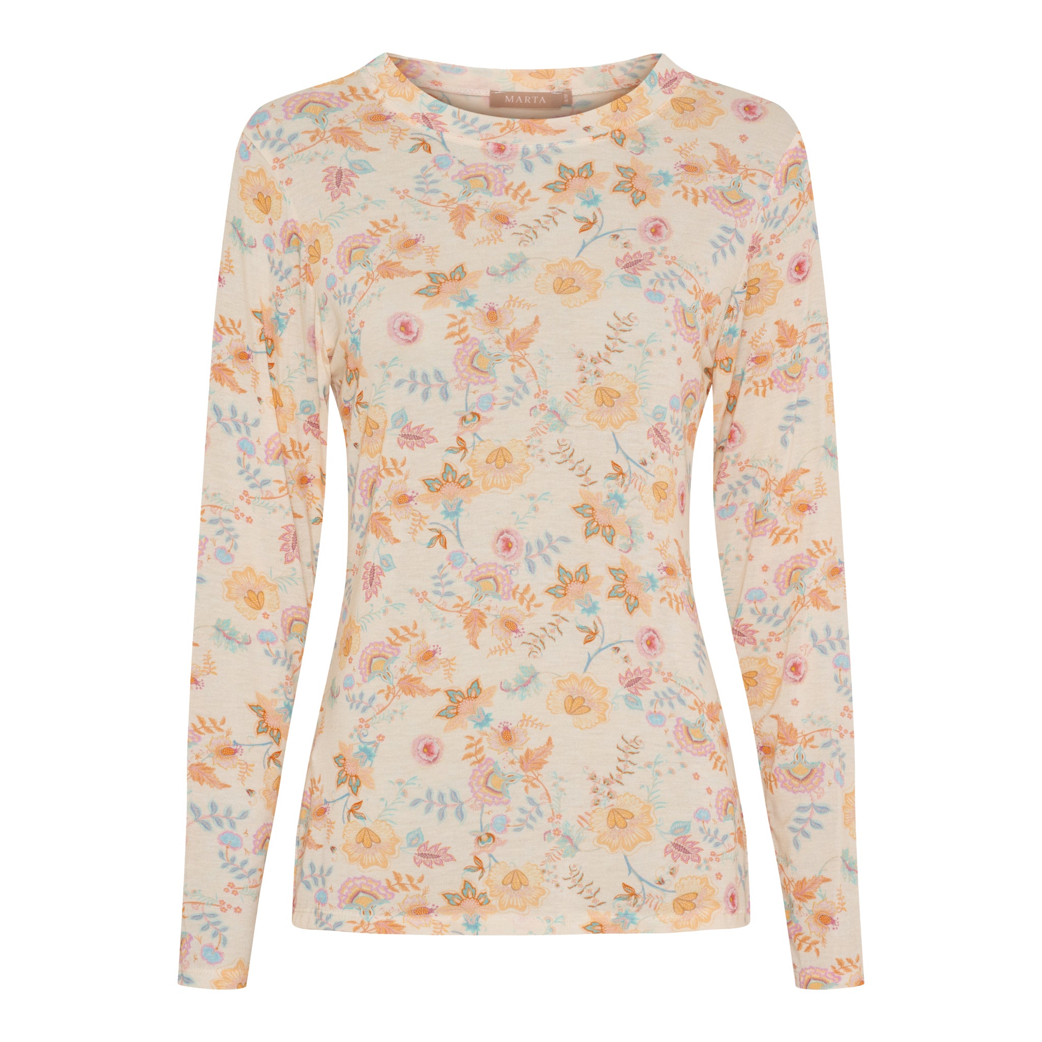 Denne bluse har et let og feminint udtryk med et smukt print, der giver et blødt og fint look. De varme nuancer skaber et levende, men stadig elegant udtryk, som passer perfekt til både hverdag og mere afslappede anledninger.