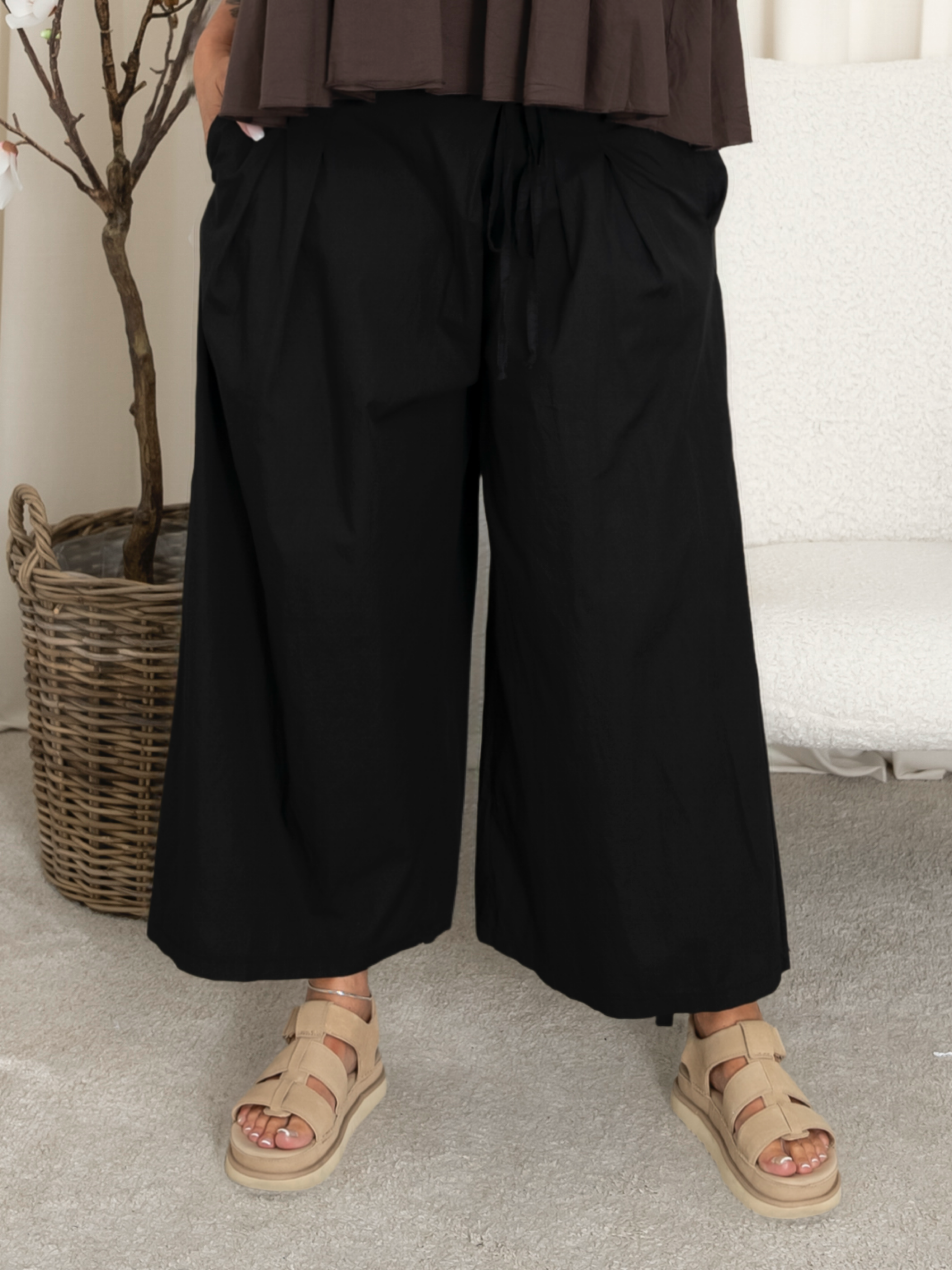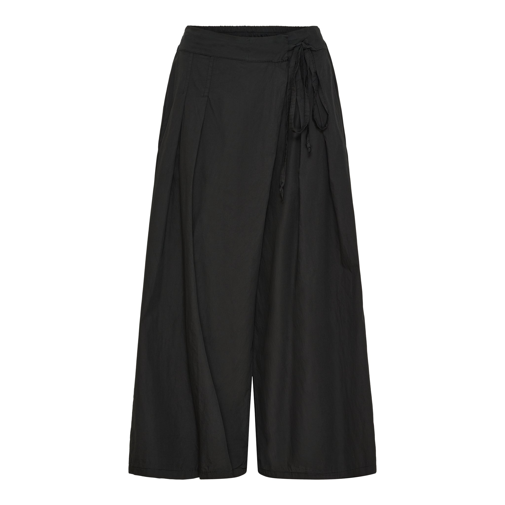 Disse vidde bukser kombinerer det bedste fra både stil og komfort. Med deres luftige snit, cropped længde og smukke slå-om effekt foran, får du en moderne og afslappet silhuet, der emmer af sommerstemning.