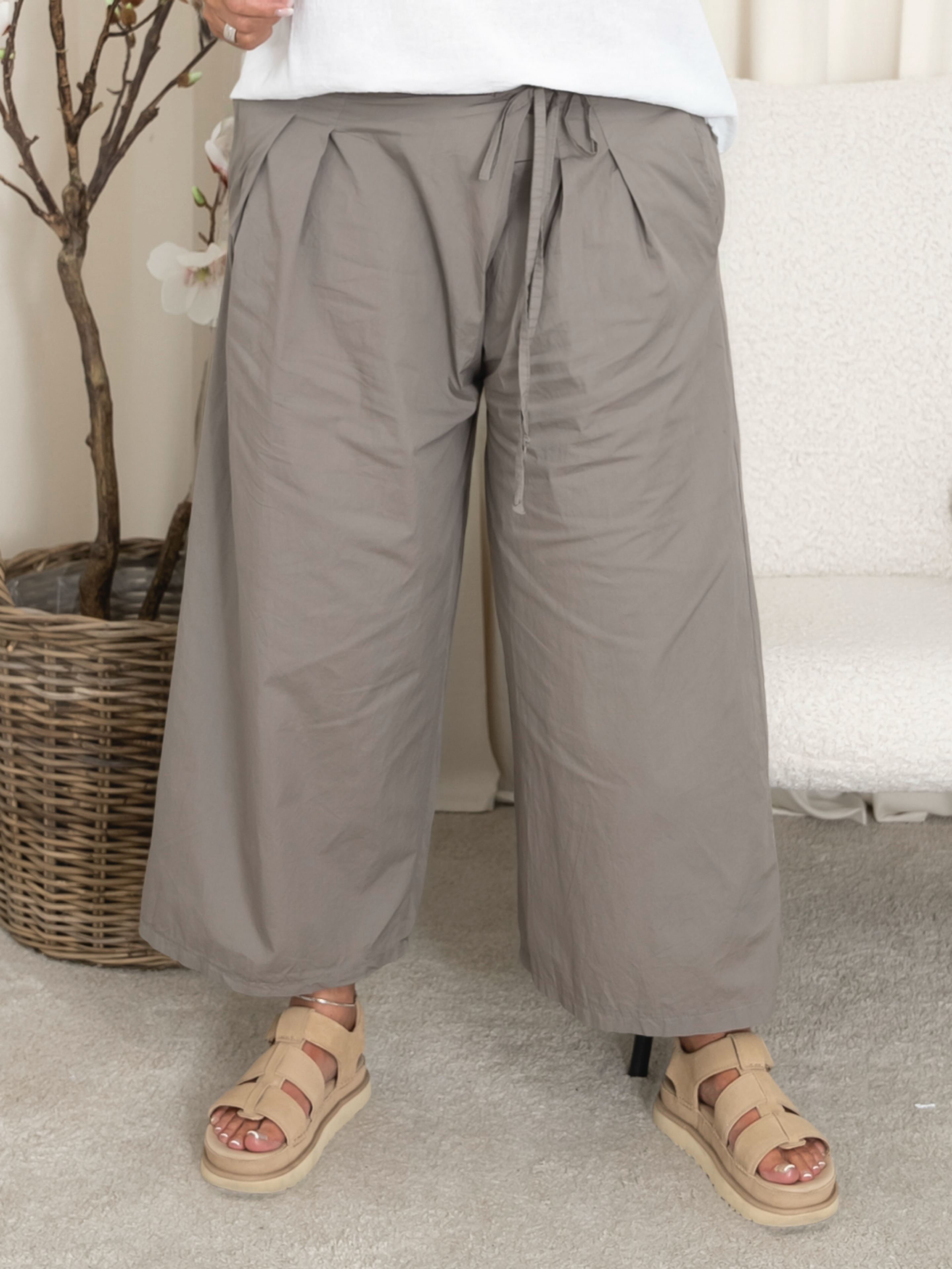 Buksen har elastik bagpå i taljen og bindebånd i siden, hvilket gør den utrolig behagelig at have på og nem at tilpasse efter din figur. Det lette materiale falder flot og føles skønt mod huden – perfekt til både ferie og hverdagsbrug.