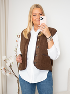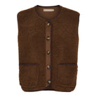 Designet er gennemført med en blød, teddy-lignende overflade, som både føles behagelig og giver et trendy udtryk. Den klassiske knaplukning foran og to praktiske frontlommer gør den nem at bruge i hverdagen, uanset om du styler den til inde- eller udebrug.