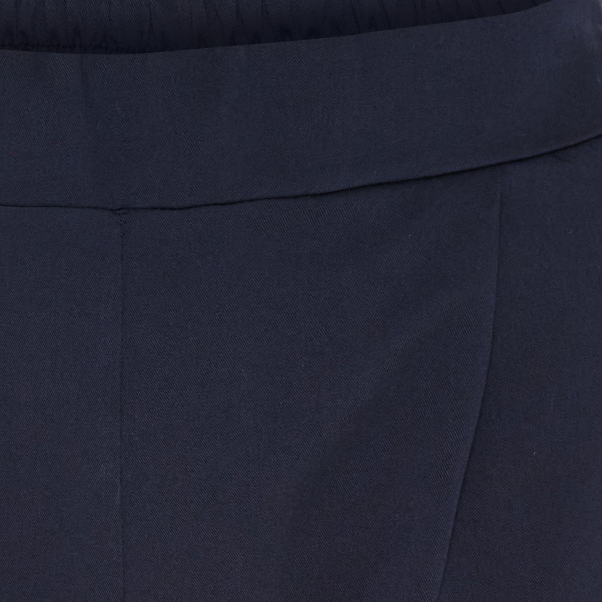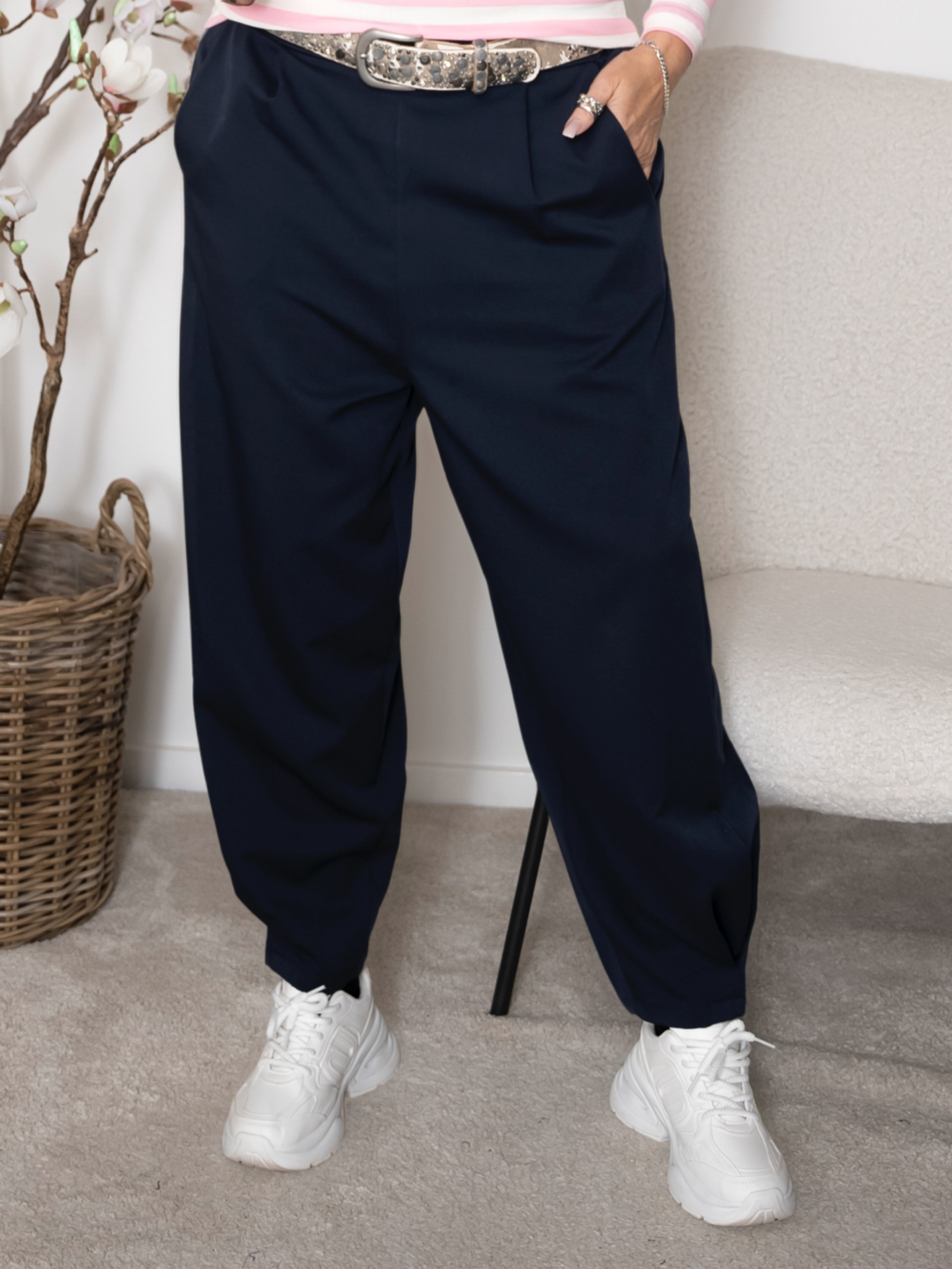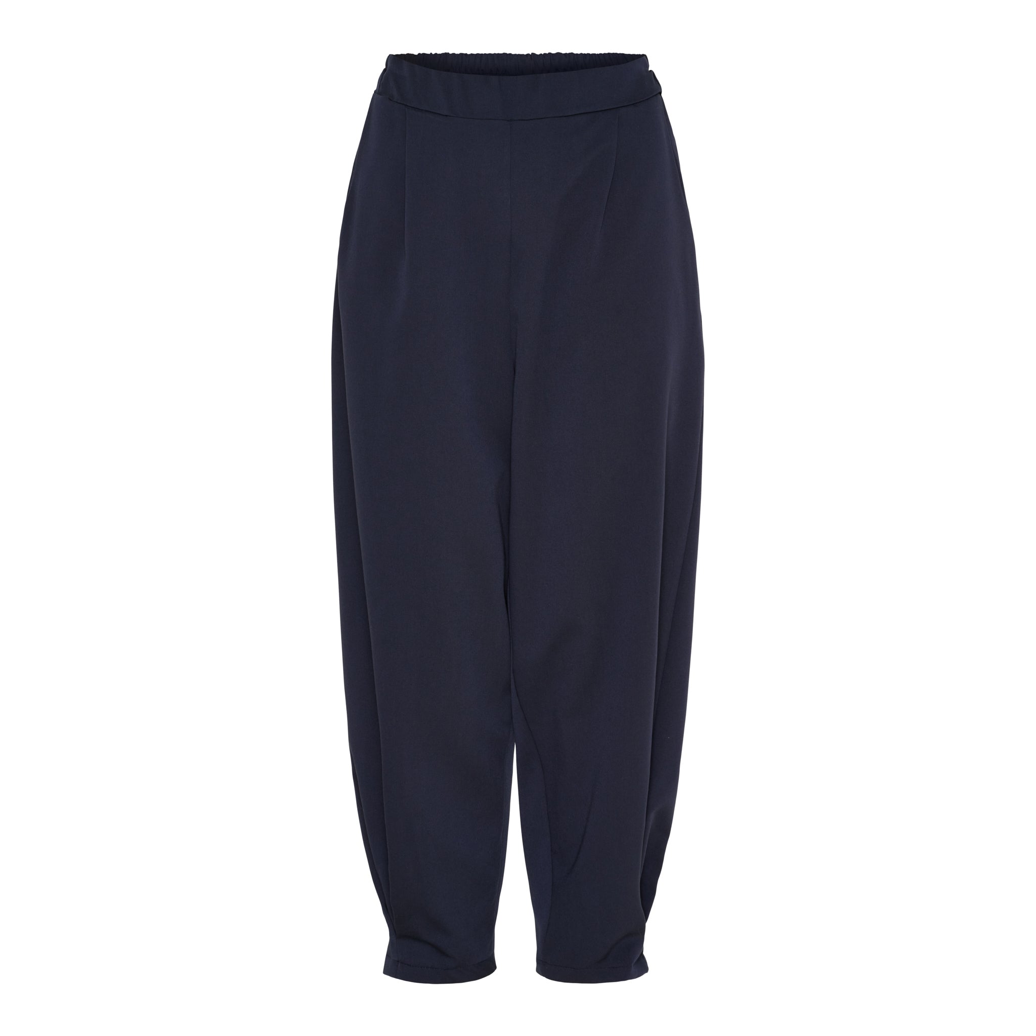 Designet er udført med elastik i taljen, som sikrer en pæn silhuet kombineret med høj komfort. Skrå lommer og den let tilspidsede benform med fine detaljer ved anklerne og den kortere længde giver et nutidigt og sofistikeret udtryk.