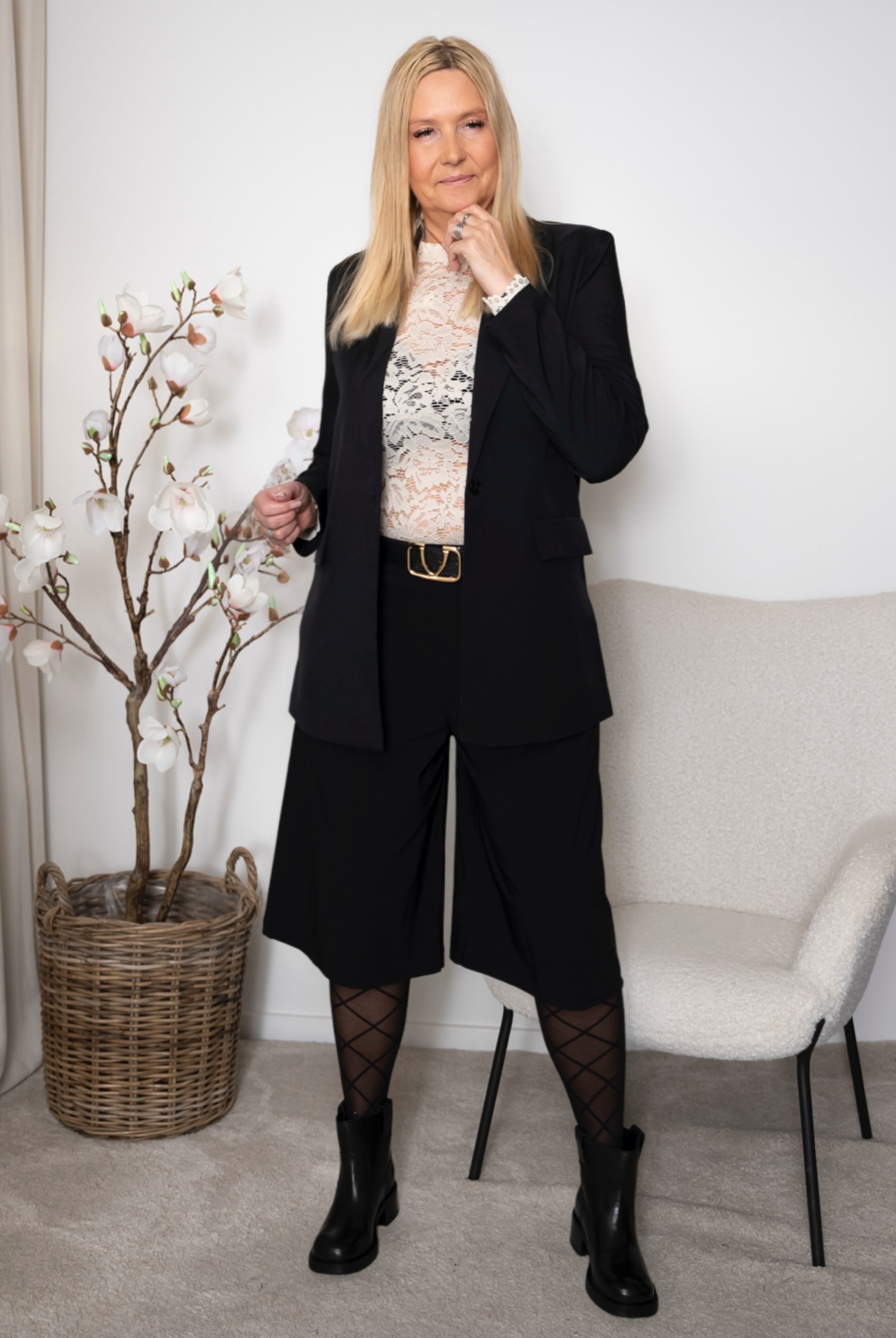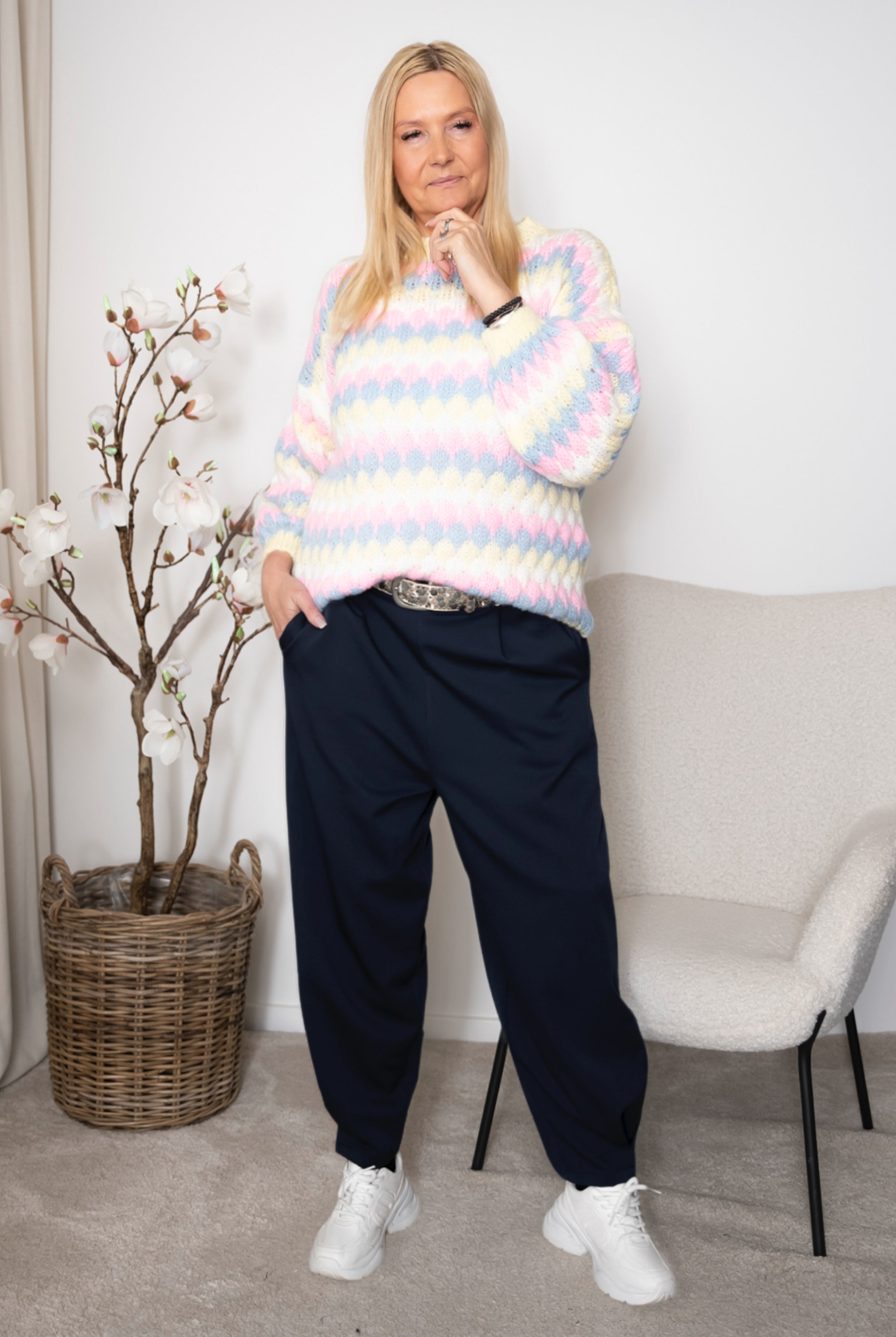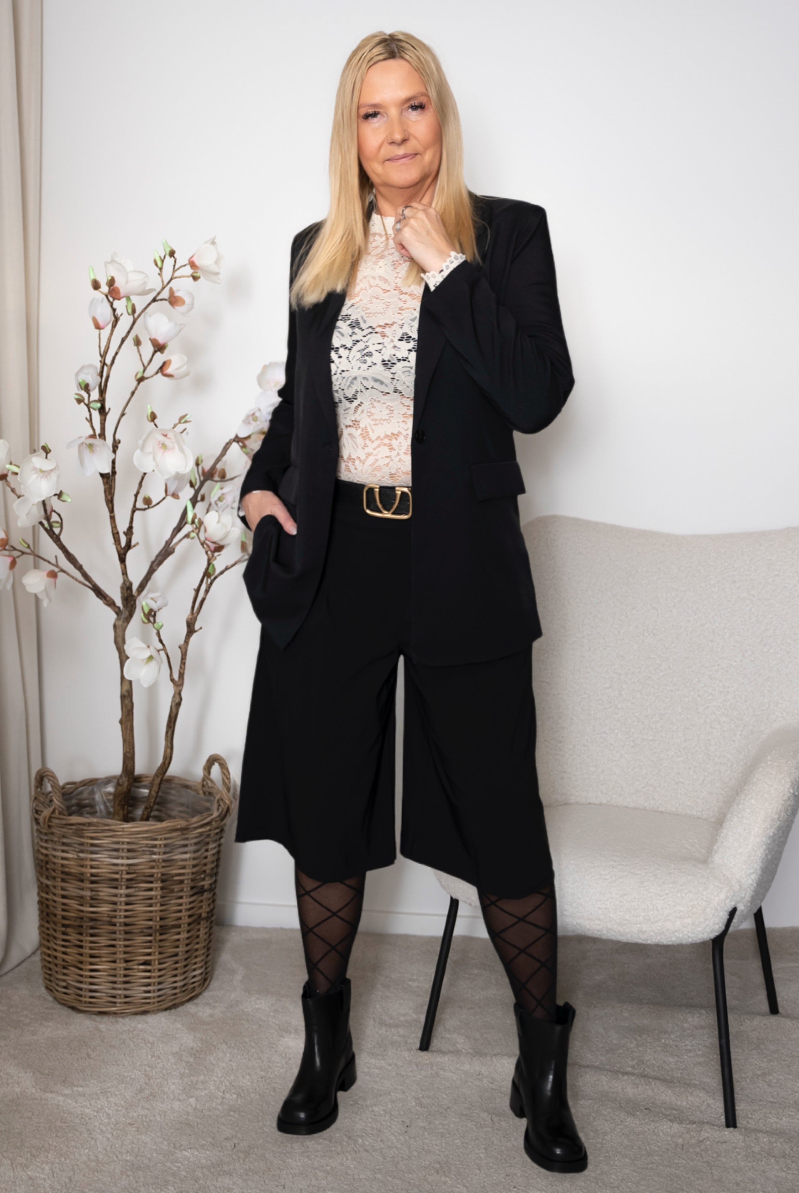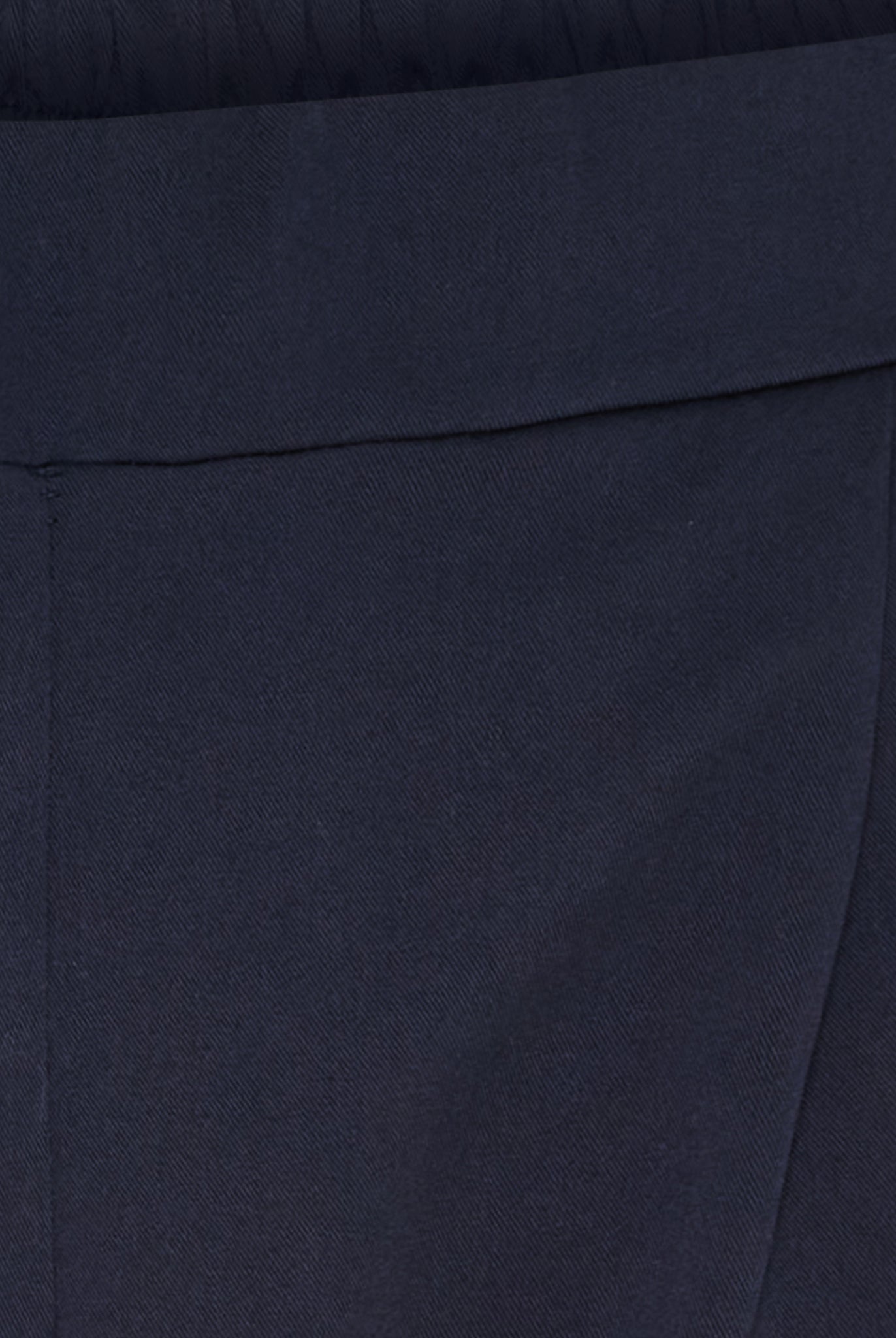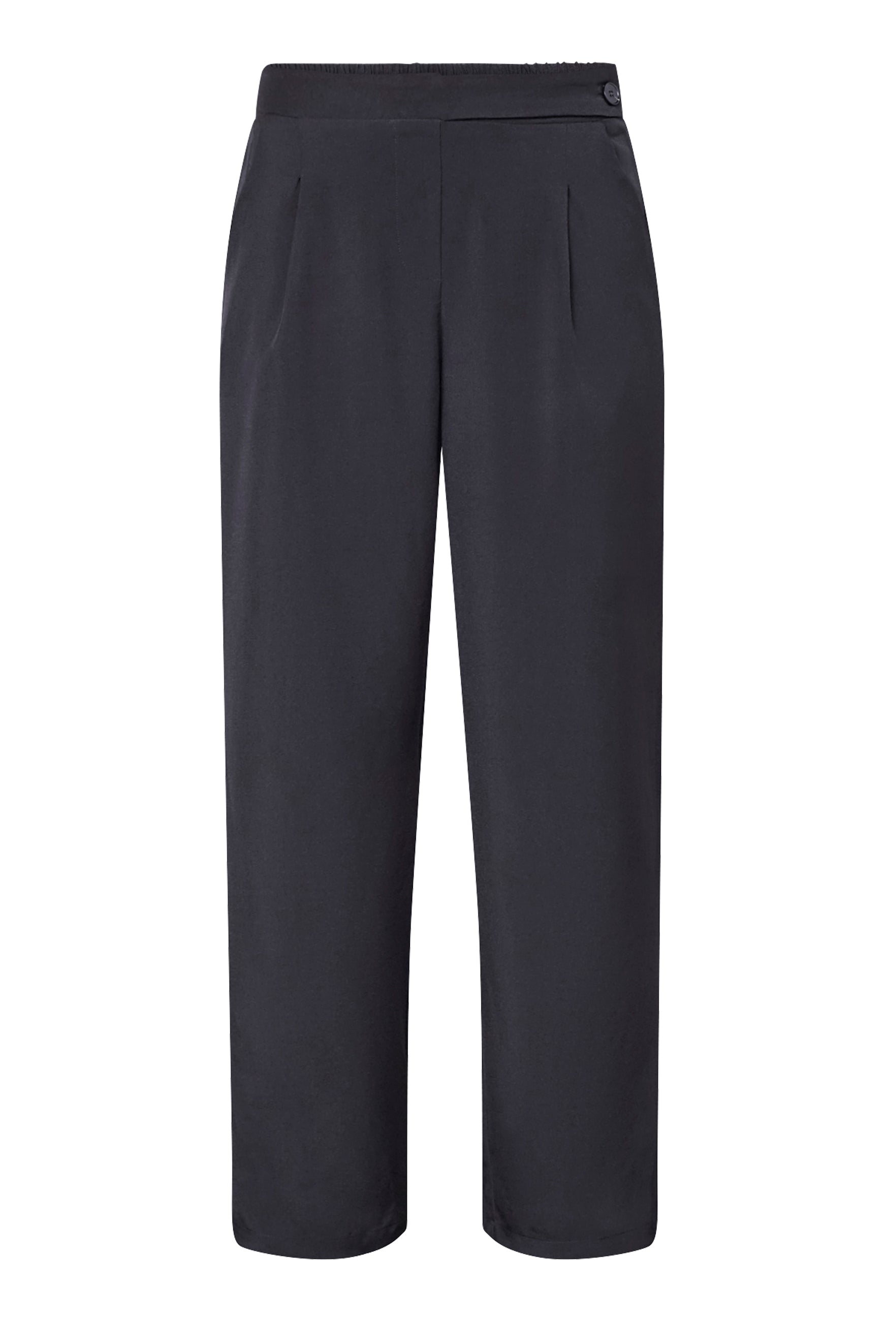 Designet er udført med elastik i taljen, som sikrer en pæn silhuet kombineret med høj komfort. Skrå lommer og den let tilspidsede benform med fine detaljer ved anklerne og den kortere længde giver et nutidigt og sofistikeret udtryk.