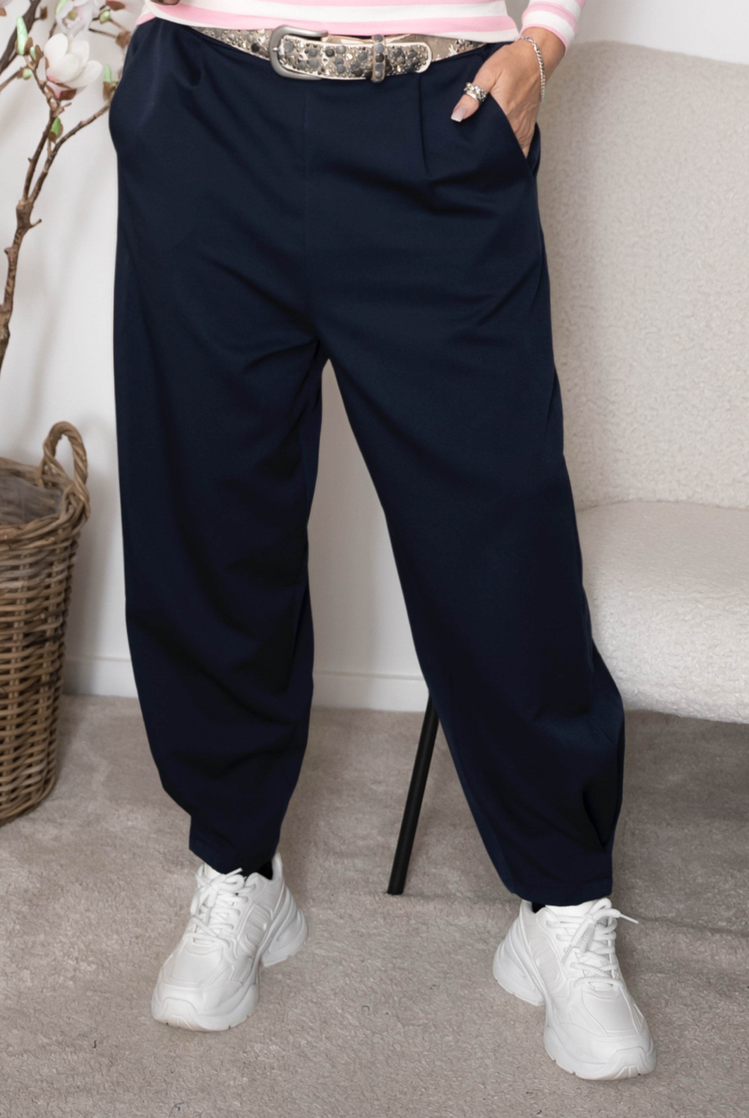 Disse bukser har et elegant og minimalistisk udtryk med en moderne, let ballonform. Den neutrale farve giver et klassisk og stilrent look, som nemt kan styles til både hverdag og mere formelle anledninger.