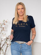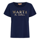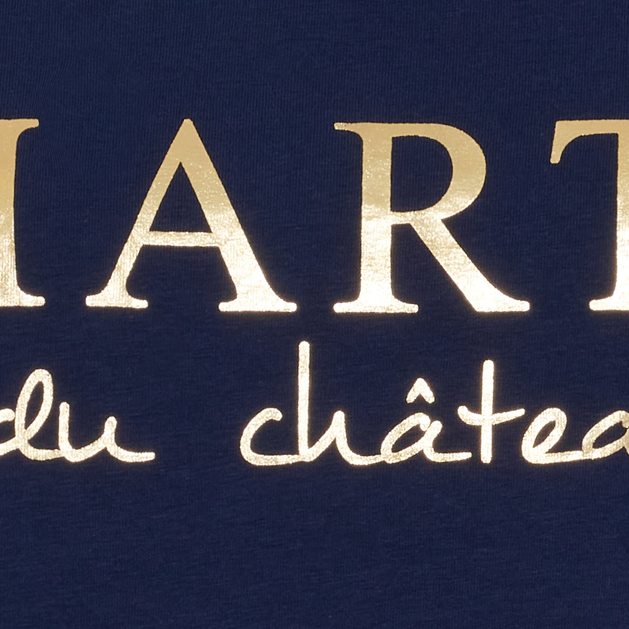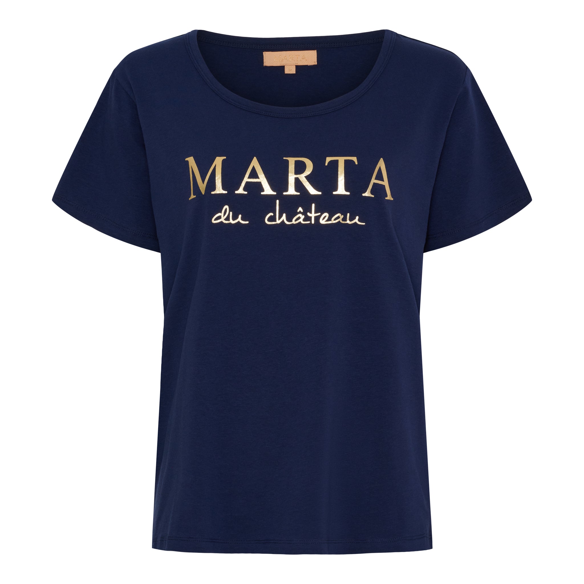 Designet er klassisk med rund halsudskæring og korte ærmer, hvilket giver en tidløs pasform, der er nem at style. Det diskrete guldfarvede “MARTA du Château”-print tilfører et luksuriøst touch og løfter det enkle design.