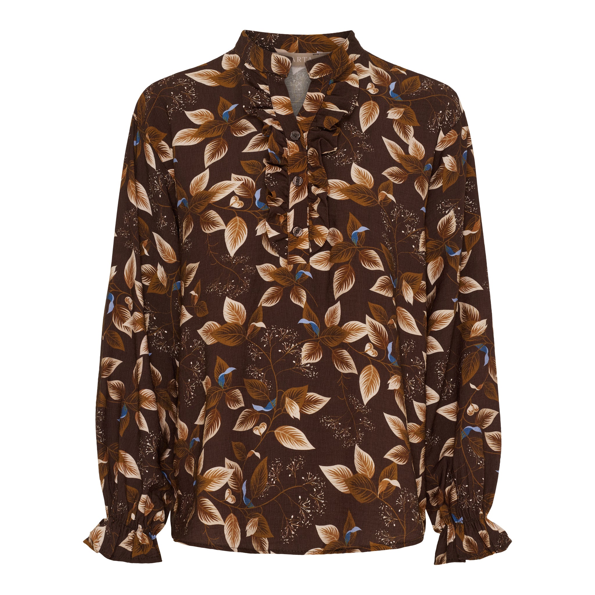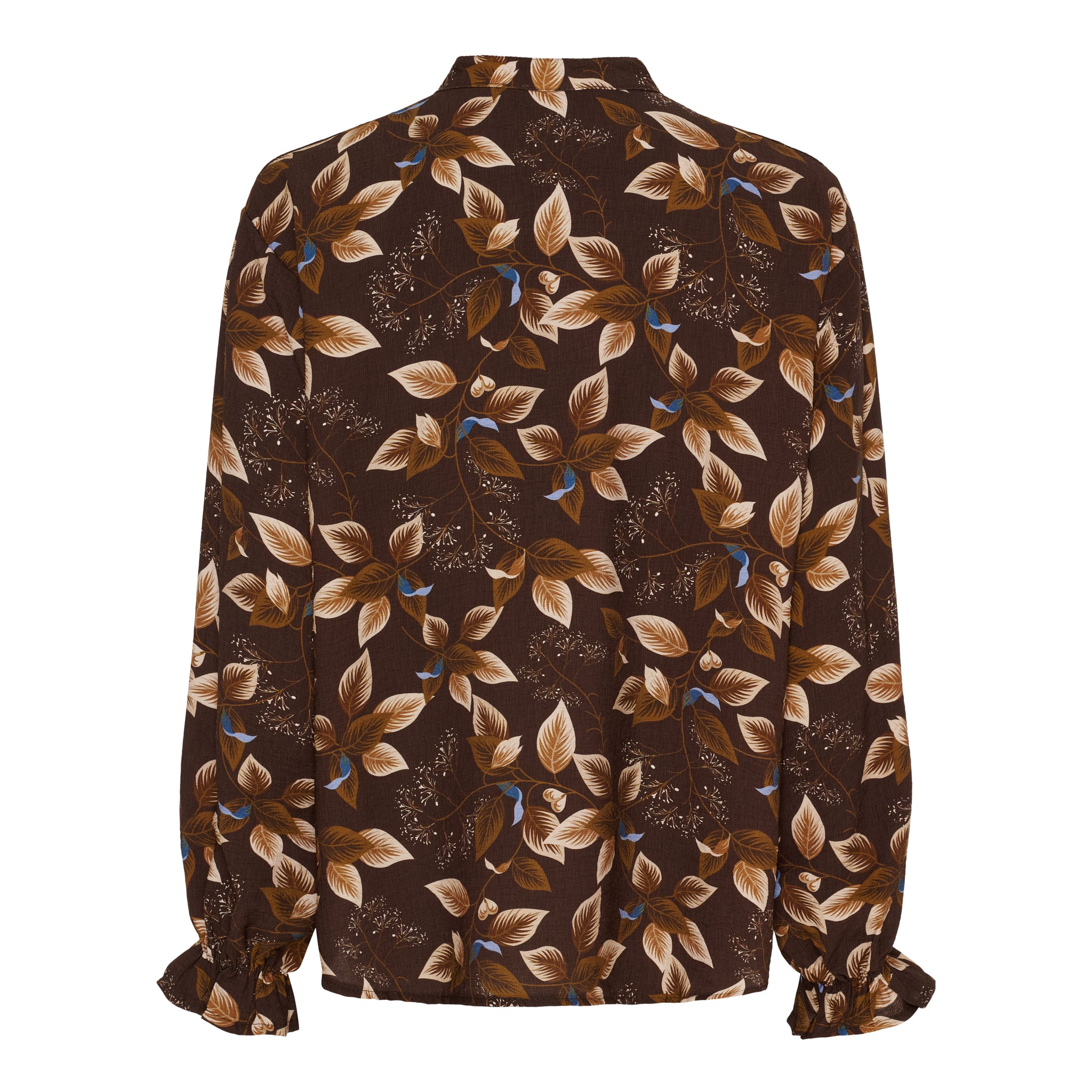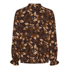 Denne smukke bluse er til dig, der elsker feminine detaljer og et elegant udtryk. Det lækre stof falder blødt og giver en luftig fornemmelse, mens det detaljerede bladprint tilføjer et sofistikeret touch. Den lille flæsekant ved halsudskæringen og ned langs knaplukningen skaber blikfang og understreger det romantiske look.