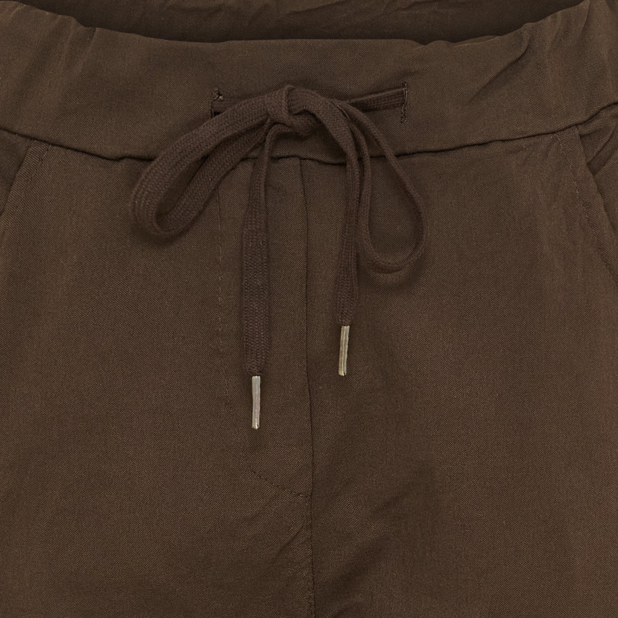 Disse alsidige bukser er både stilrene og komfortable – ideelle til dig, der ønsker et afslappet look med et moderne twist. Det bløde stretchy materiale kombineret med elastisk talje og bindebånd gør dem super behagelige at have på, mens den smalle pasform og opsmøg ved anklerne giver et smart og tidssvarende udtryk.