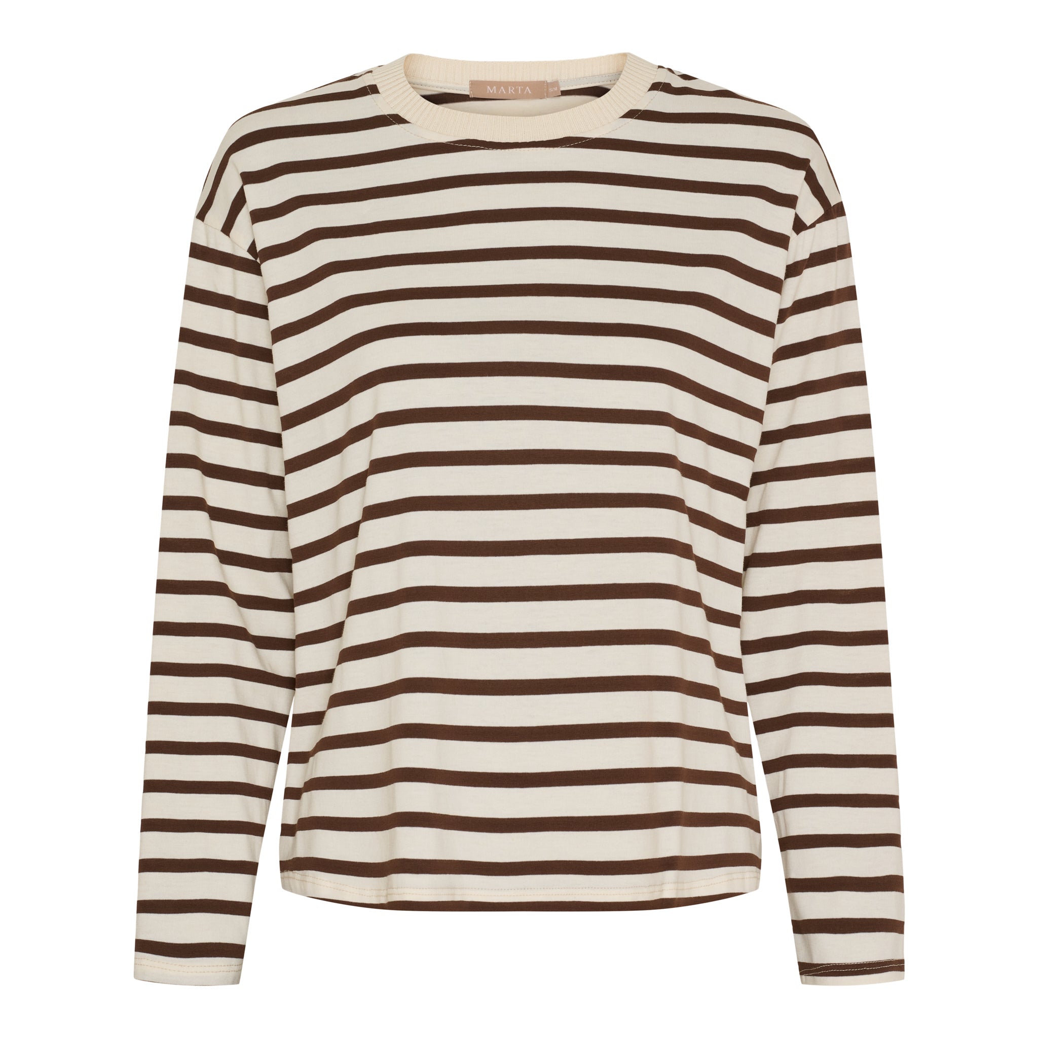 Blusen har rund hals med fin ribkant, trekvartlange ærmer og et let oversize snit, som giver en afslappet og moderne pasform. De vandrette striber tilfører et tidløst maritimt look, som er lige nemt at dresse op eller ned.