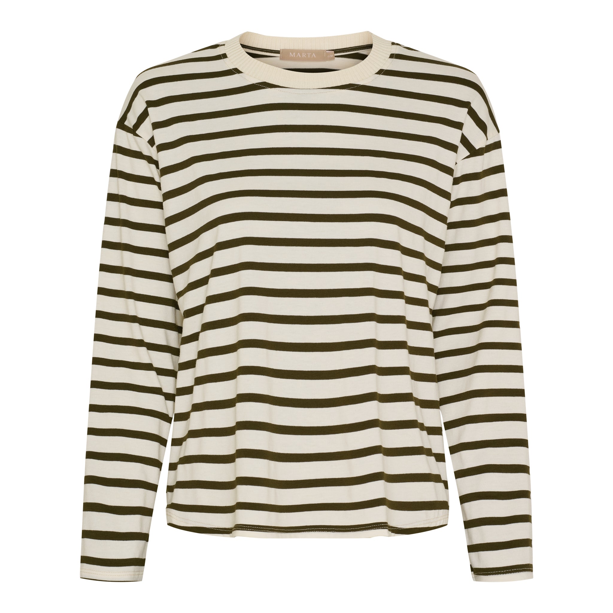 Blusen har rund hals med fin ribkant, trekvartlange ærmer og et let oversize snit, som giver en afslappet og moderne pasform. De vandrette striber tilfører et tidløst maritimt look, som er lige nemt at dresse op eller ned.