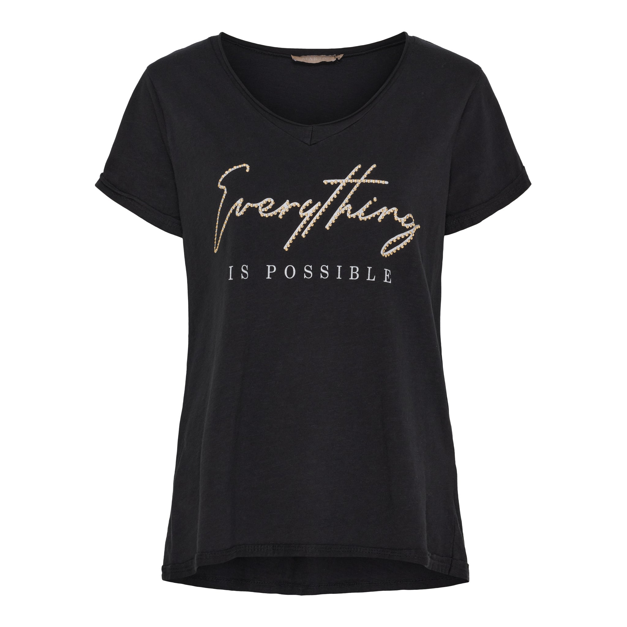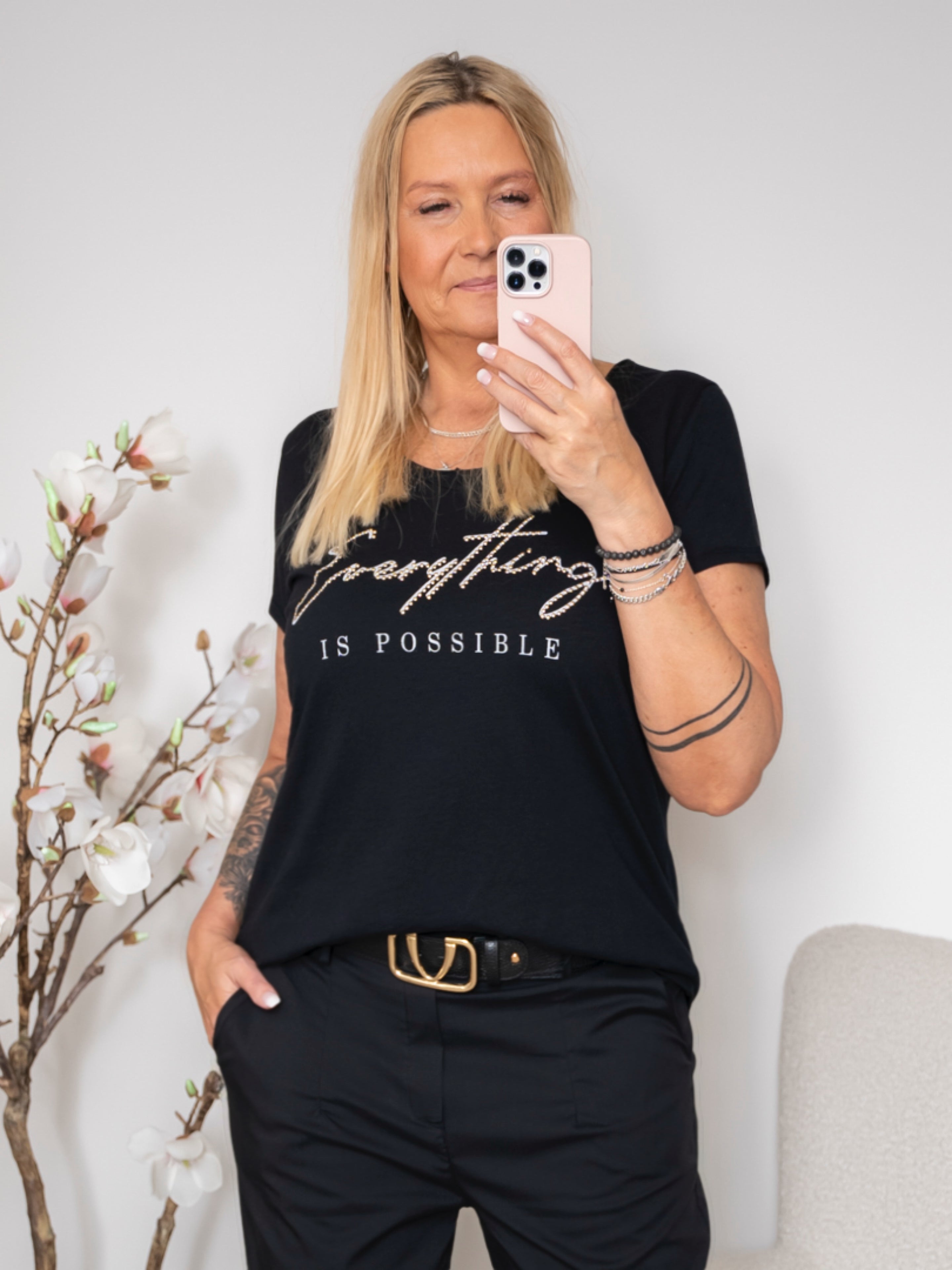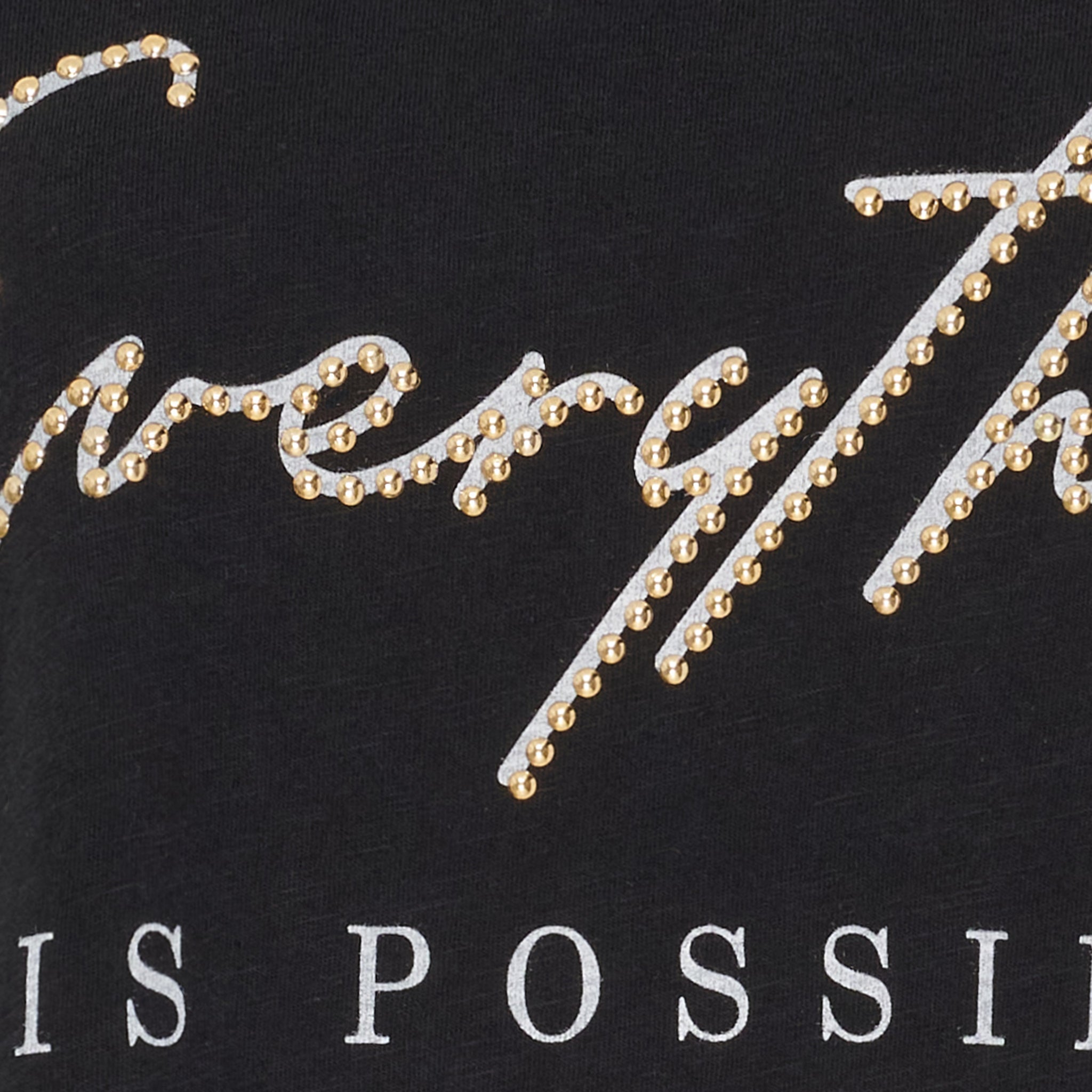 En t-shirt der emmer af attitude og komfort på én gang! Den bløde kvalitet gør den utrolig behagelig at have på, mens det flotte statement-print foran giver et strejf af personlighed og stil. Det dekorative budskab prydes af fine små nitter, som tilføjer en elegant og moderne detalje til looket.