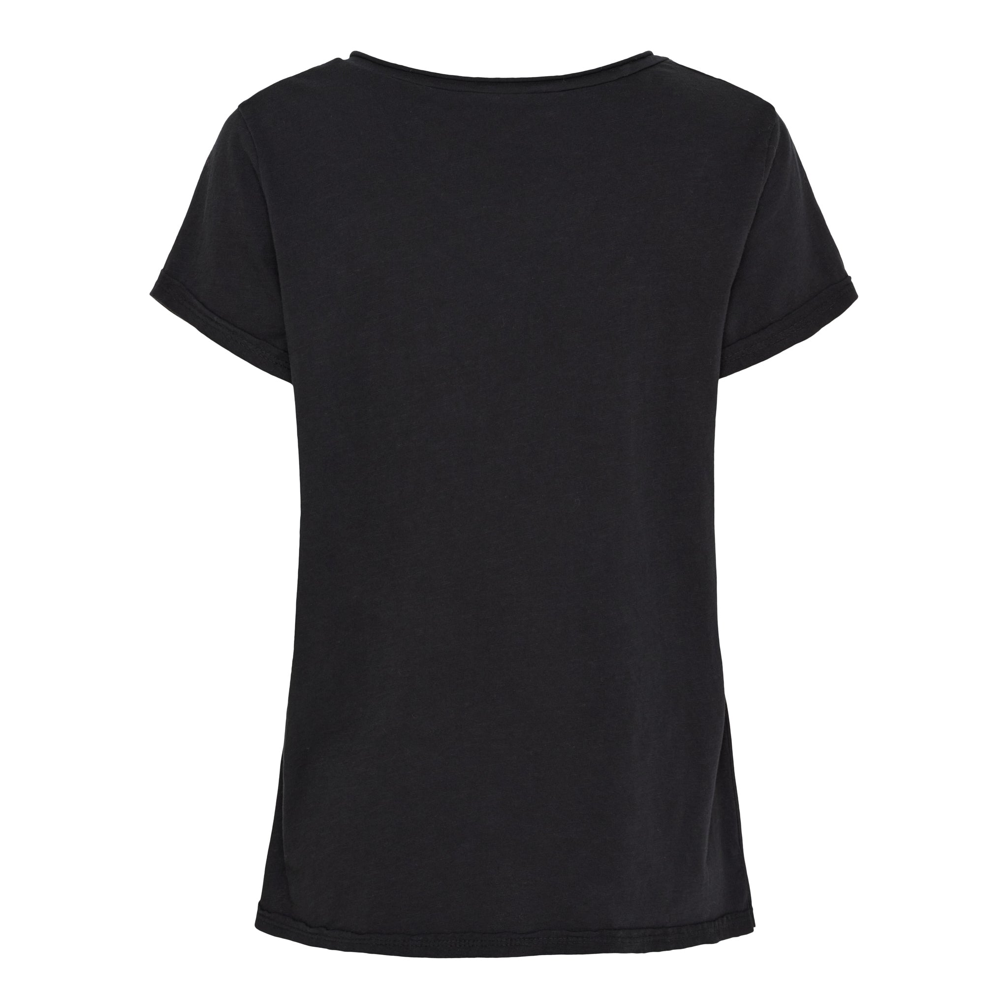 Halsudskæringen er rund med en lille V-slids foran, og de korte ærmer har et casual opsmøg, der gør den ekstra afslappet i udtrykket.