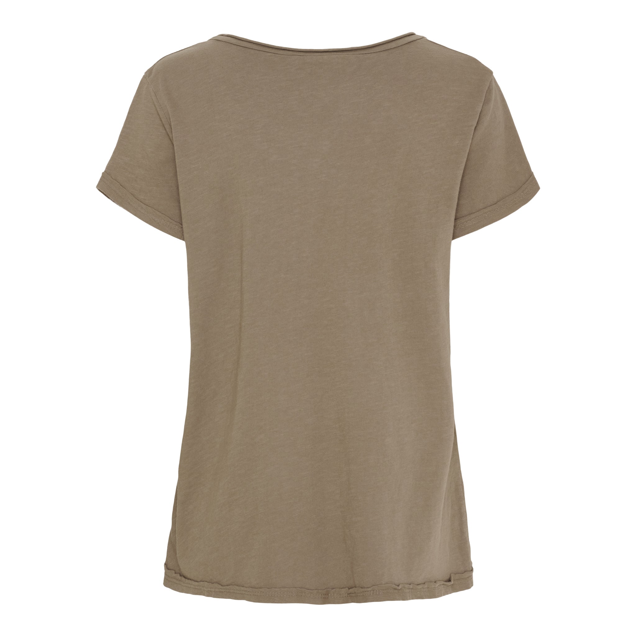 Halsudskæringen er rund med en lille V-slids foran, og de korte ærmer har et casual opsmøg, der gør den ekstra afslappet i udtrykket.