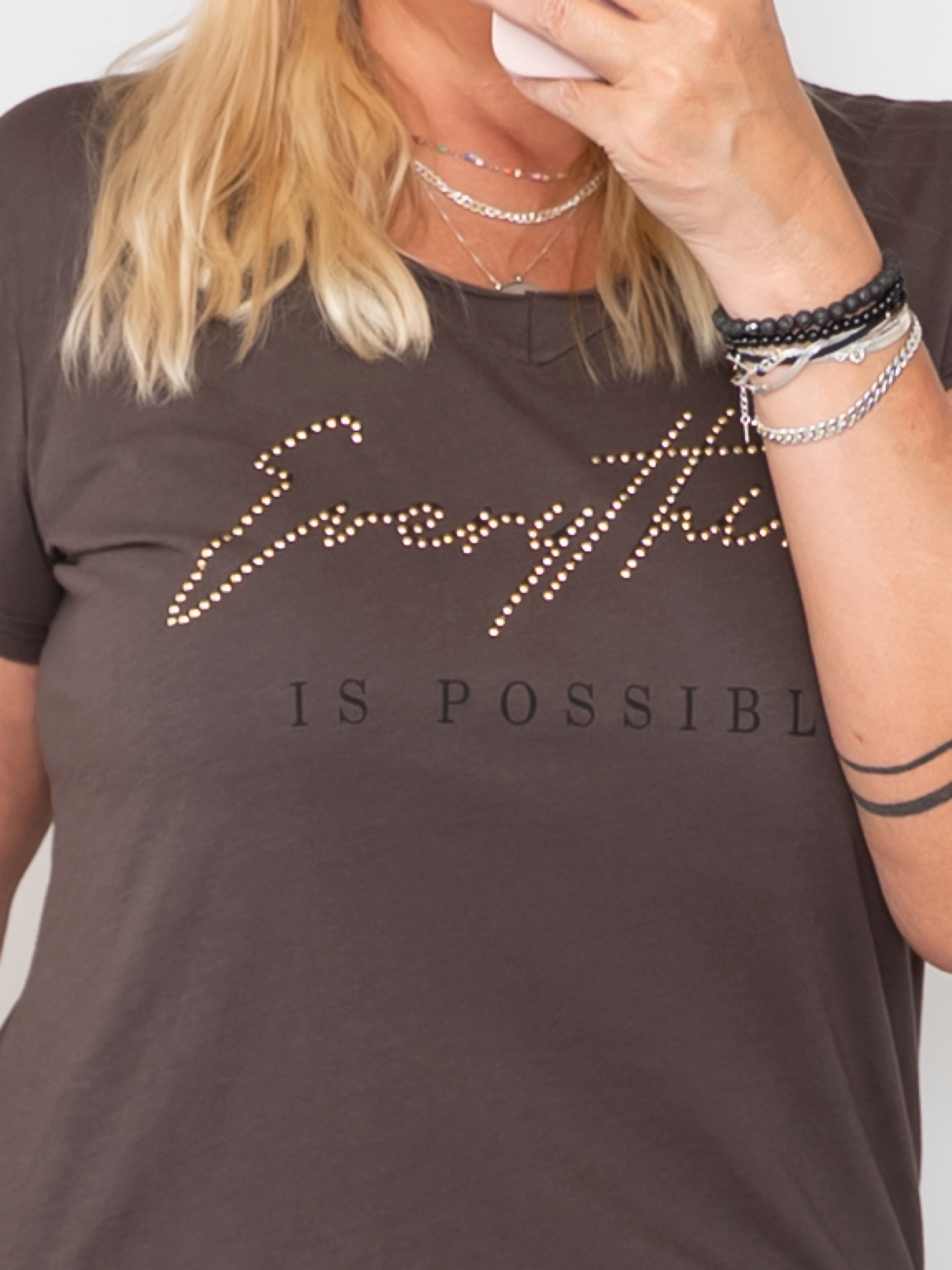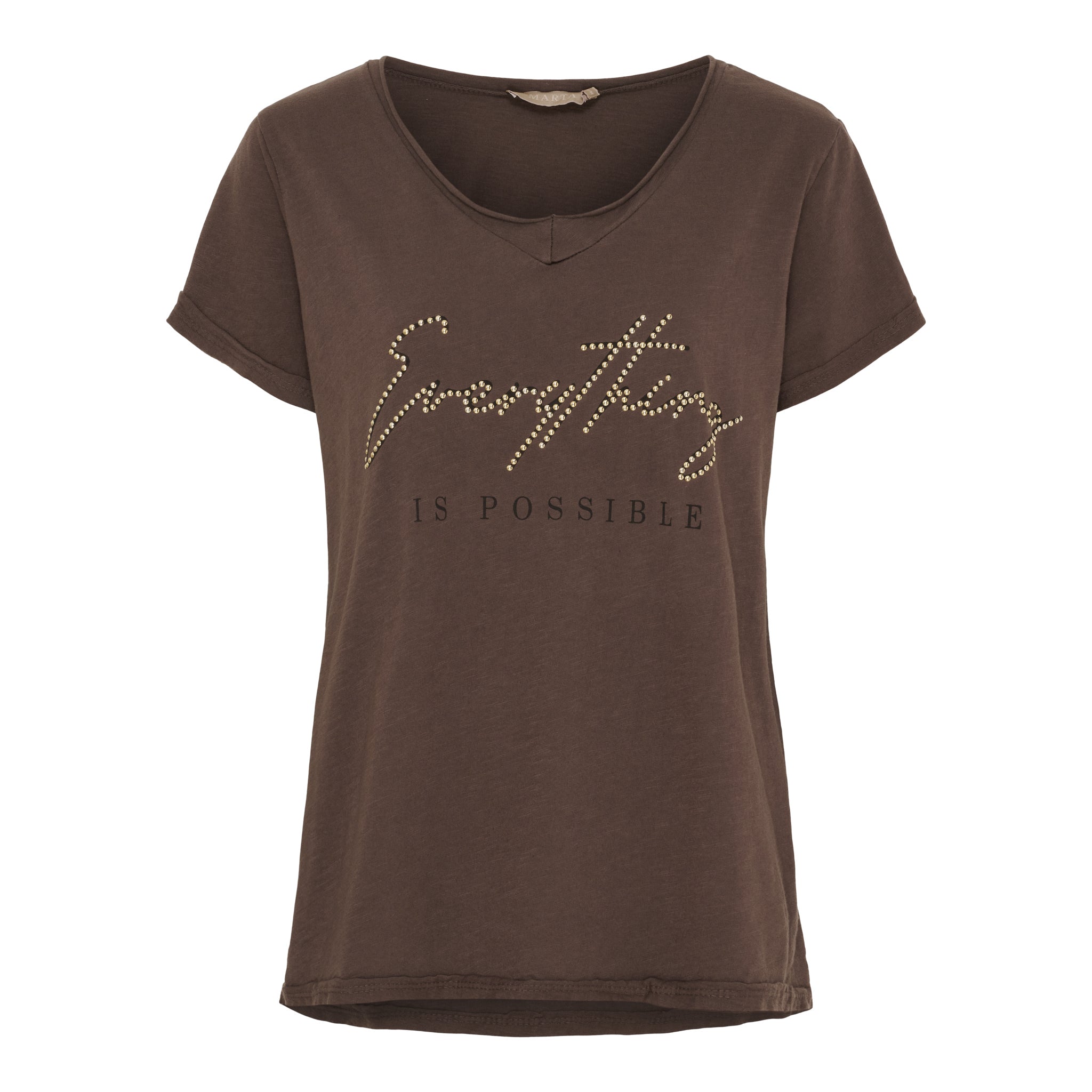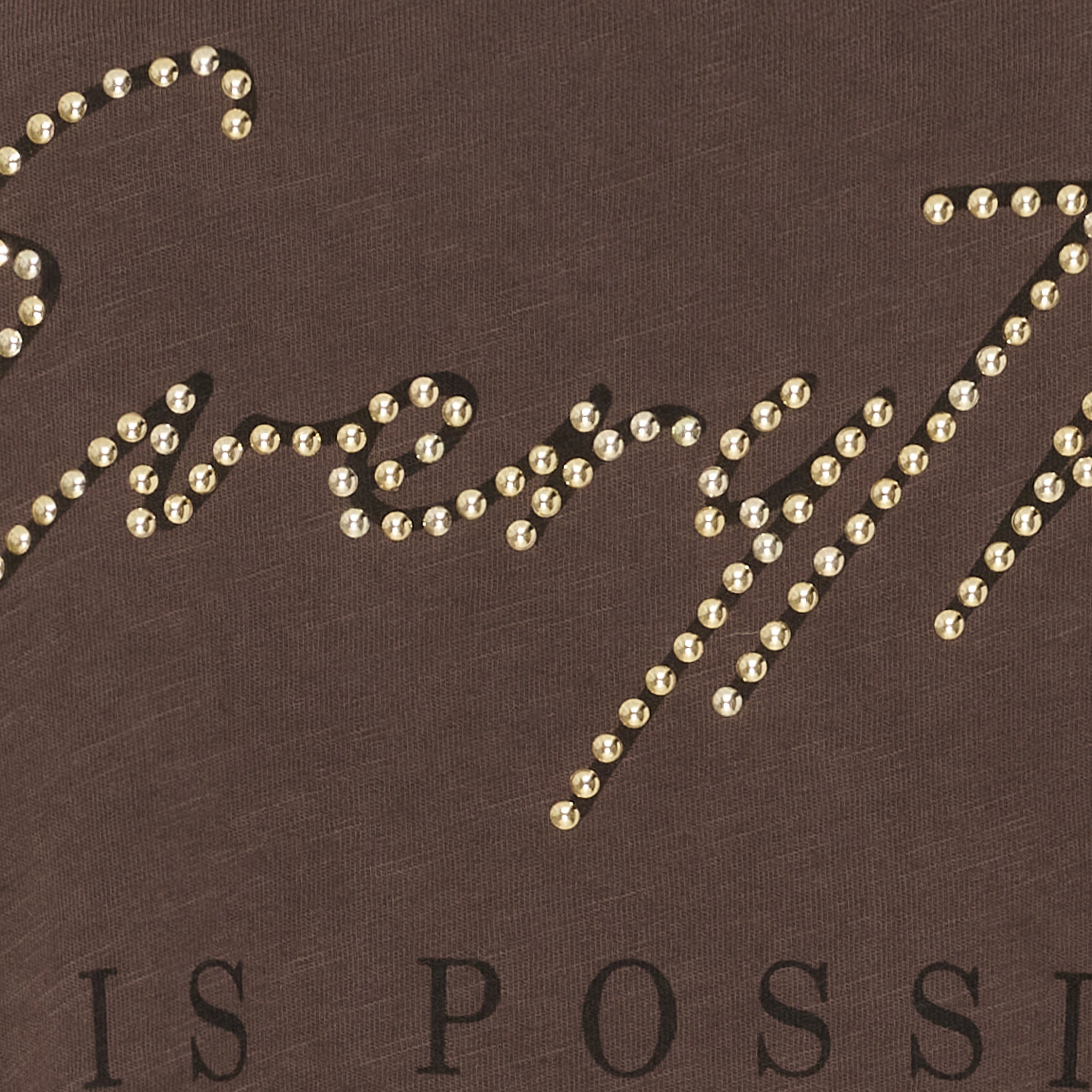 En t-shirt der emmer af attitude og komfort på én gang! Den bløde kvalitet gør den utrolig behagelig at have på, mens det flotte statement-print foran giver et strejf af personlighed og stil. Det dekorative budskab prydes af fine små nitter, som tilføjer en elegant og moderne detalje til looket.
