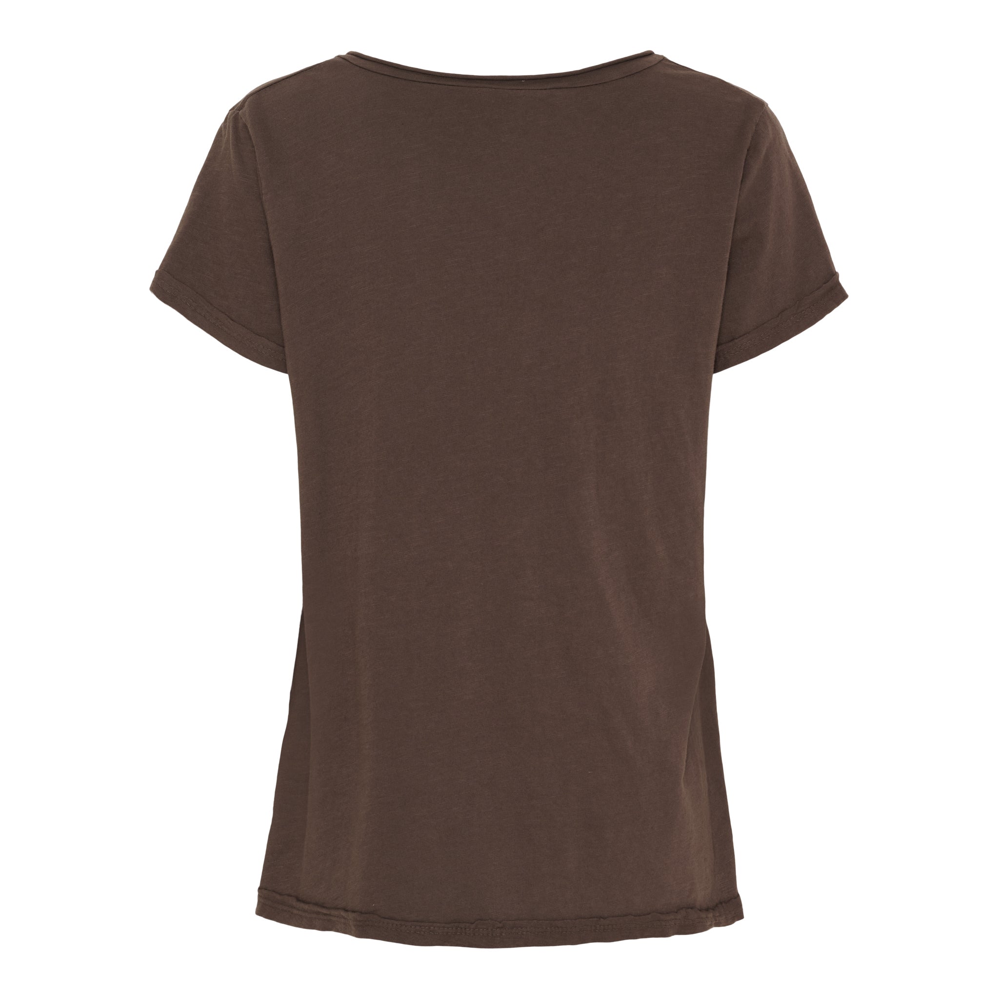 Halsudskæringen er rund med en lille V-slids foran, og de korte ærmer har et casual opsmøg, der gør den ekstra afslappet i udtrykket.