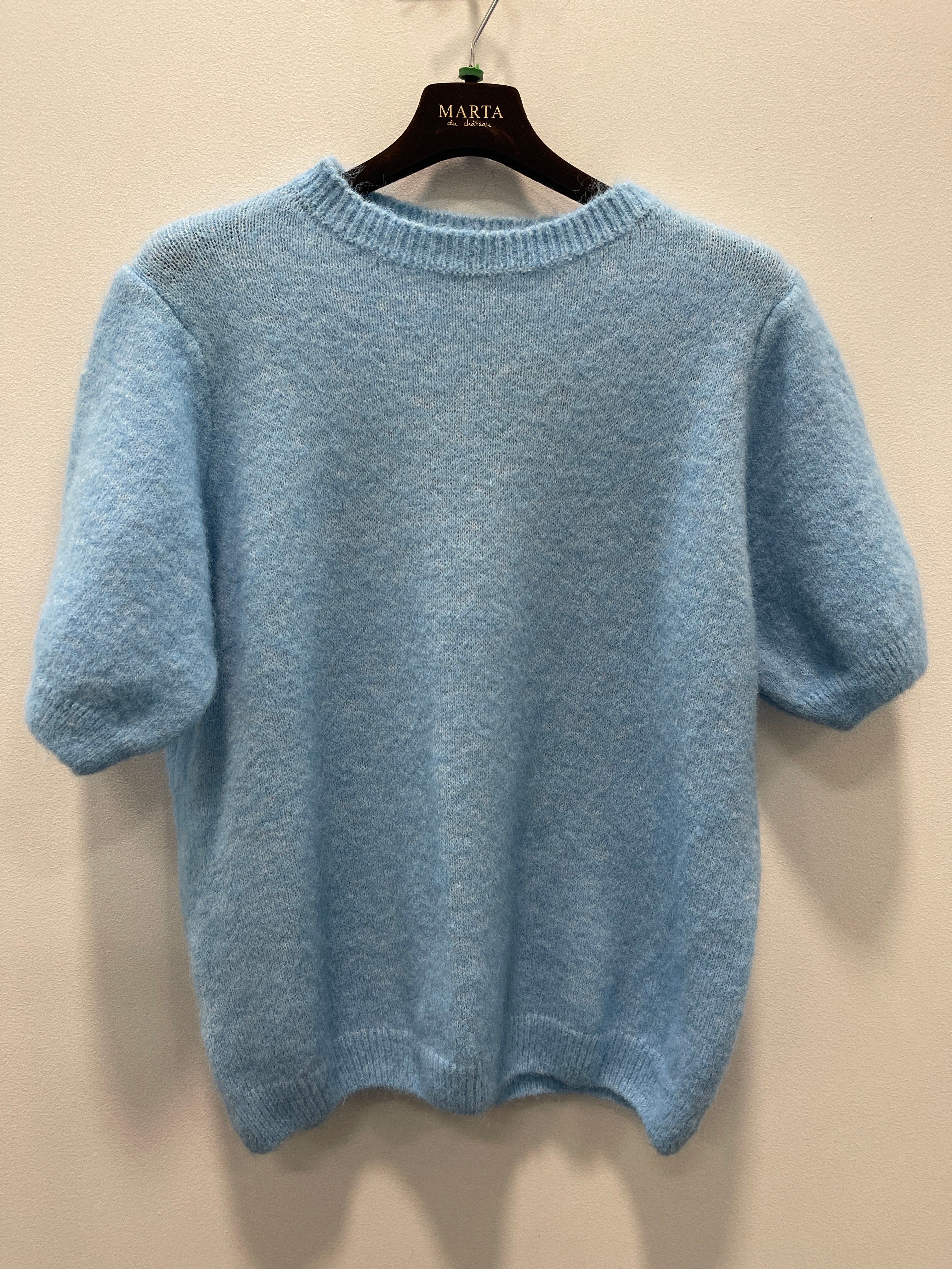 Designet er udført med rund hals og korte ærmer med let volumen, som tilfører et moderne og elegant touch. Den afslappede pasform gør strikken behagelig at have på og ideel både alene eller over en skjorte eller kjole.