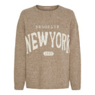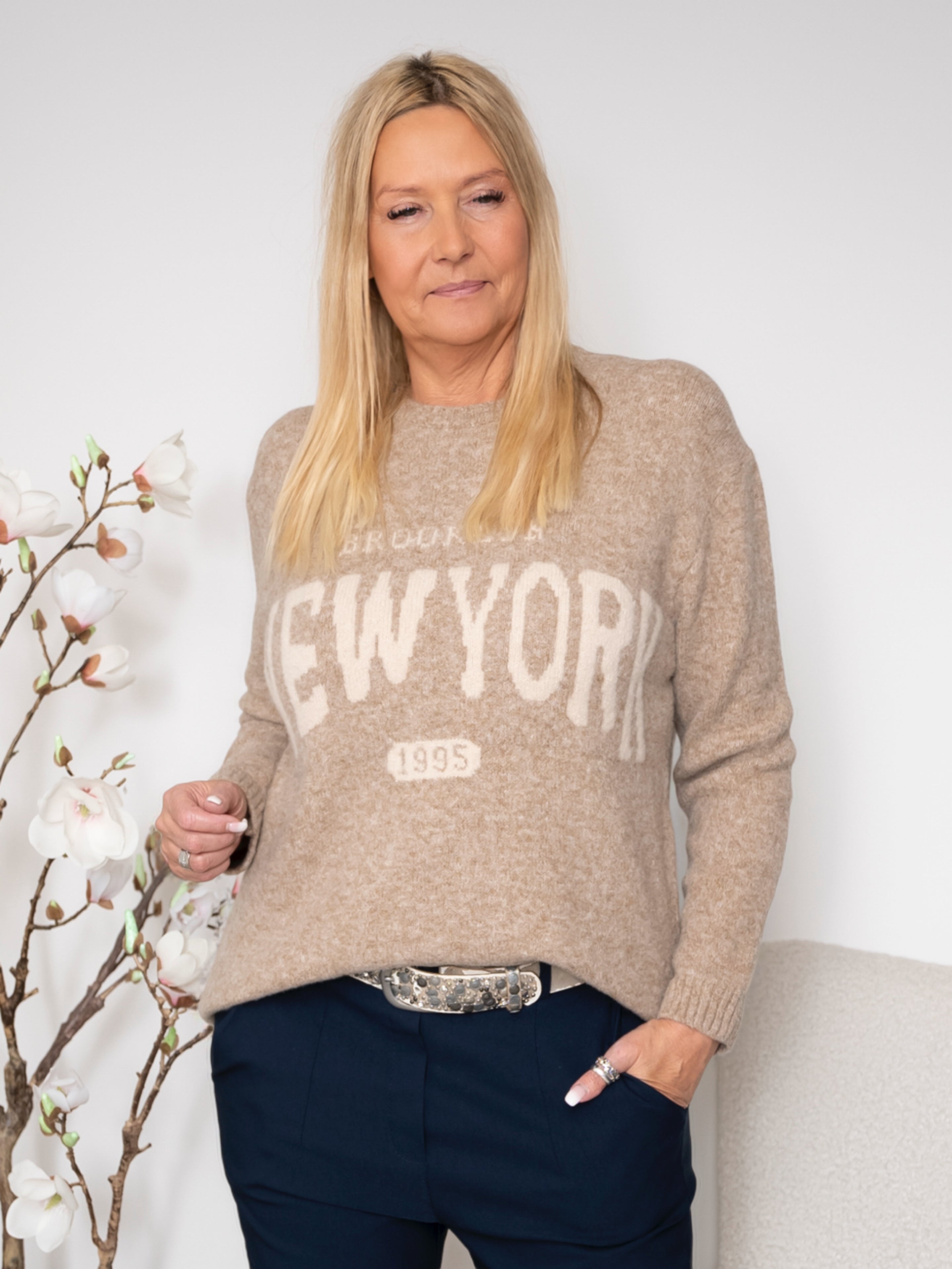 Det klassiske snit med rund hals og lange ærmer skaber en tidløs silhuet, mens den store tekst tilfører et sporty og casual præg. En alsidig strik, der fungerer perfekt både alene og sammen med skjorter eller toppe under.