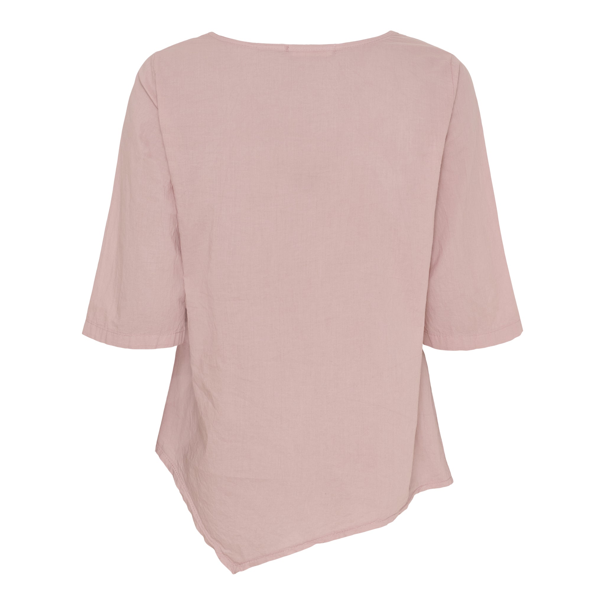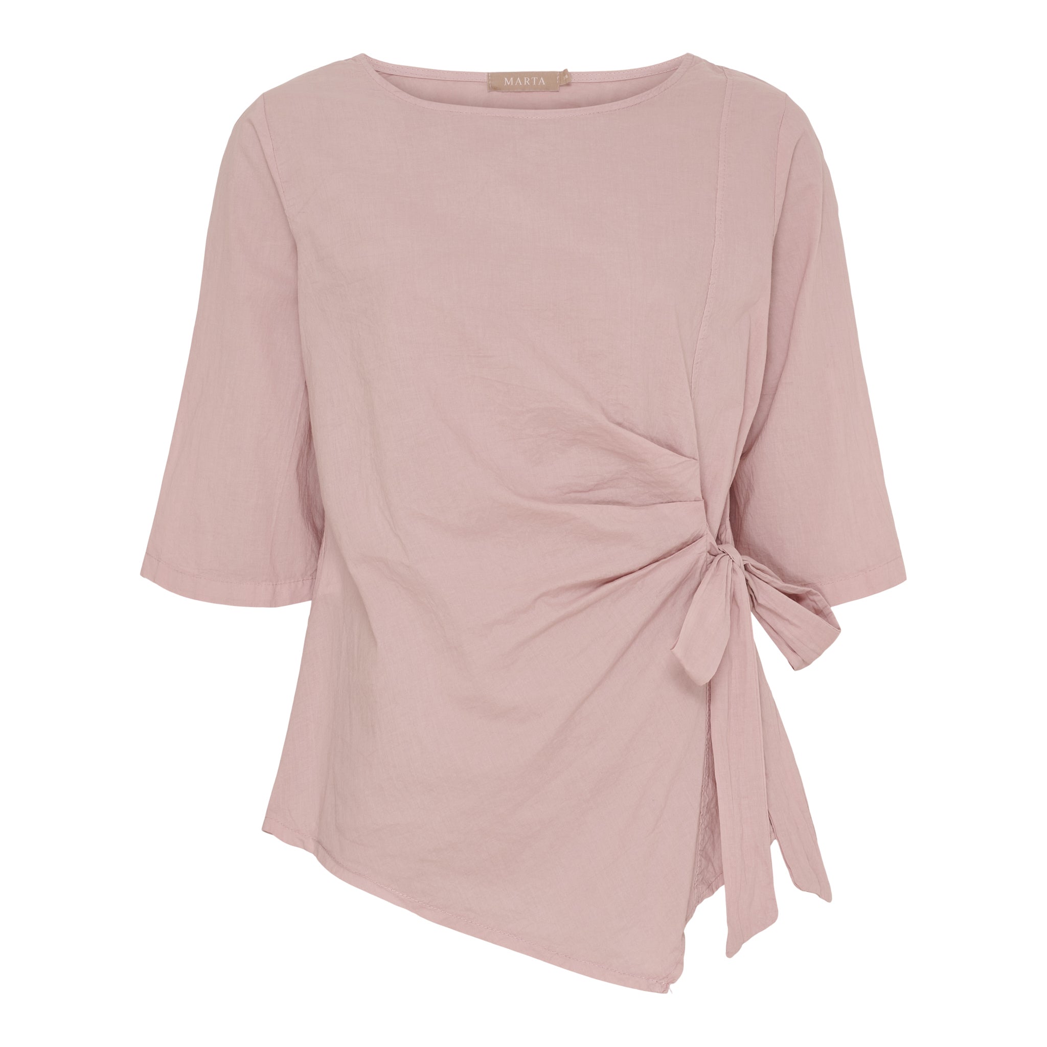 Det lette og luftige materiale gør den skøn at have på – både til hverdag og særlige lejligheder. De halvlange ærmer og den runde halsudskæring holder udtrykket klassisk, mens asymmetrien og knuden tilføjer noget helt særligt.