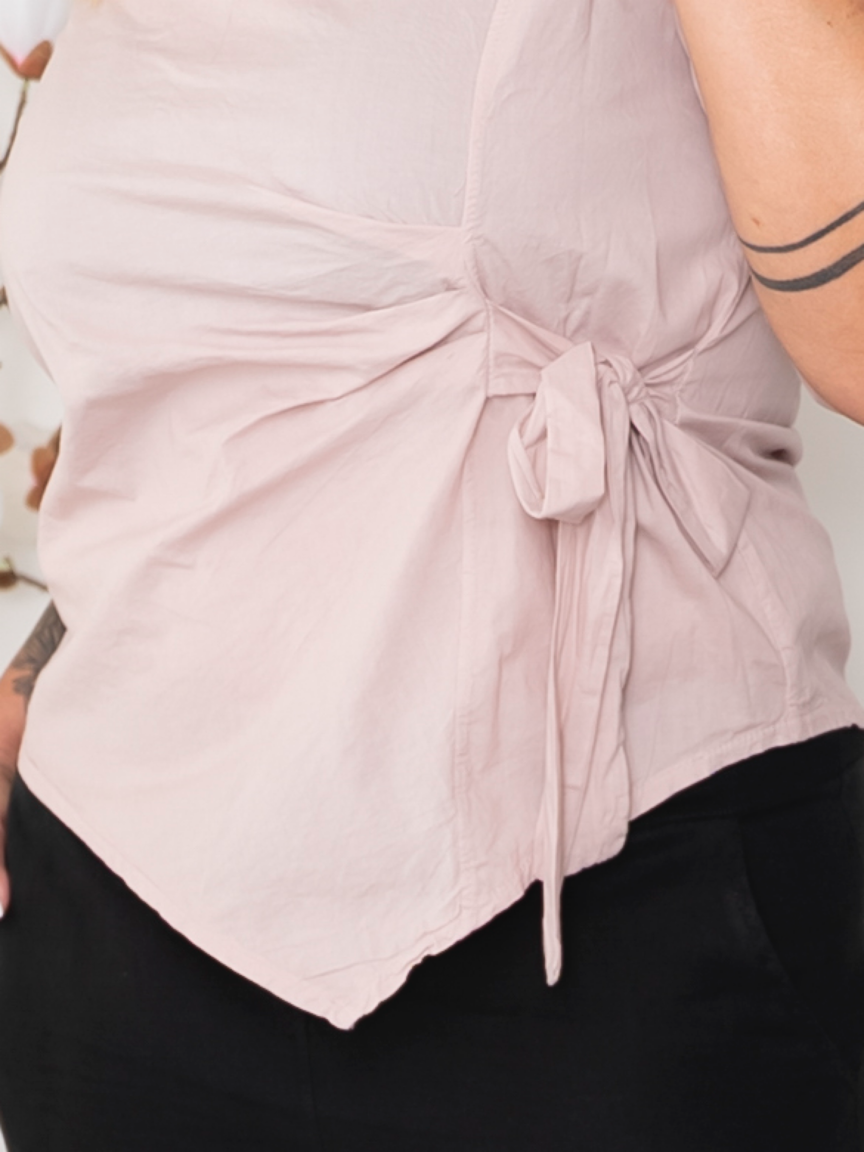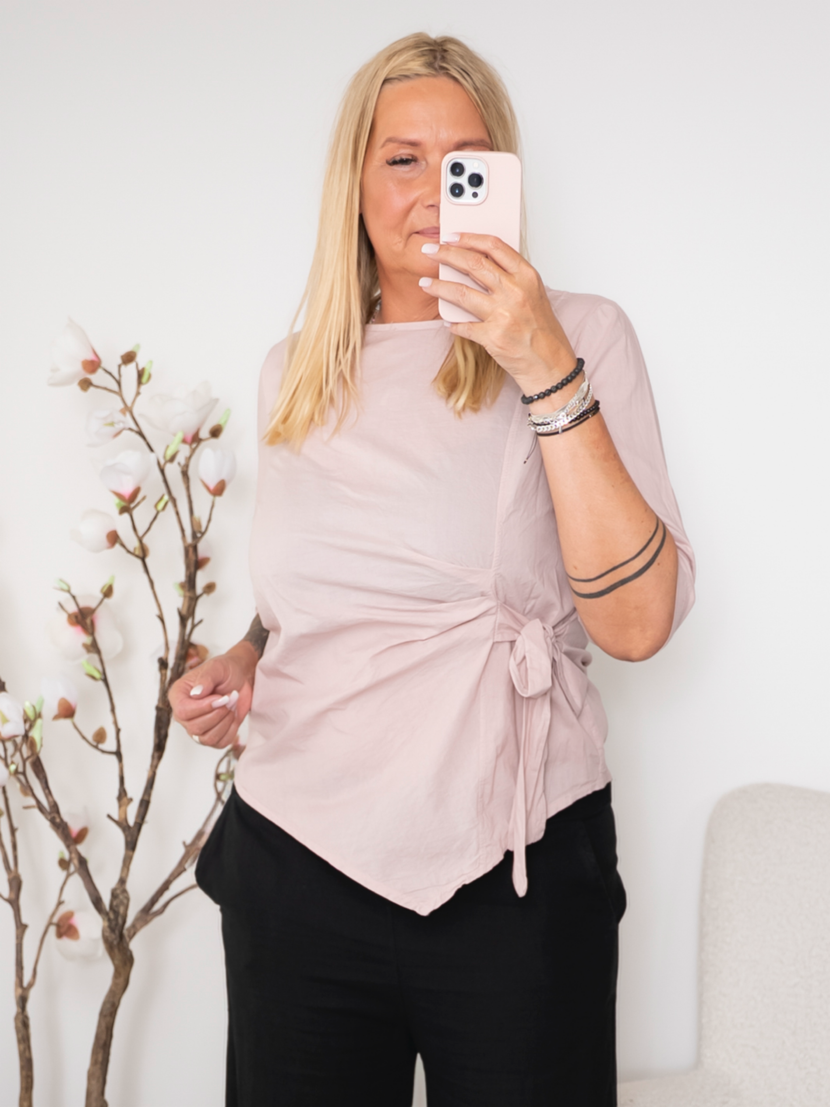 Denne smukke bluse er det perfekte valg, når du ønsker et feminint og sofistikeret look med et moderne twist. Den enkle silhuet brydes elegant af den dekorative knudedetalje i siden, som skaber en flatterende effekt og giver blusen karakter.
