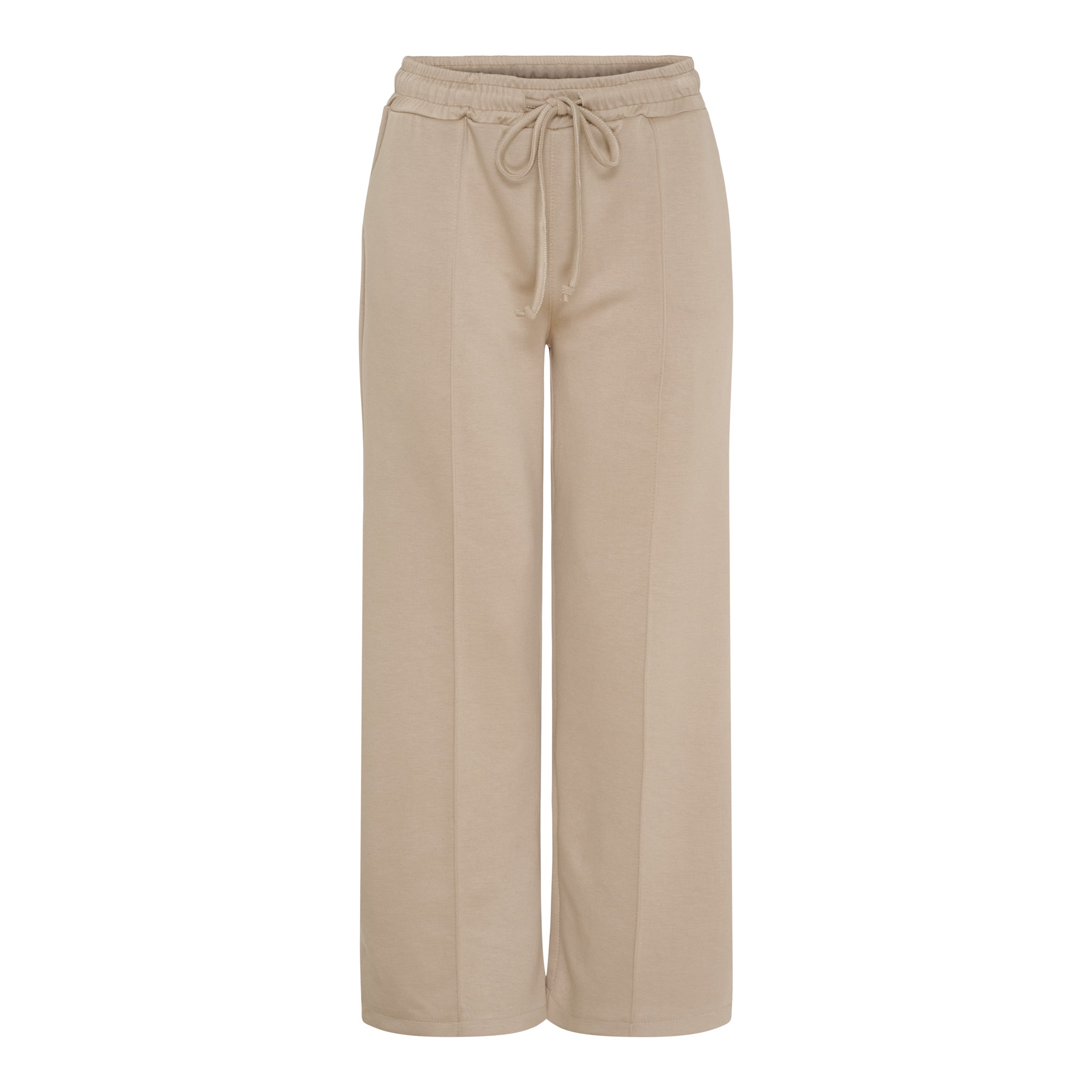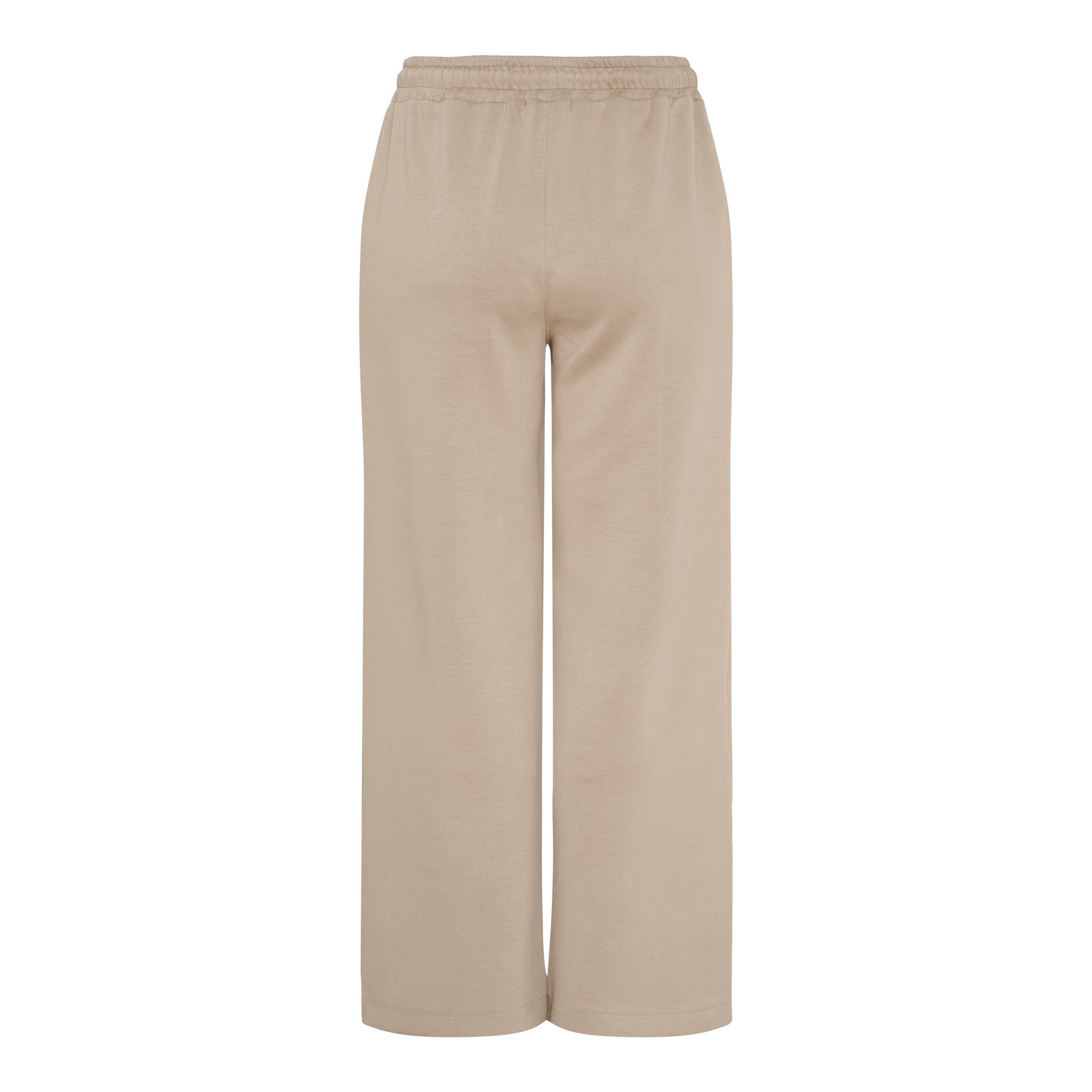 Designet er udført med elastisk talje og justerbar snøre, som sikrer en fleksibel og komfortabel pasform. De lige ben giver et rent og tidløst udtryk, mens den enkle finish gør bukserne nemme at kombinere med både strik, skjorter og bluser.
