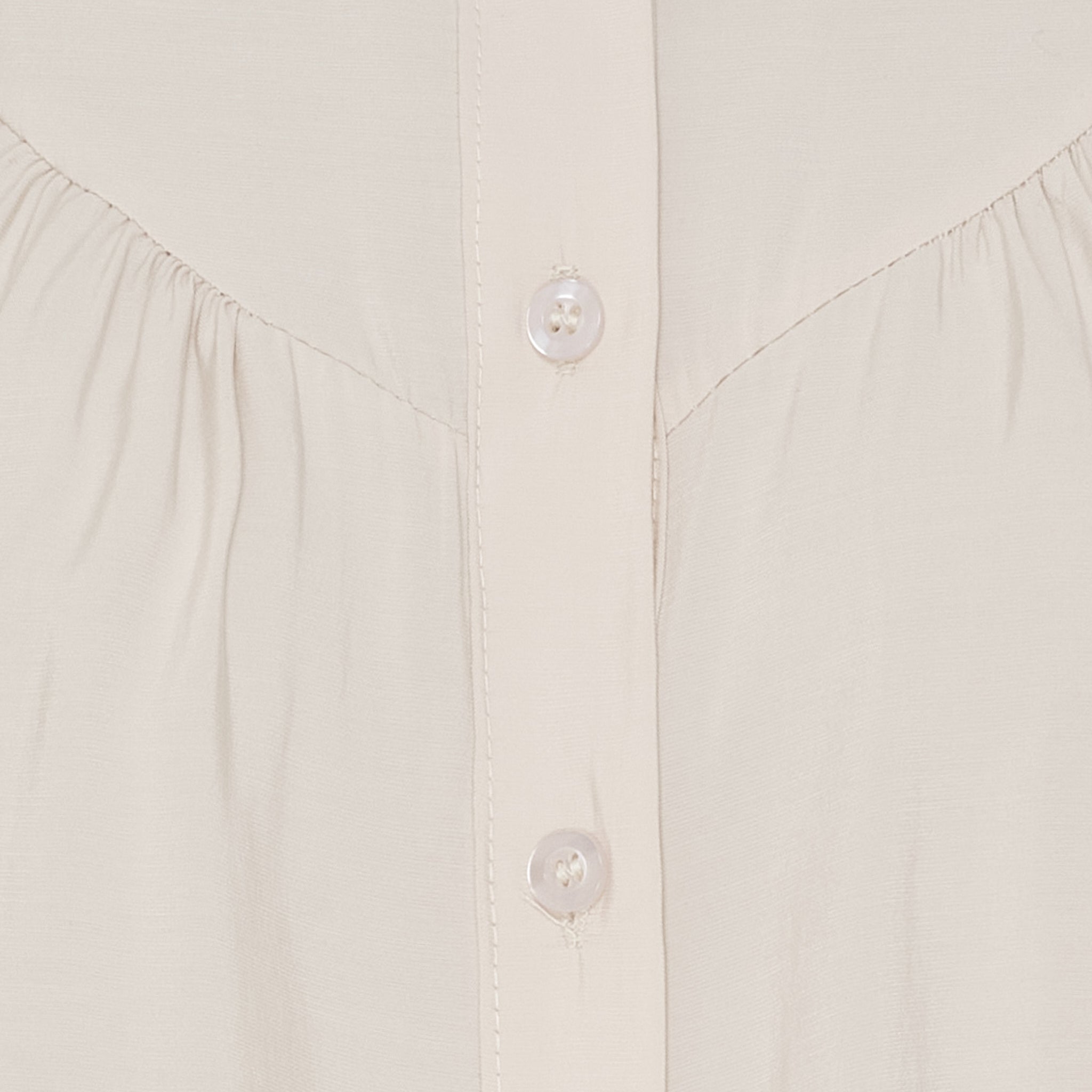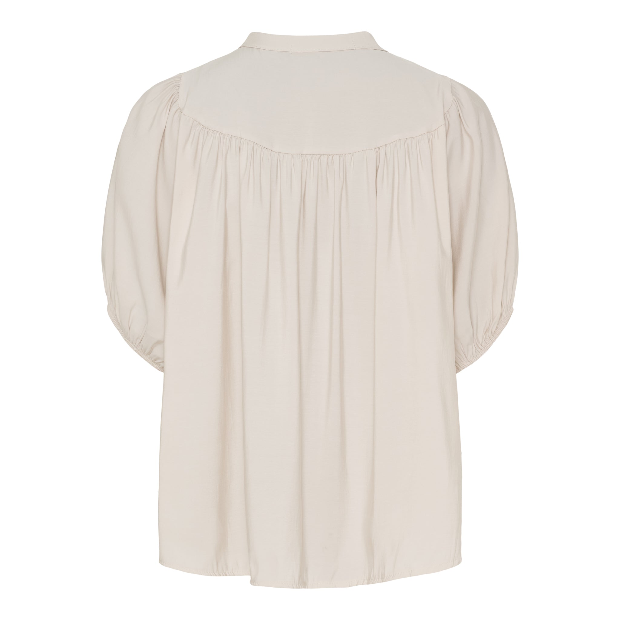 De korte ærmer har en blød puf-effekt, og den klassiske knaplukning foran fuldender det stilrene design med et strejf af vintage charme. Den runde halsudskæring og let A-formet pasform gør den behagelig at have på hele dagen.