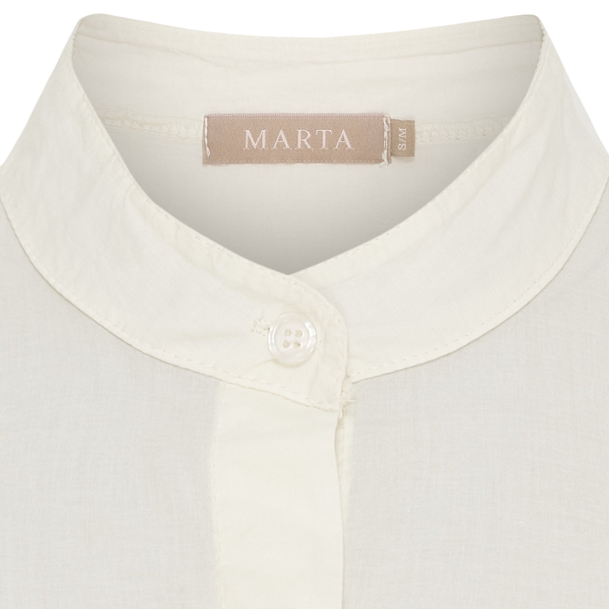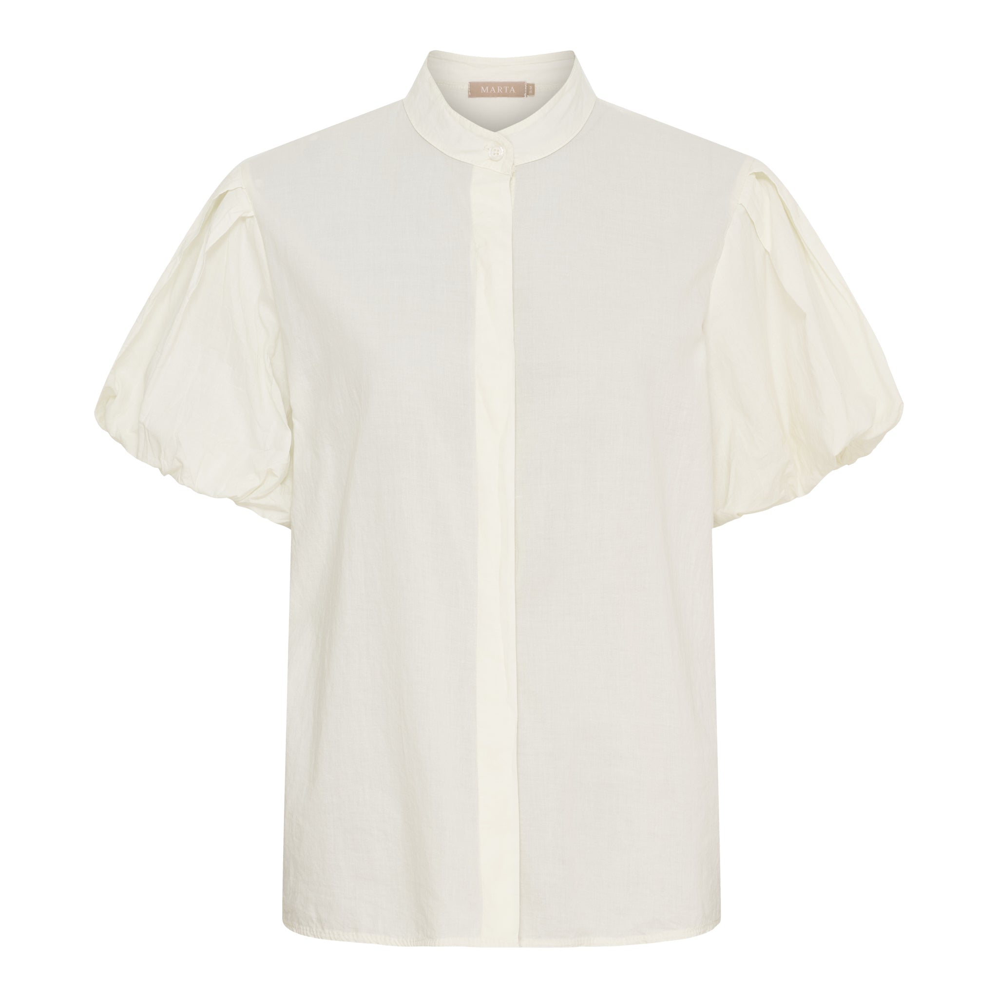Denne skjorte er essensen af moderne elegance med sit rene snit og iøjnefaldende puffærmer. Den høje krave og skjulte knaplukning giver et eksklusivt udtryk, mens det lette materiale gør den behagelig at have på hele dagen.