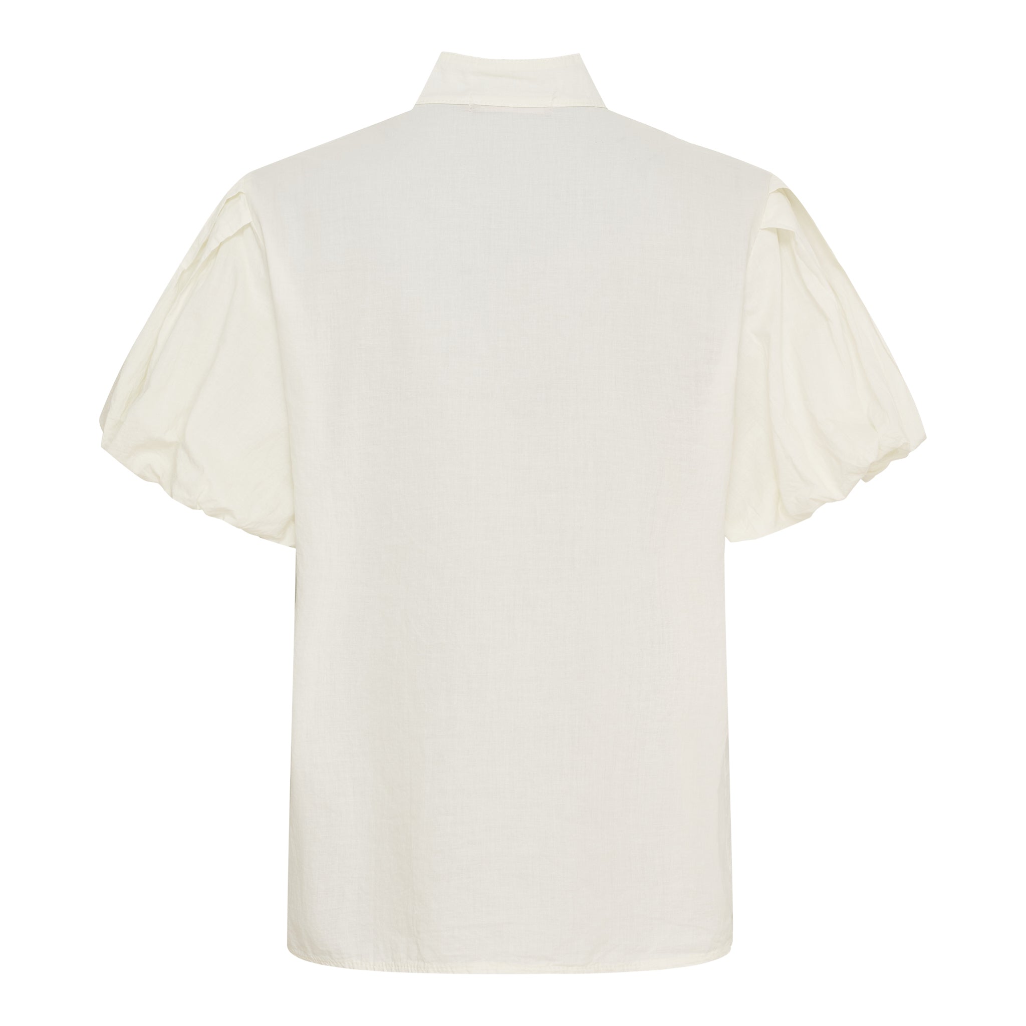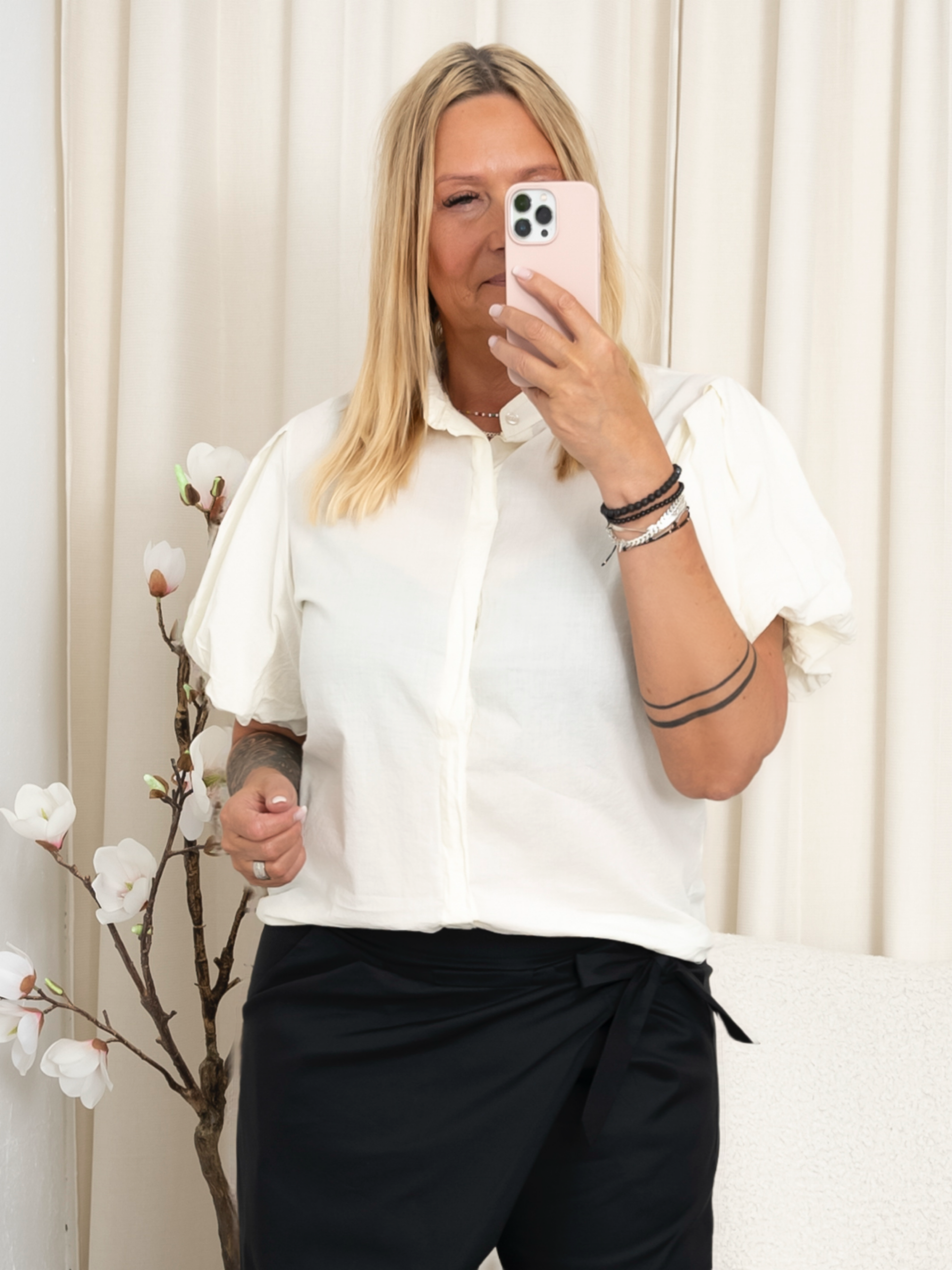De voluminøse ærmer skaber et smukt, feminint twist, som gør skjorten oplagt til både arbejde, middage og hyggelige cafébesøg.