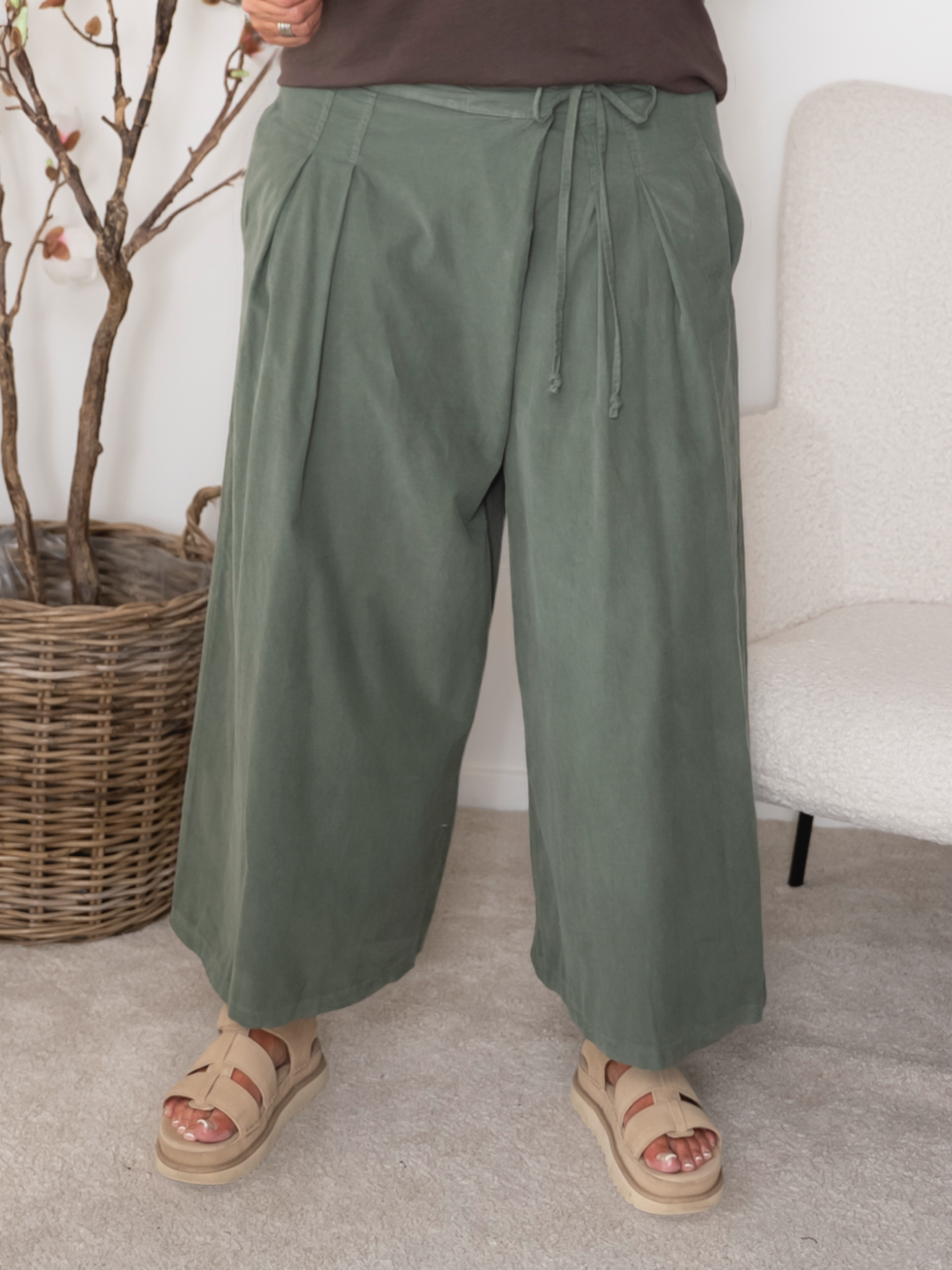 Disse vidde bukser kombinerer det bedste fra både stil og komfort. Med deres luftige snit, cropped længde og smukke slå-om effekt foran, får du en moderne og afslappet silhuet, der emmer af god stemning.