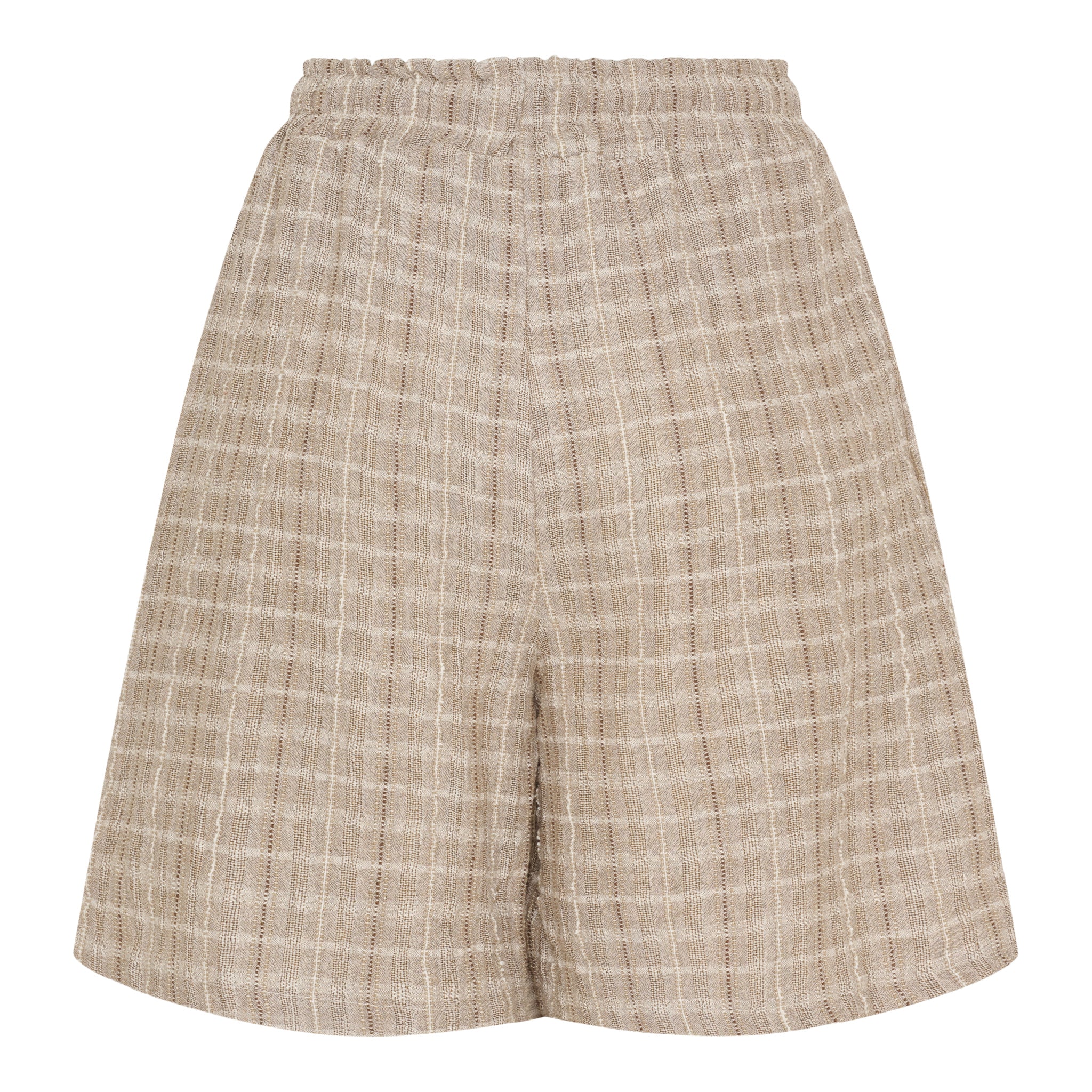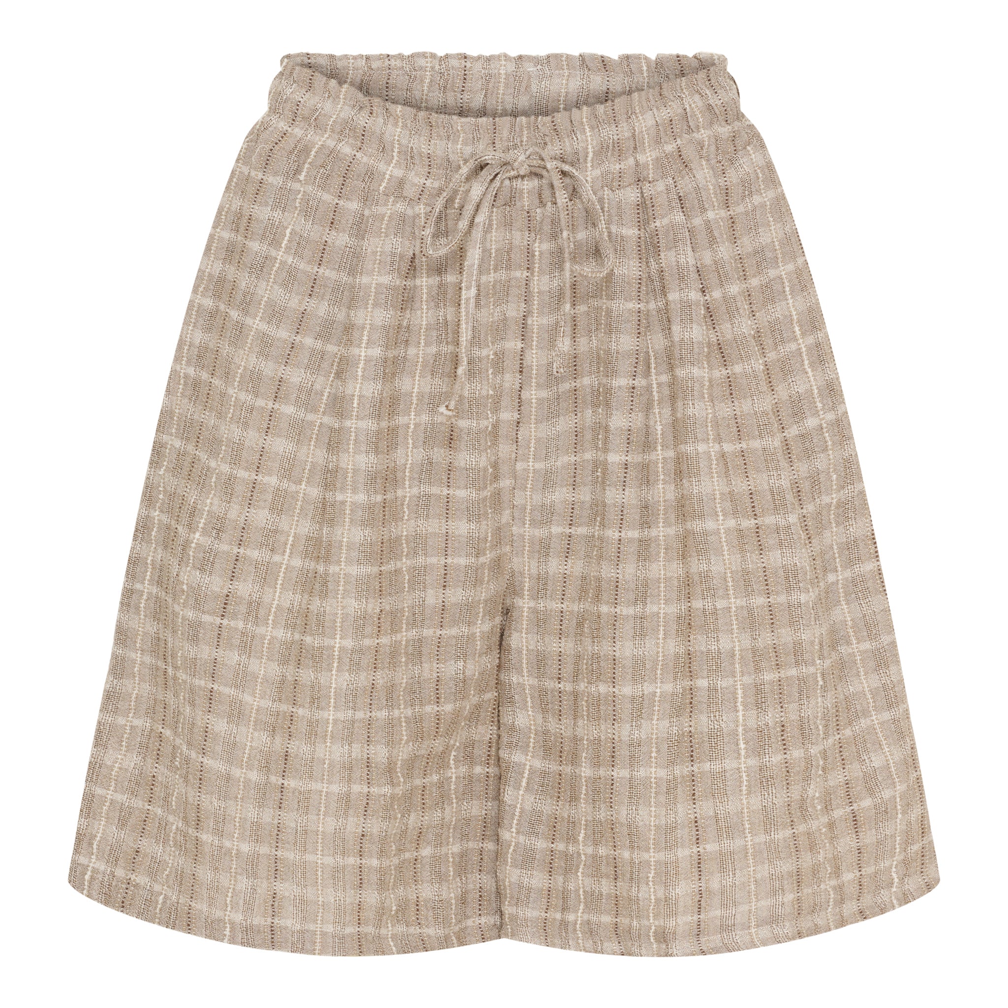 Disse bløde og luftige shorts er et must-have til sommergarderoben! Med deres afslappede pasform, elastiske talje og bindebånd får du både komfort og stil i ét og samme design. Den diskrete ternede struktur giver et moderne, naturligt udtryk, der passer perfekt til både hverdag og ferie.