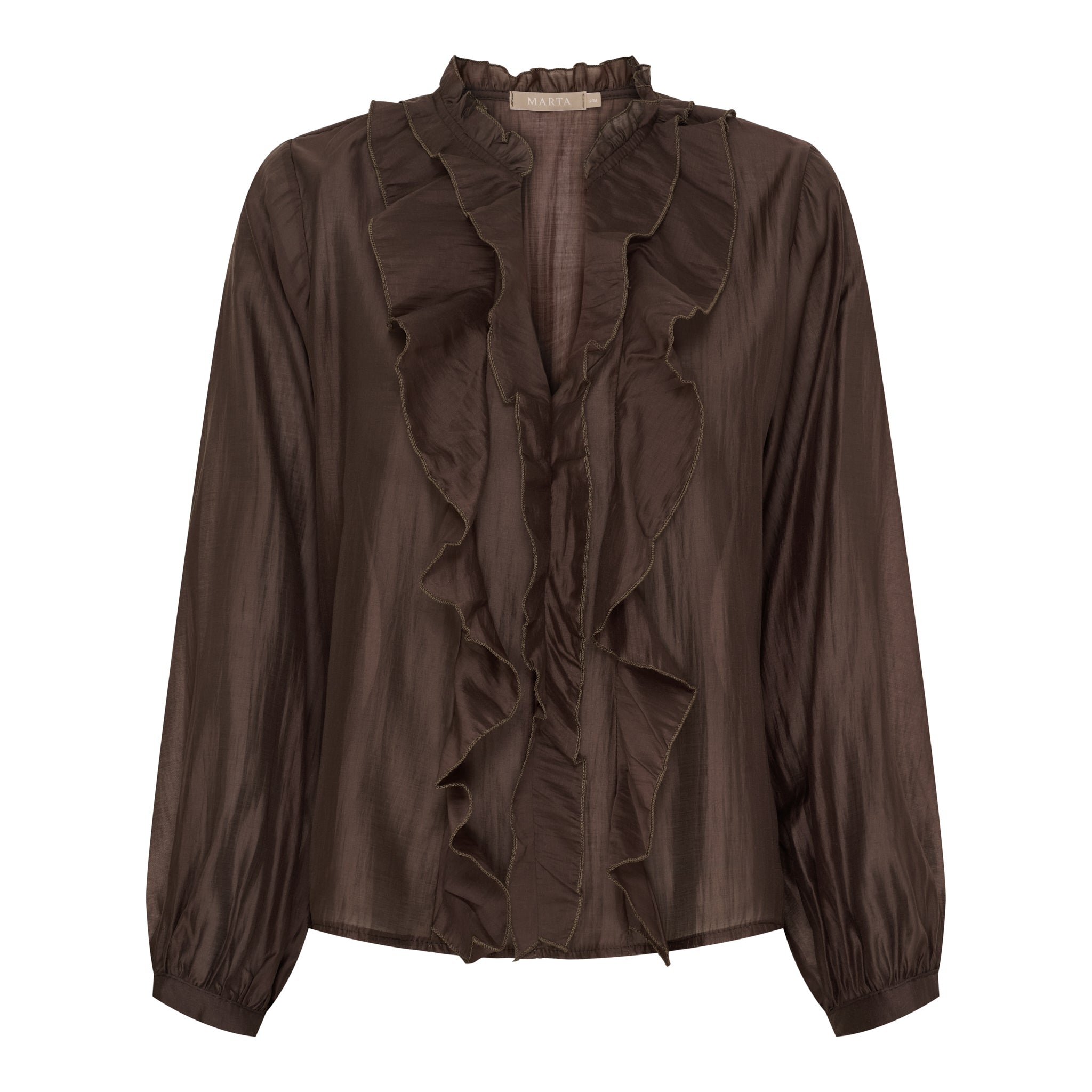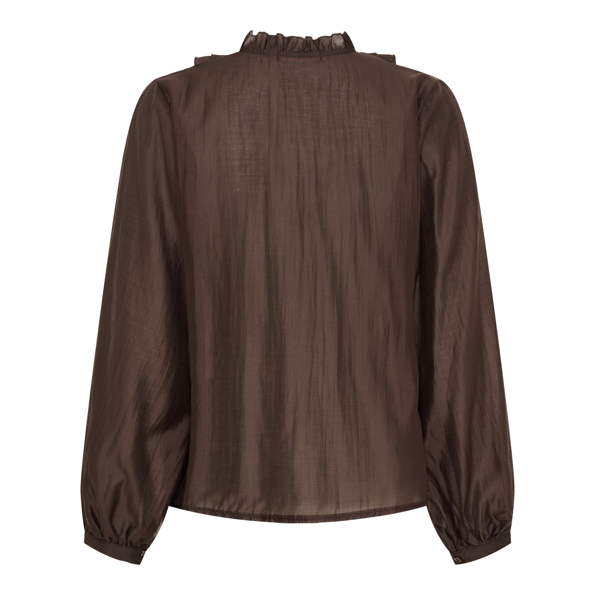 Blusen har en løs og komfortabel pasform med lange ærmer, der afsluttes med elastiske manchetter og diskrete flæser. Det gør den både behagelig at have på og let at style – både til hverdag og finere lejligheder.