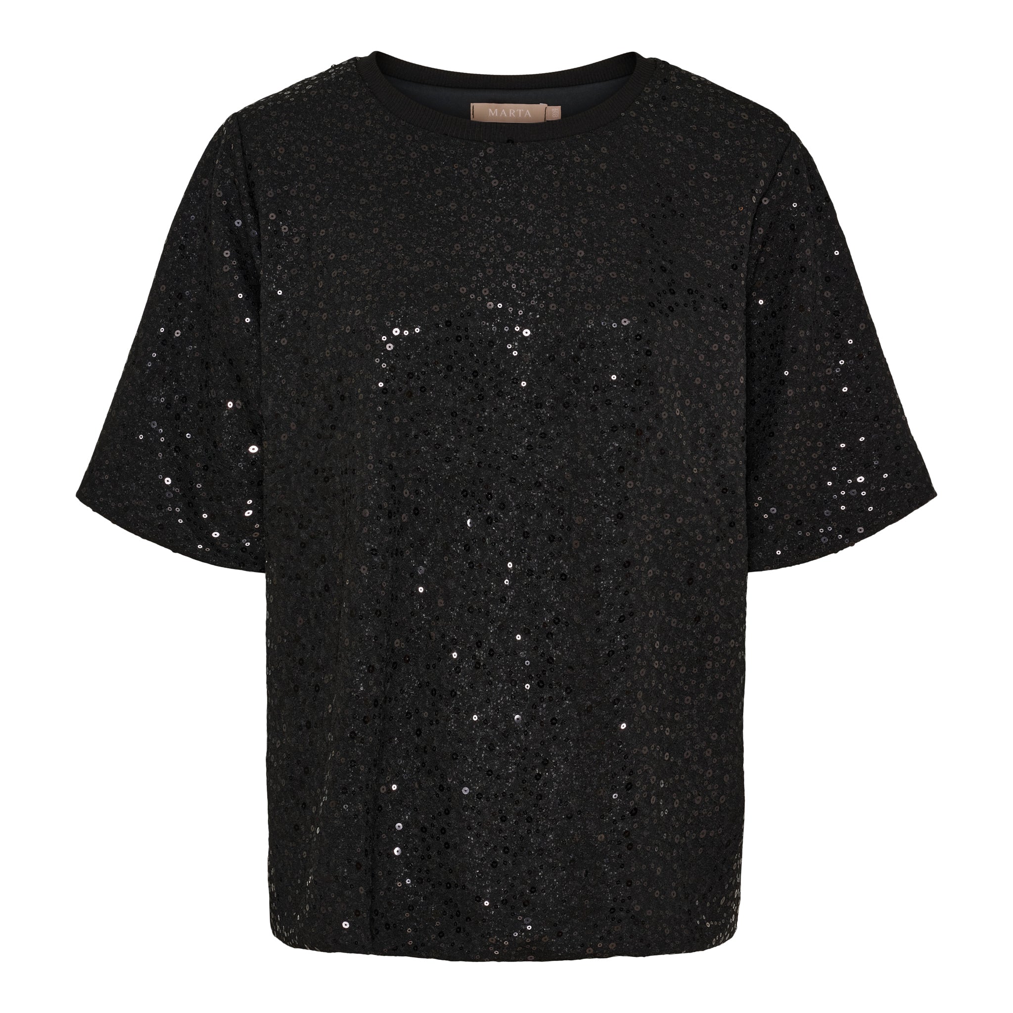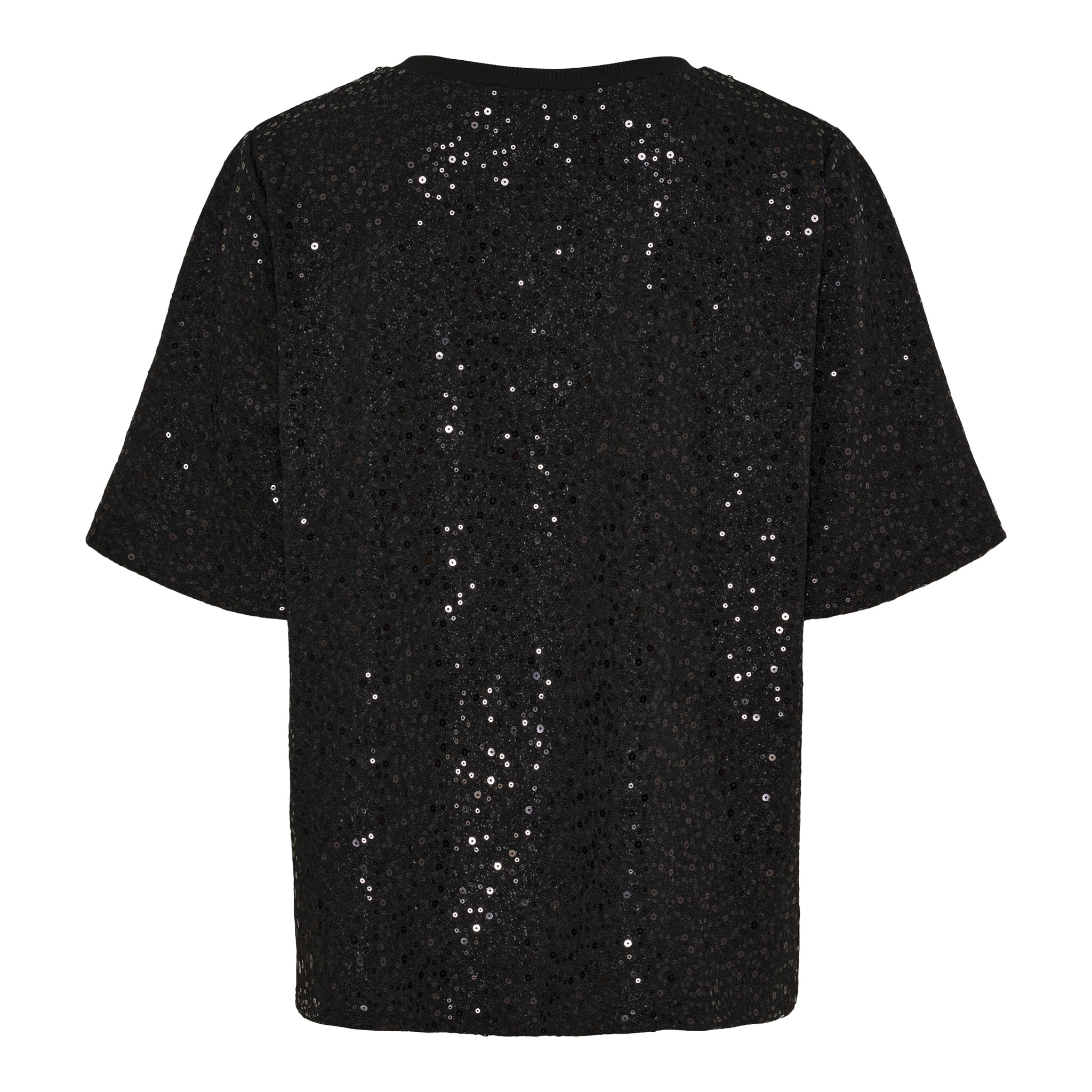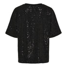 Den klassiske T-shirt-silhuet med rund hals og korte ærmer skaber en afslappet kontrast til det glitrende materiale, hvilket gør toppen nem at style med både jeans, skindbukser eller en elegant nederdel.