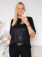 Denne top er et funklende statement-piece, der tilføjer øjeblikkelig glamour til ethvert outfit. Overfladen er dækket af tætte palietter, som fanger lyset og giver et levende, festligt udtryk – perfekt til både særlige anledninger og til at løfte hverdagslooket.