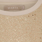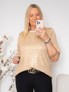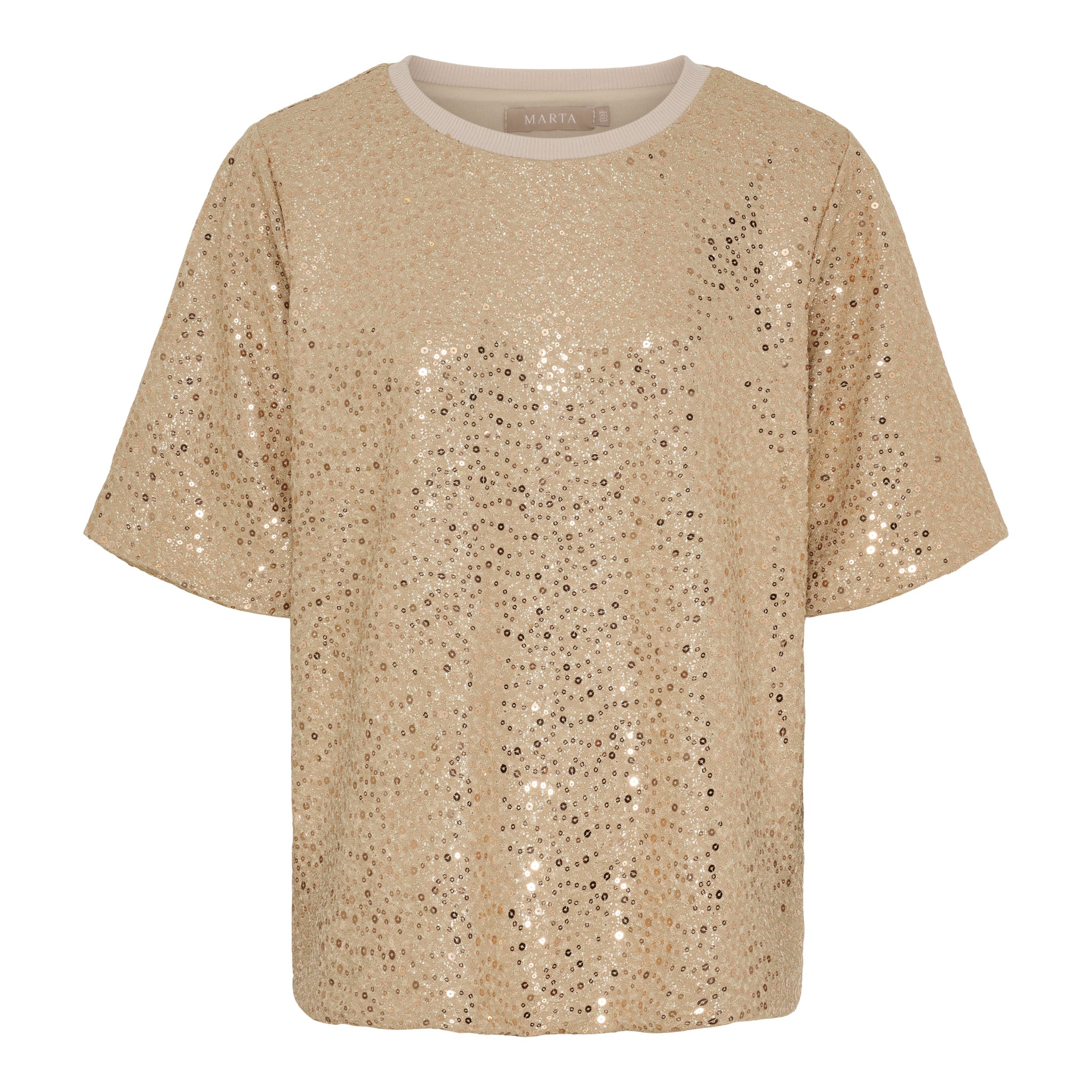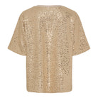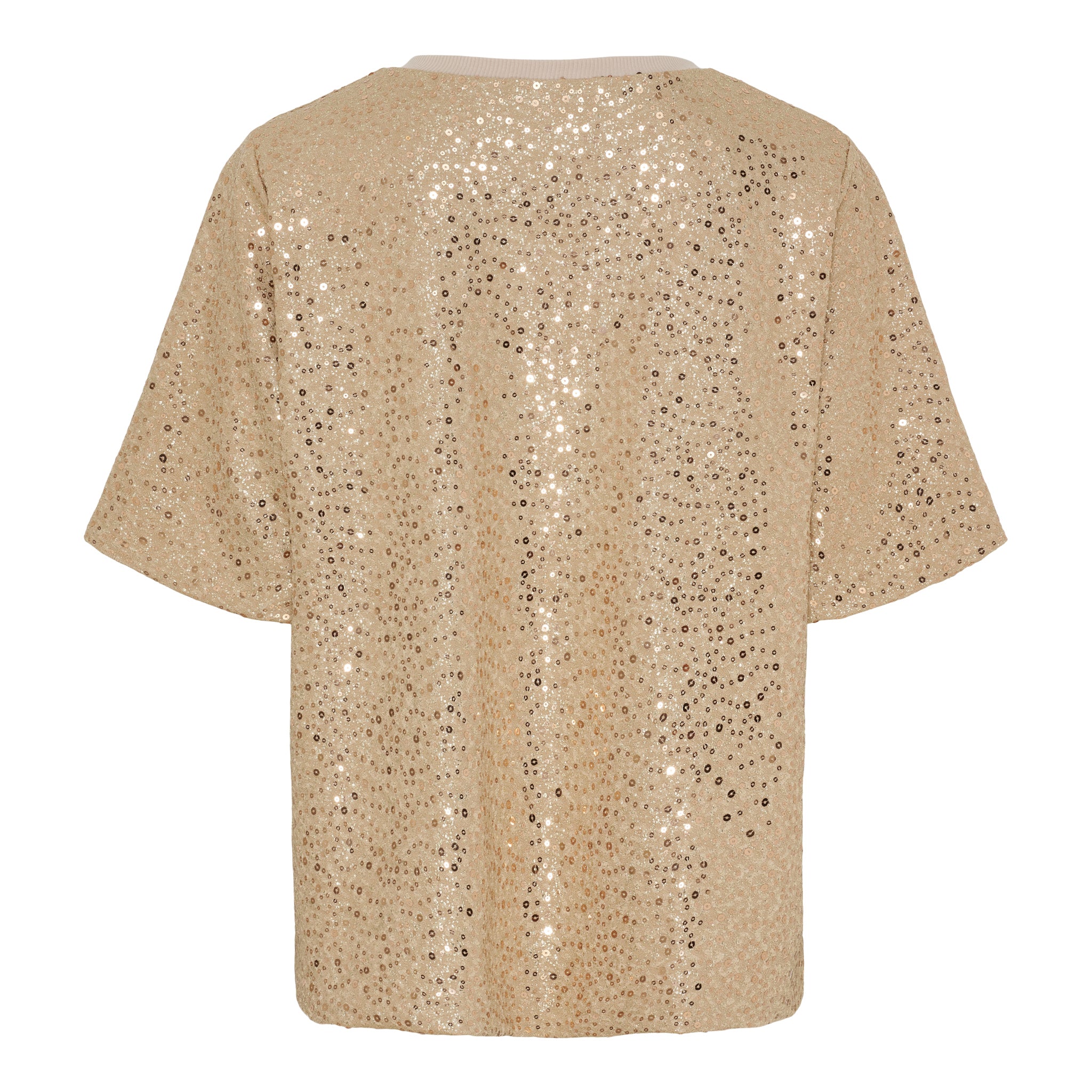 Den klassiske T-shirt-silhuet med rund hals og korte ærmer skaber en afslappet kontrast til det glitrende materiale, hvilket gør toppen nem at style med både jeans, skindbukser eller en elegant nederdel.