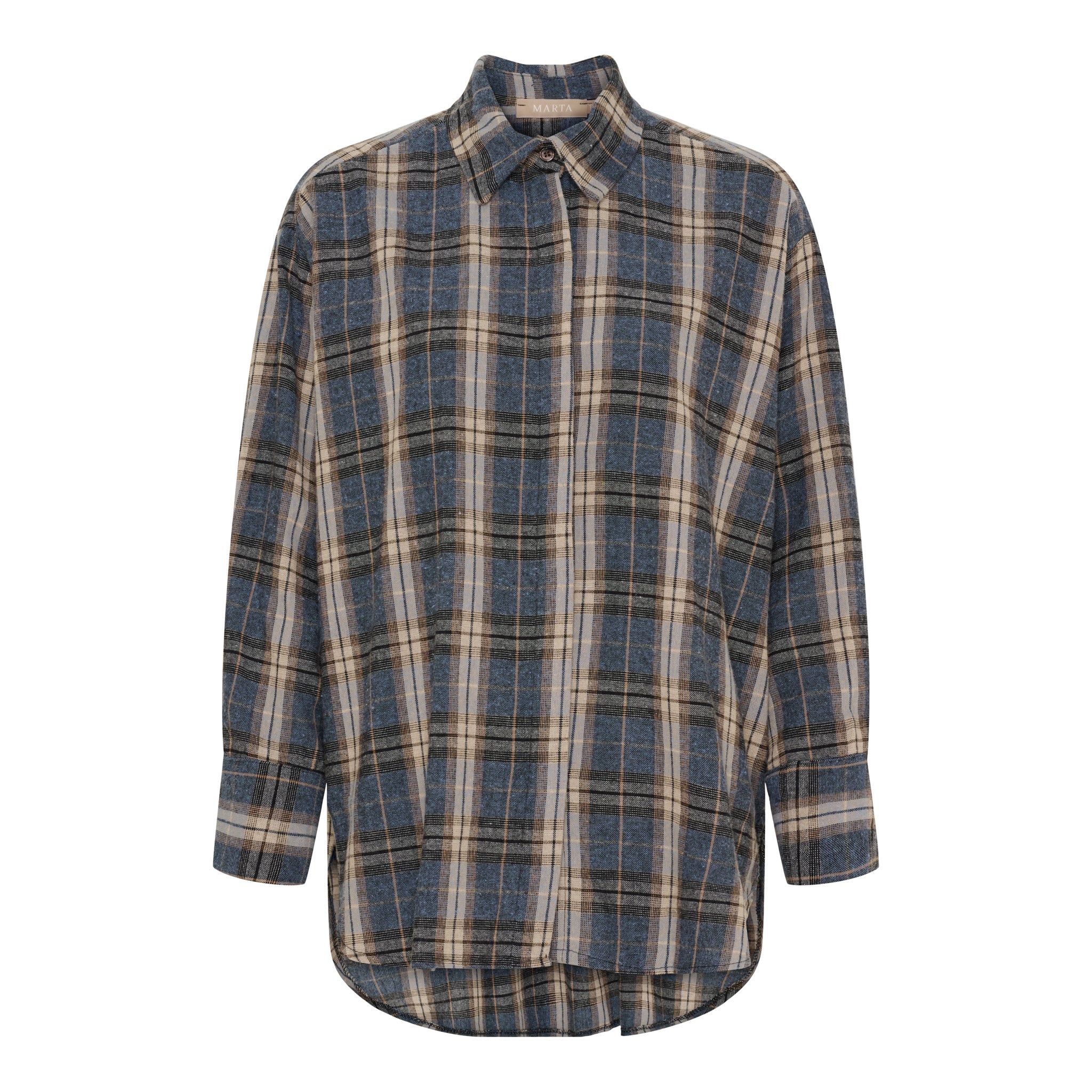 Pasformen er løs og lige, hvilket giver masser af bevægelighed og gør den nem at style både åben med en T-shirt under, eller lukket som en almindelig skjorte. Den har klassisk krave, knaplukning foran og lange ærmer med manchet.