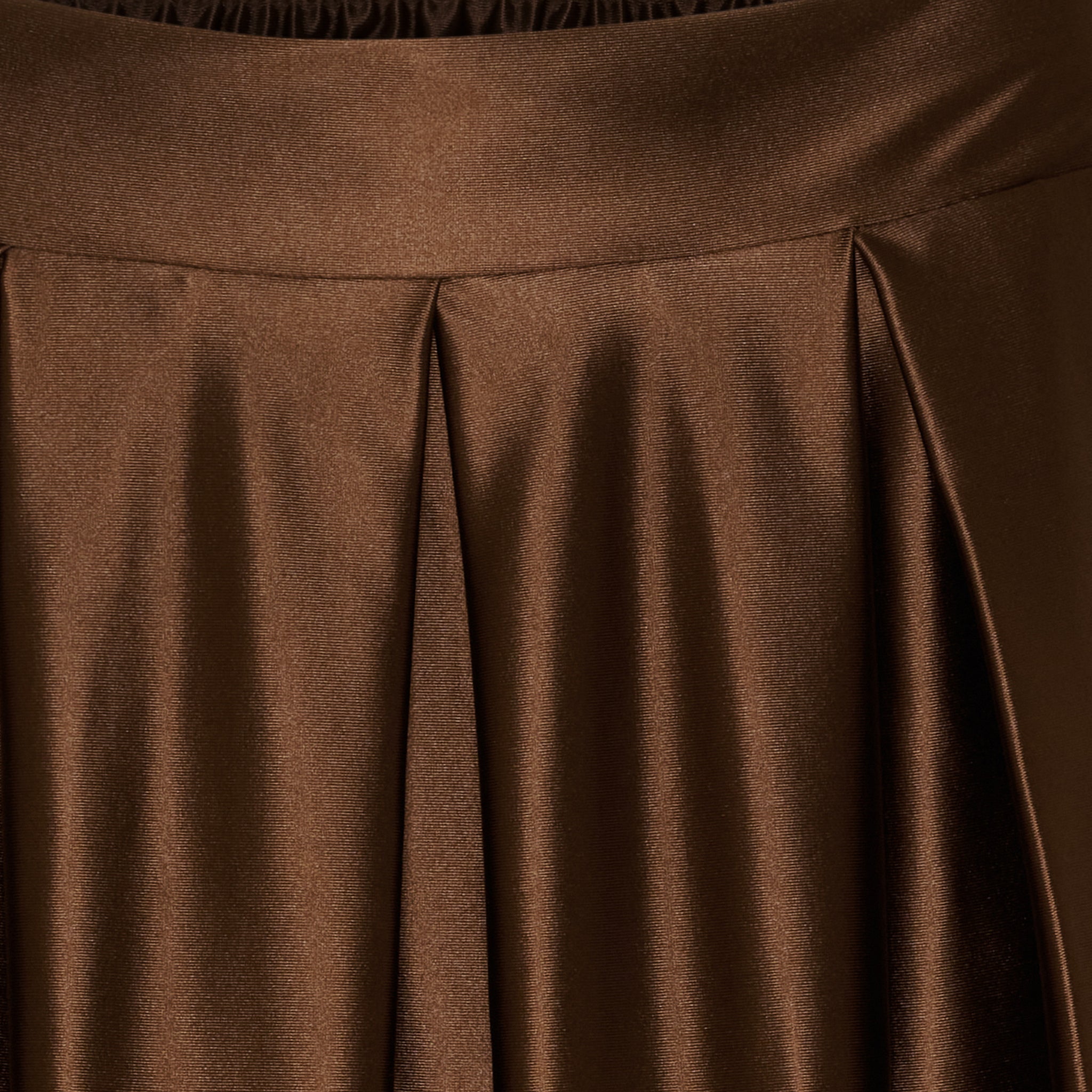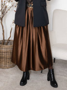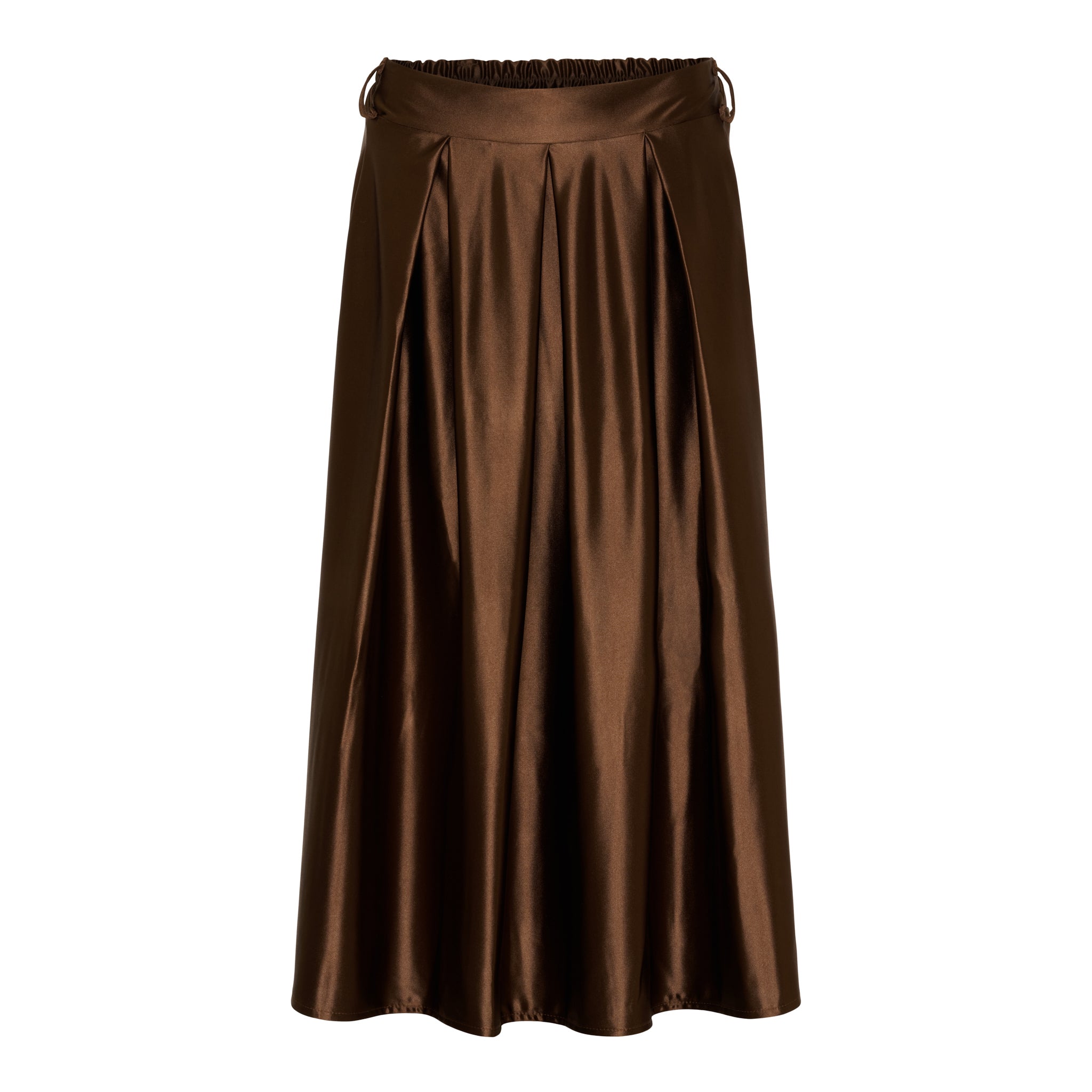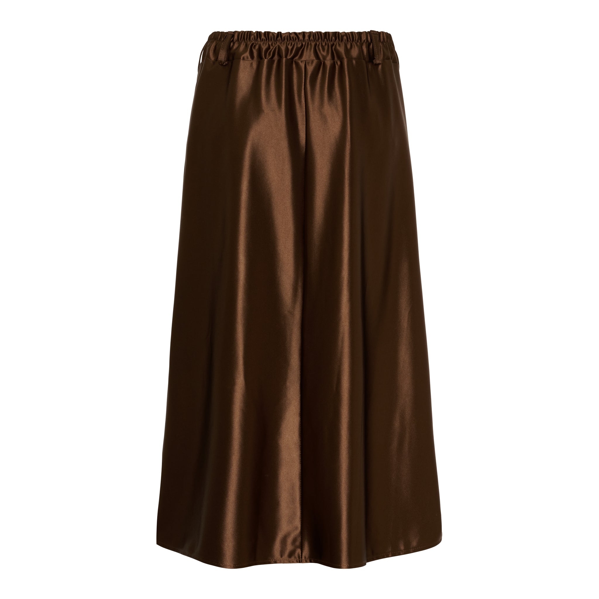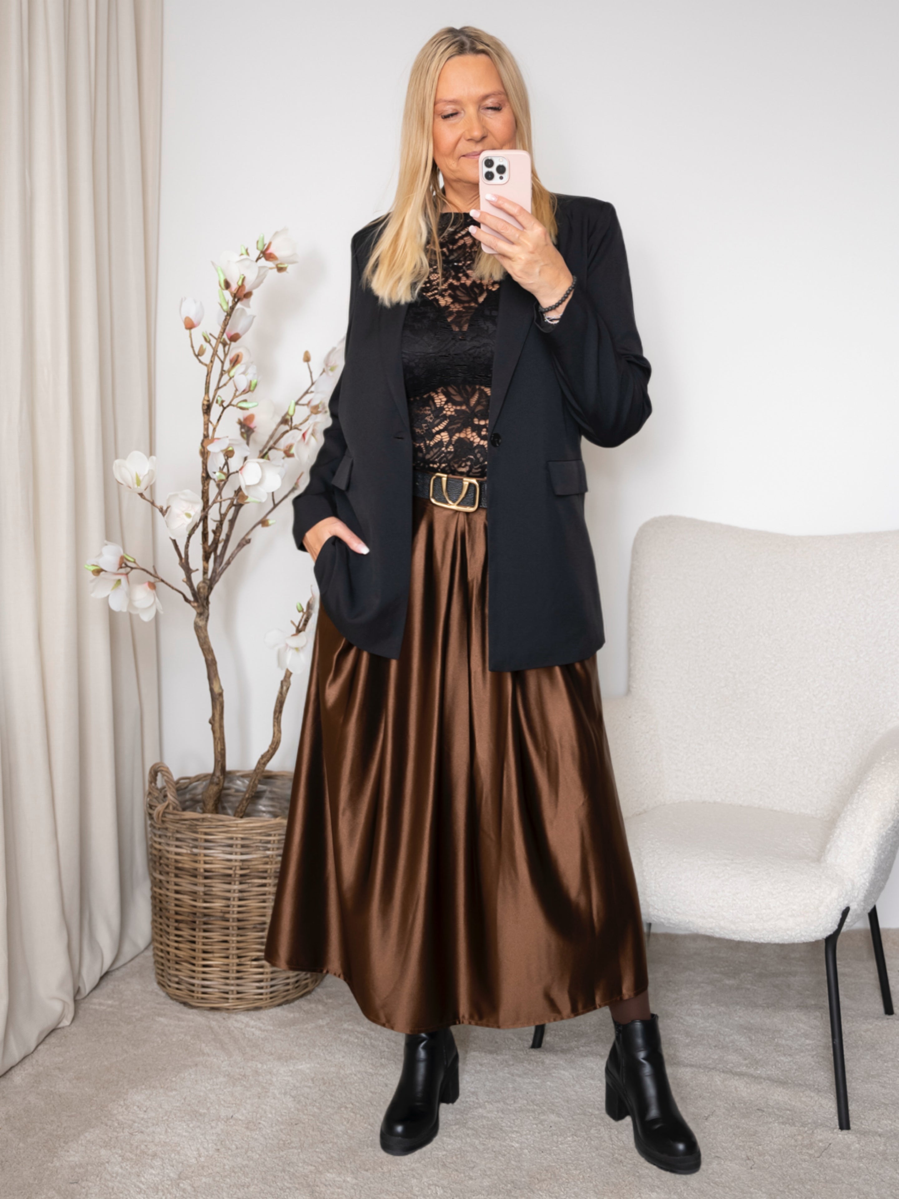 Denne skinnende midi-nederdel kombinerer elegance med komfort og tilføjer et raffineret touch til enhver garderobe. Det glansfulde materiale falder smukt og skaber et feminint udtryk, der er perfekt til både hverdagsbrug og særlige anledninger.