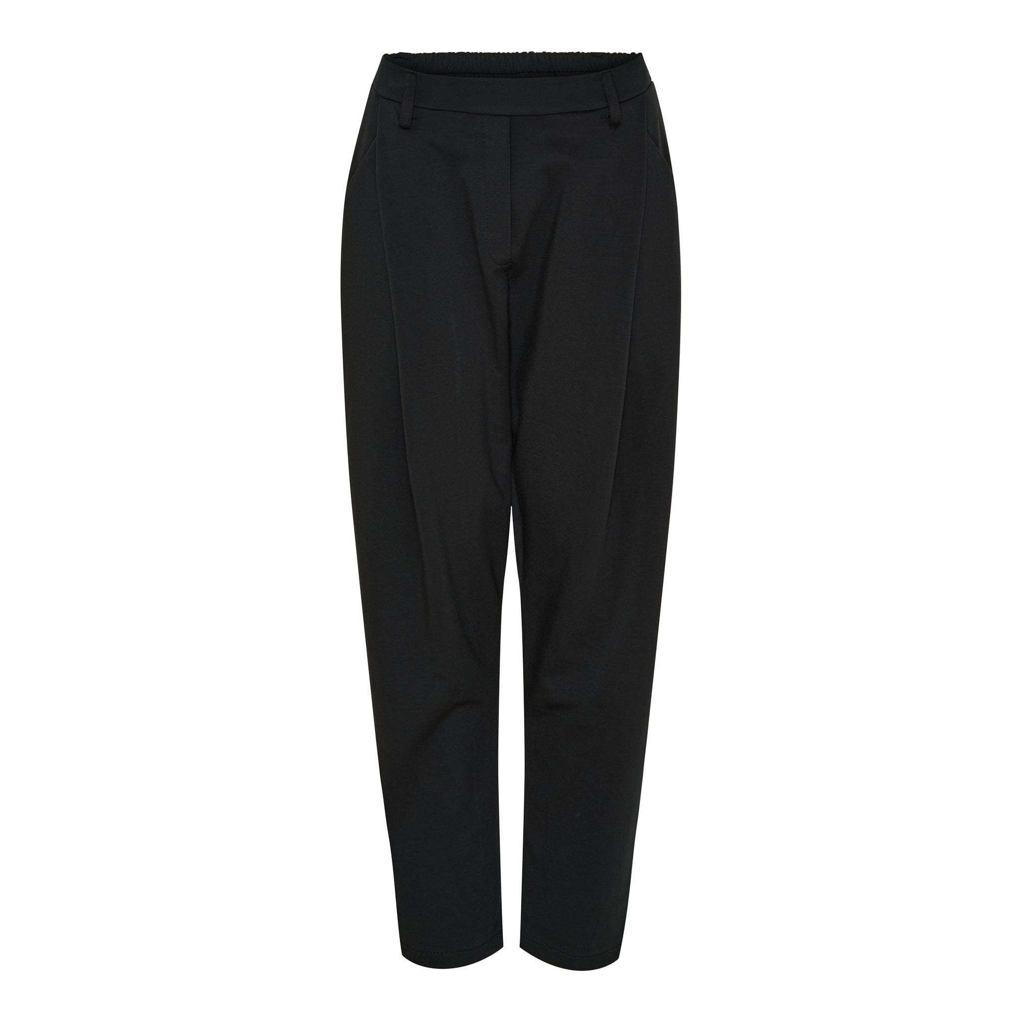 Bukserne har bæltestropper, to skrålommer foran og et flatterende frontpanel, der skaber et rent og moderne look. Den lette struktur i stoffet gør dem oplagte til både hverdag og pænere brug.
